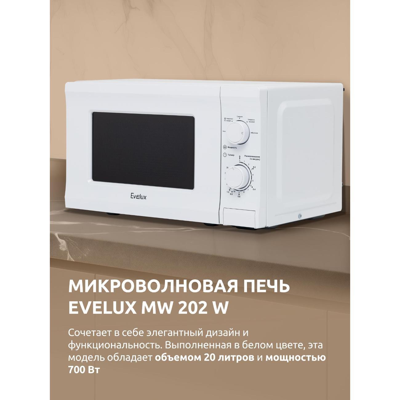 Вы можете купить Микроволновая печь соло Evelux mw 202 w в магазинах М.Видео по доступной цене. Микроволновая печь соло Evelux mw 202 w: подробное описание, фото и отзывы реальных покупателей, характеристики, возможность скачать инструкции и подобрать аксессуары.