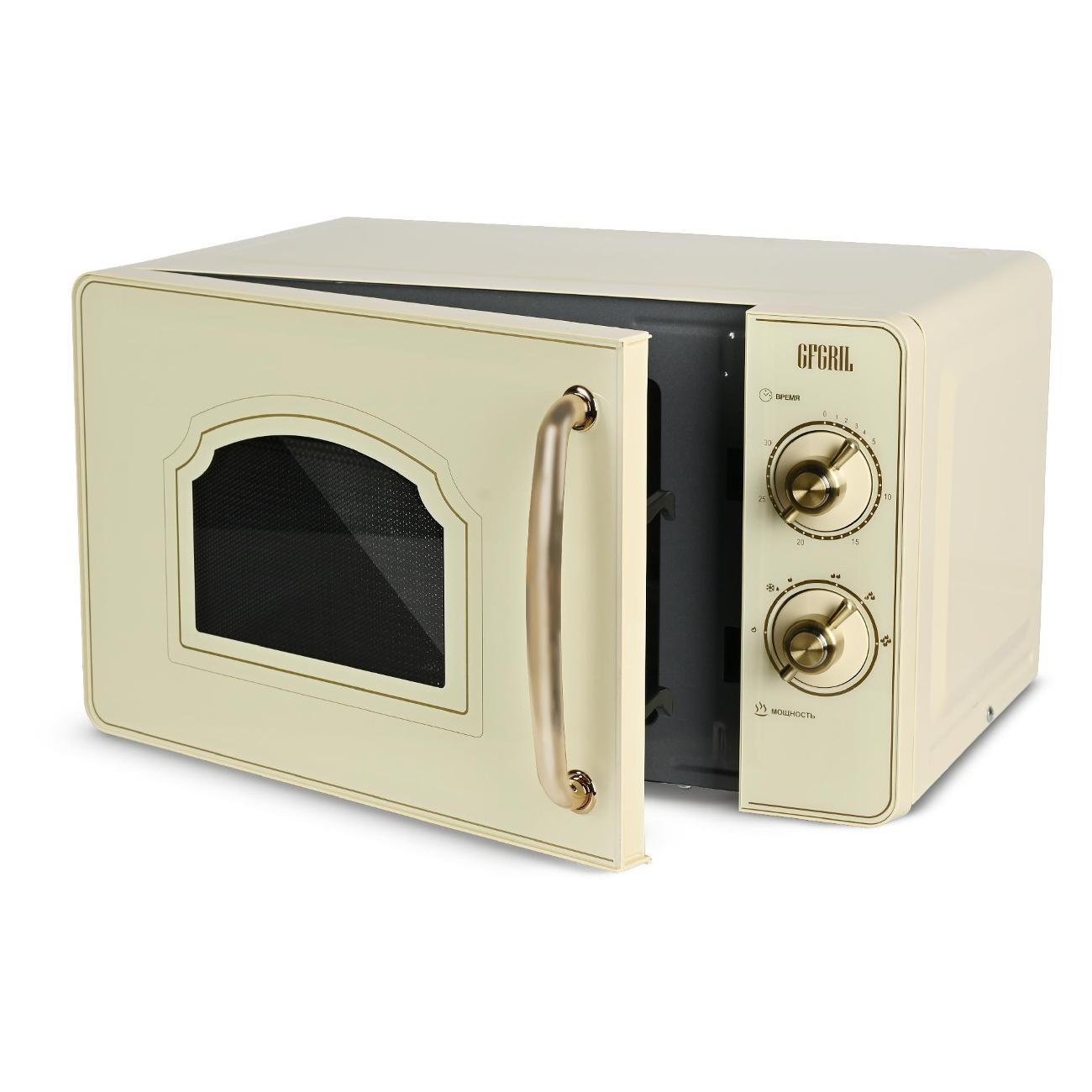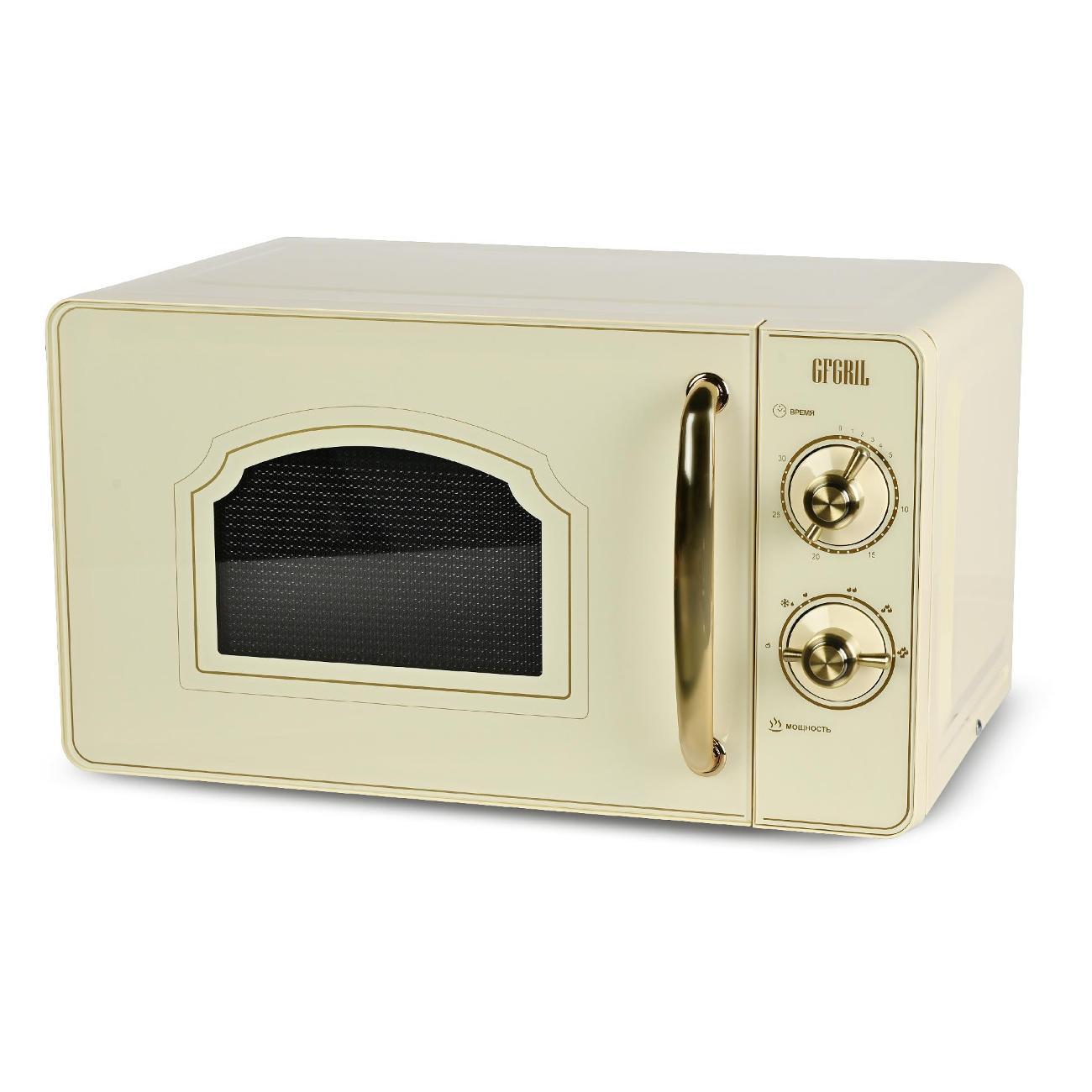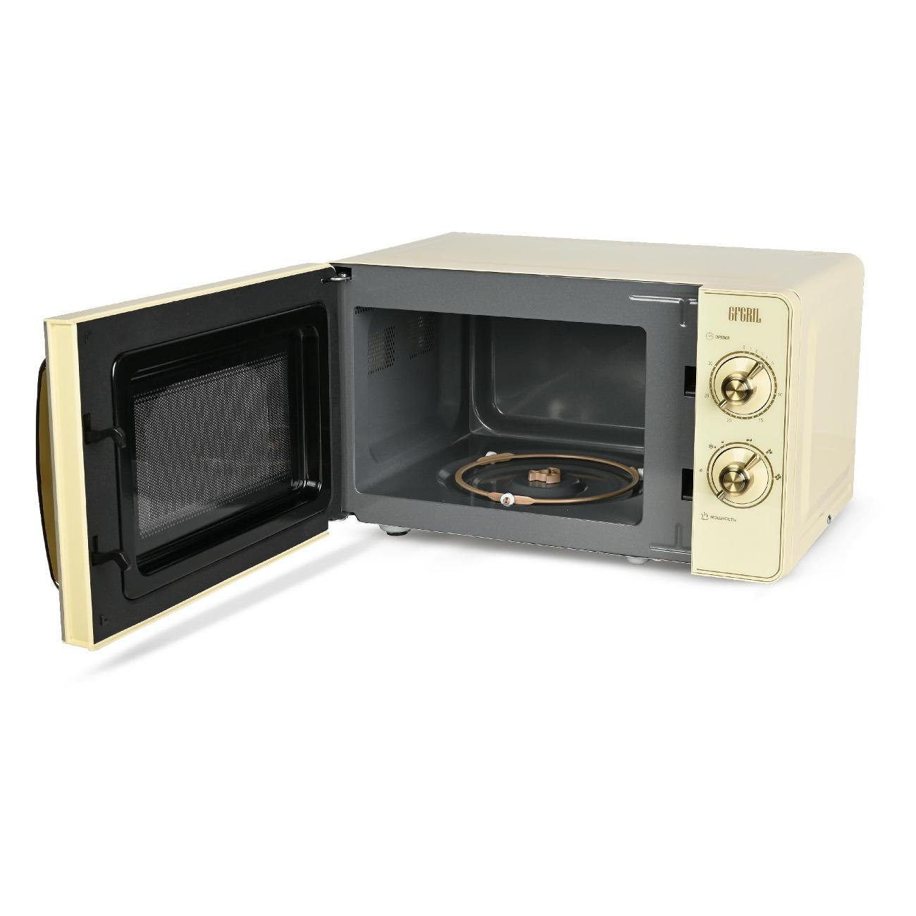Микроволновая печь соло Gfgril GF-MWO202-Beige — модель, оснащенная шестью автоматическими программами и режимом размораживания. Управление механическое, удобное и простое. Фронтальная панель выполнена из металла и пластика. Дверца открывается налево при помощи ручки. Поворотный стол диаметром 24,5 см изготовлен из прочного пластика. Установлена индикация включения и времени до конца программы. В наличии встроенный таймер. Внутреннее покрытие выполнено из эмали, что придает ему повышенную устойчивость к механическому воздействию и упрощает уход.