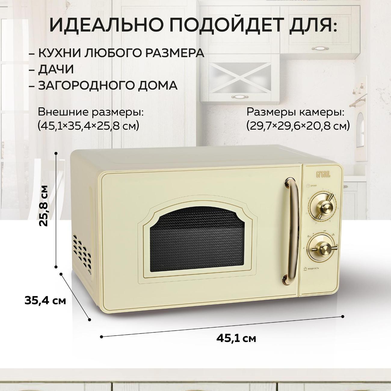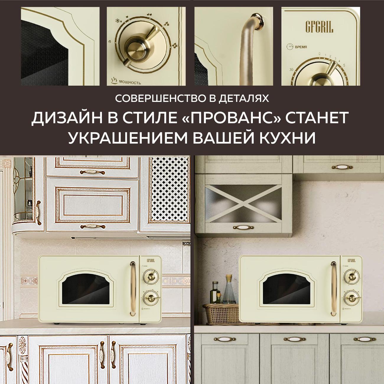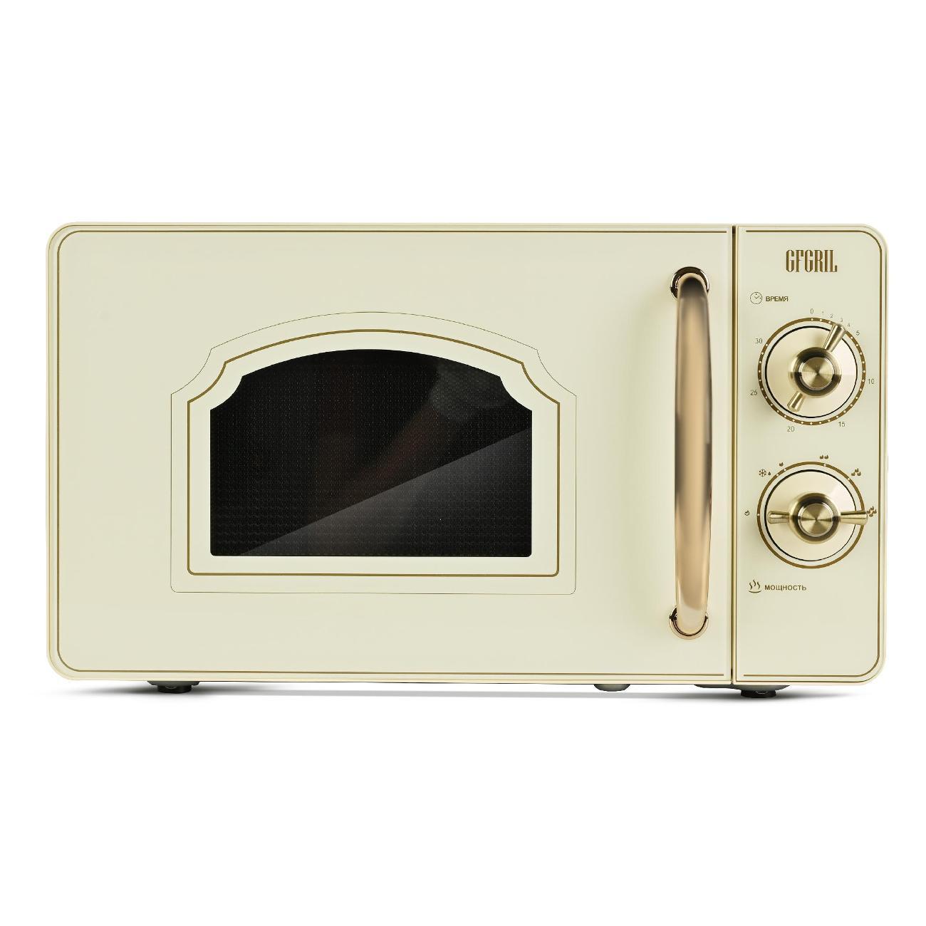 Микроволновая печь соло Gfgril GF-MWO202-Beige — модель, оснащенная шестью автоматическими программами и режимом размораживания. Управление механическое, удобное и простое. Фронтальная панель выполнена из металла и пластика. Дверца открывается налево при помощи ручки. Поворотный стол диаметром 24,5 см изготовлен из прочного пластика. Установлена индикация включения и времени до конца программы. В наличии встроенный таймер. Внутреннее покрытие выполнено из эмали, что придает ему повышенную устойчивость к механическому воздействию и упрощает уход.