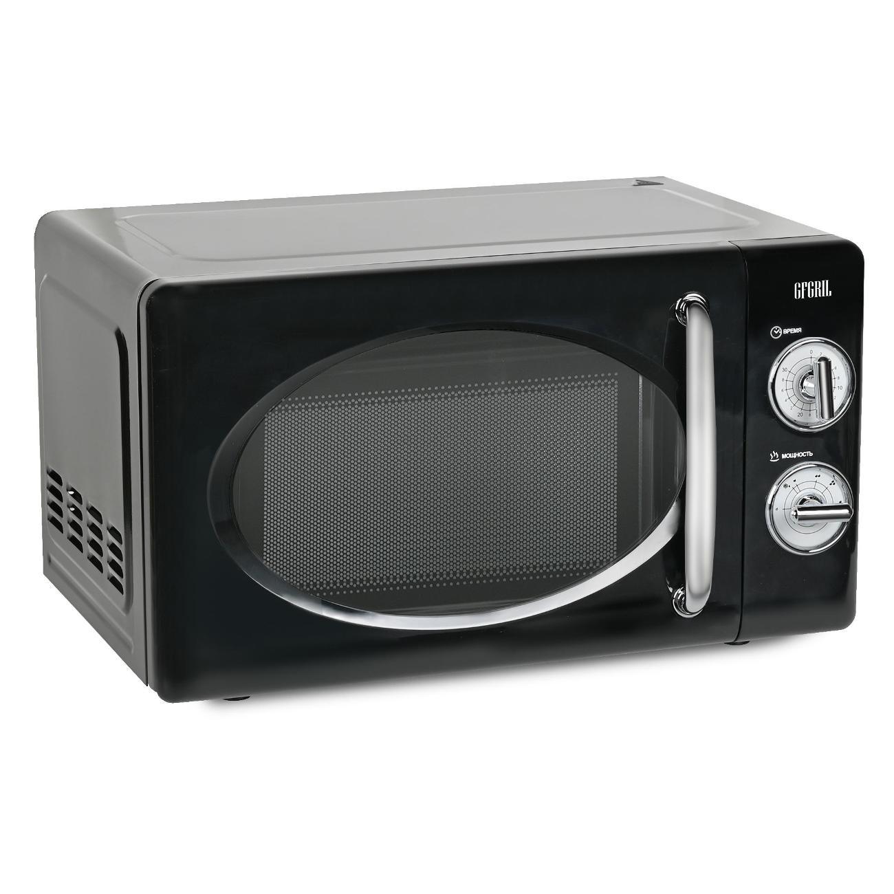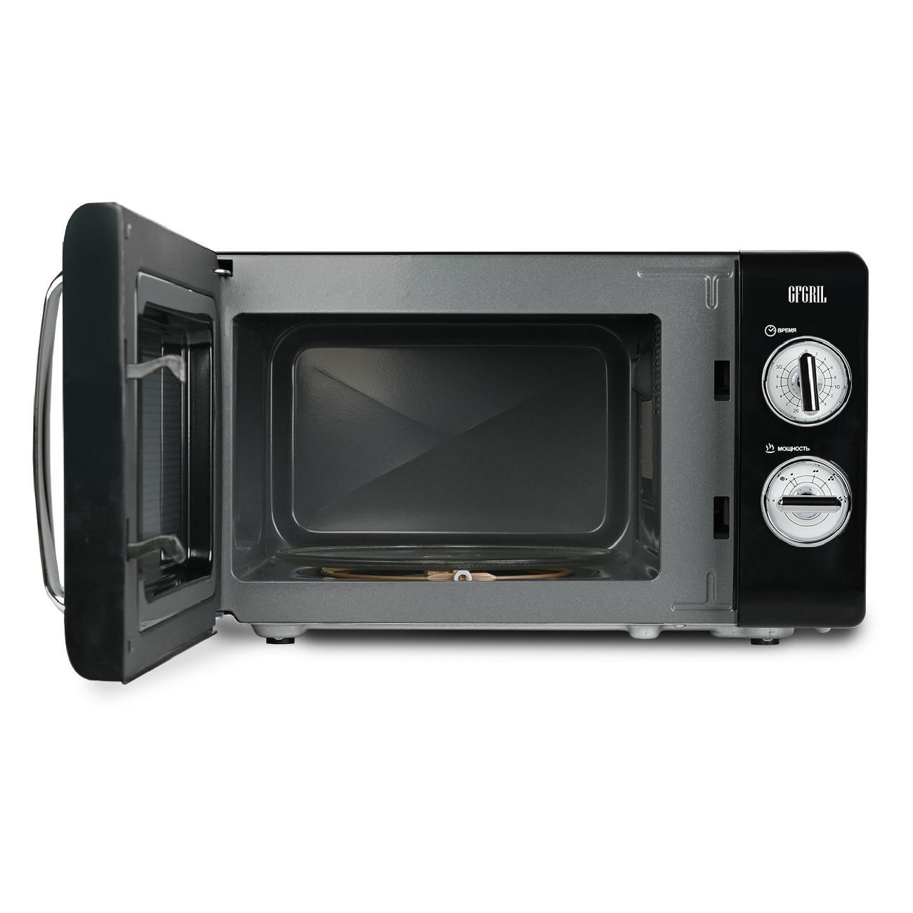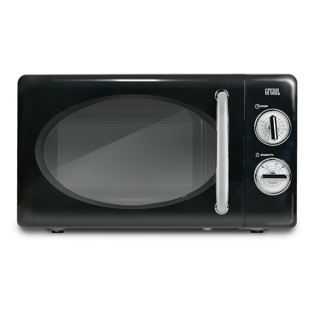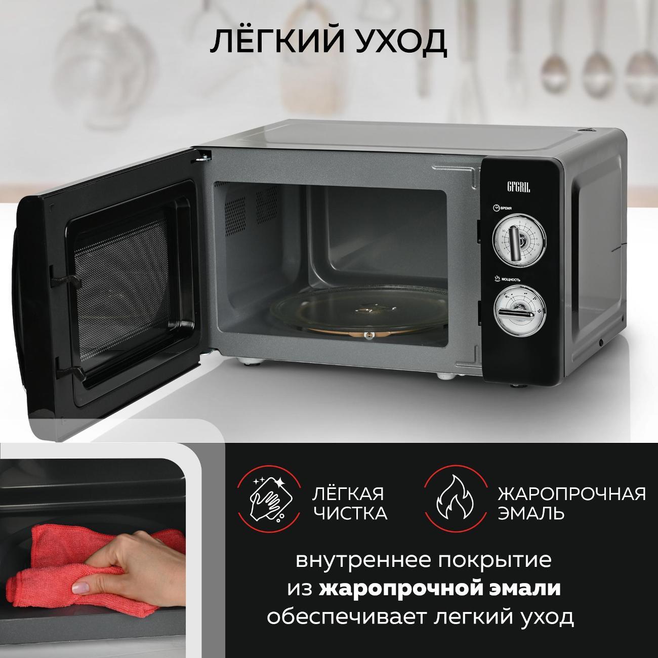 Микроволновая печь соло Gfgril GF-MWO203-Black — устройство компактных размеров (25,8х34,6х45,1 см), потребляемая мощность которого не превышает 700 Вт. Вес модели равен 10 кг. Полезный объем не превышает 20 л. Установлен таймер, который позволяет настроить время работы устройства. Функциональные возможности этой микроволной печи позволяют использовать ее для быстрого приготовления и подогрева различных блюд, напитков, размораживания полуфабрикатов, мясных изделий. Эмалевое покрытие внутренней камеры устойчиво к появлению царапин, легко очищается от загрязнений и не впитывает запахи.