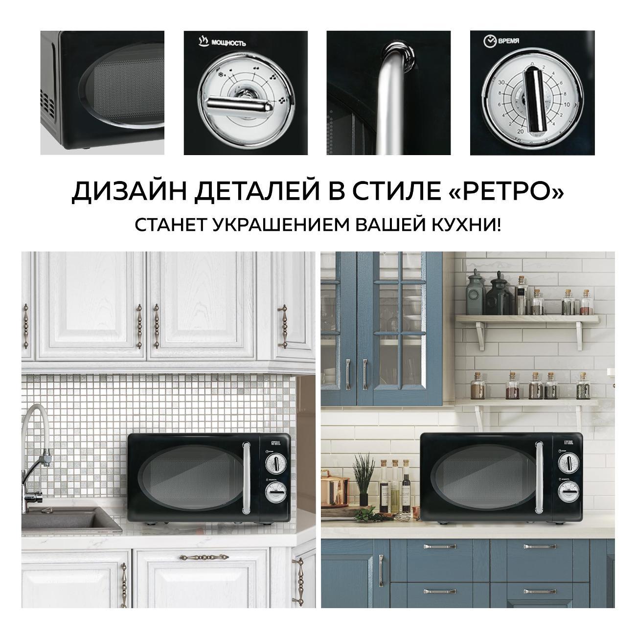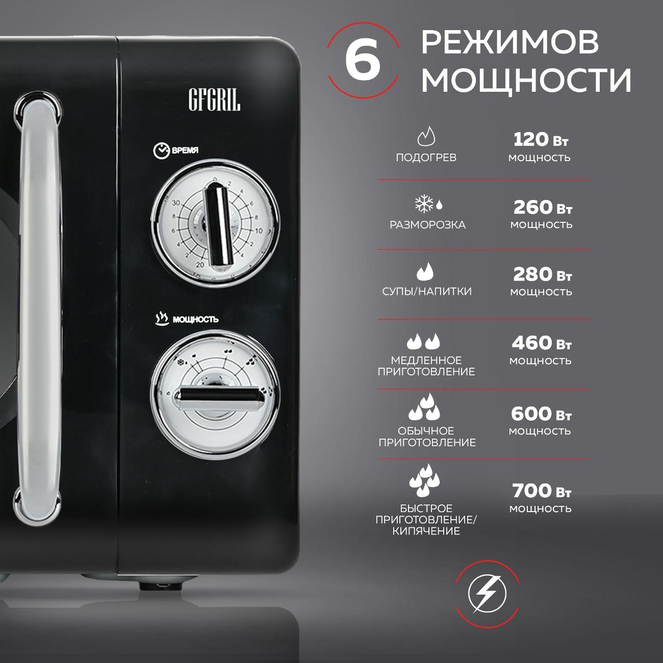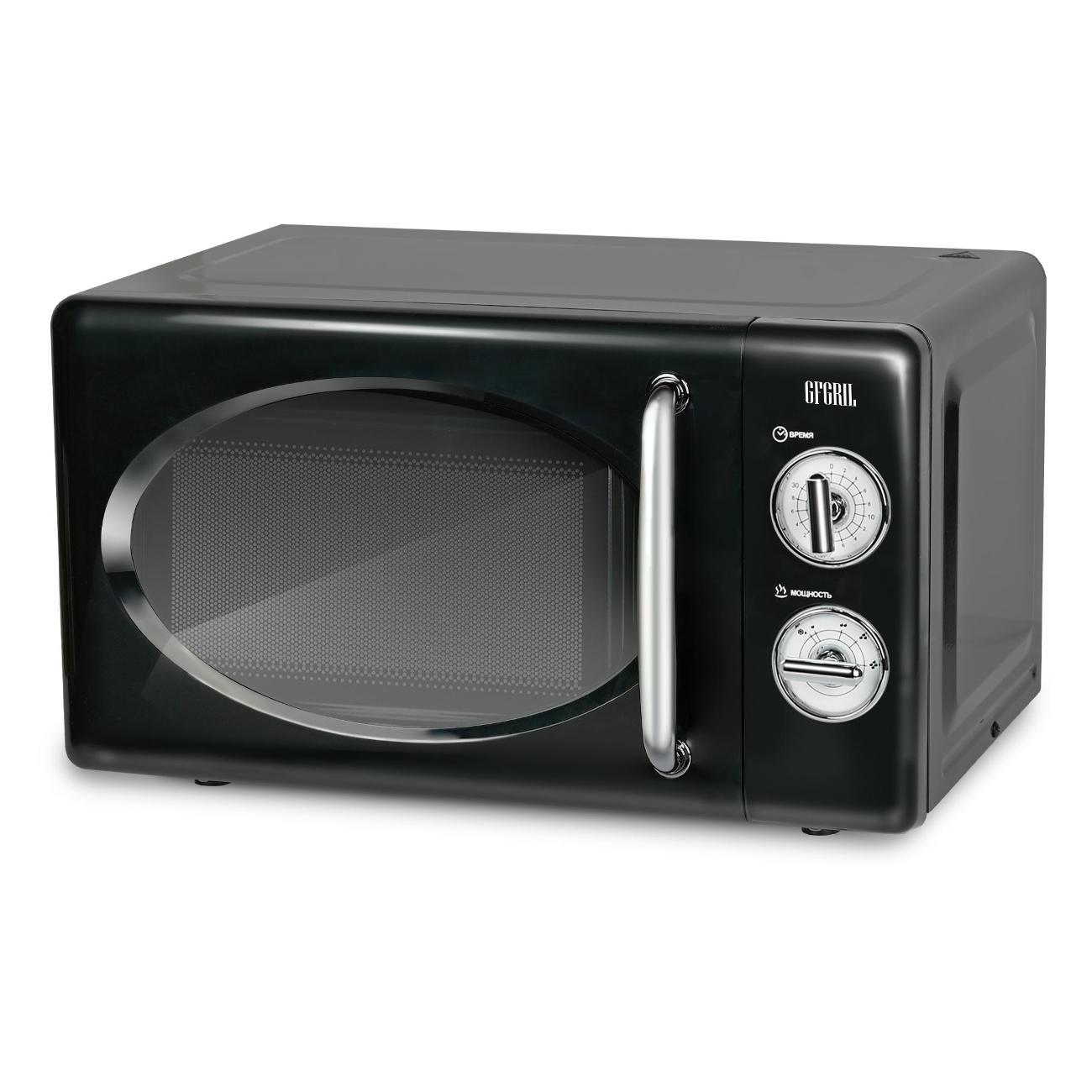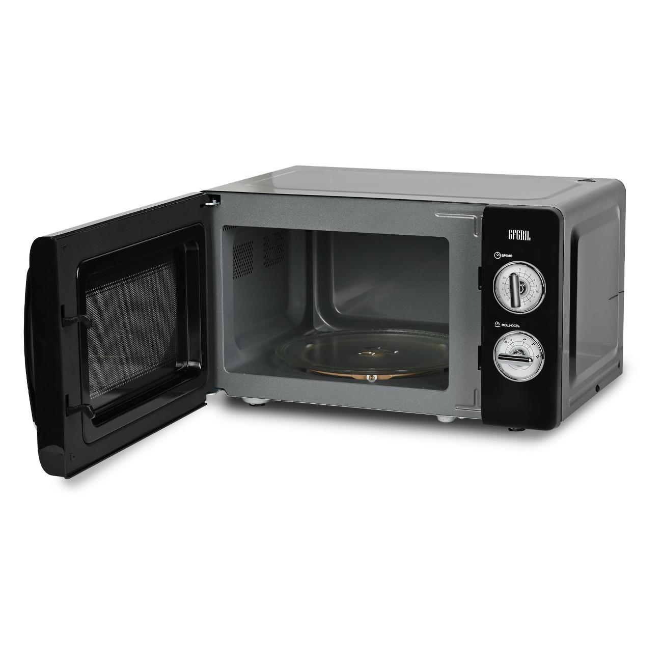Микроволновая печь соло Gfgril GF-MWO203-Black — устройство компактных размеров (25,8х34,6х45,1 см), потребляемая мощность которого не превышает 700 Вт. Вес модели равен 10 кг. Полезный объем не превышает 20 л. Установлен таймер, который позволяет настроить время работы устройства. Функциональные возможности этой микроволной печи позволяют использовать ее для быстрого приготовления и подогрева различных блюд, напитков, размораживания полуфабрикатов, мясных изделий. Эмалевое покрытие внутренней камеры устойчиво к появлению царапин, легко очищается от загрязнений и не впитывает запахи.