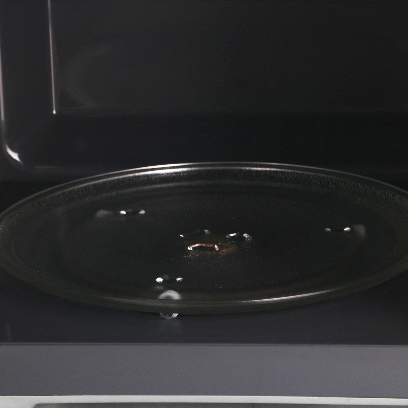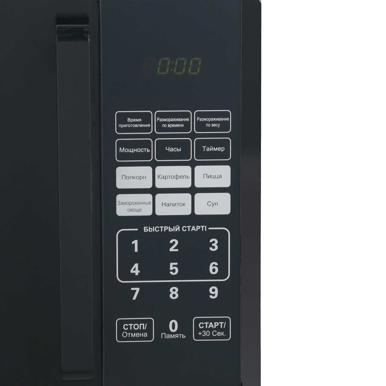 Сбоку размещена сенсорная панель управления с небольшим цифровым дисплеем. Доступна индикация оставшегося времени до конца готовки. Можно настроить таймер со звуковым сигналом. Регулировка мощности осуществляется на 10 ступенях. В комплекте идет стеклянный поворотный столик, диаметр которого равен 27,5 см.