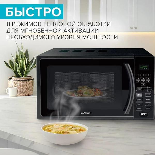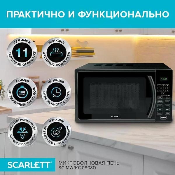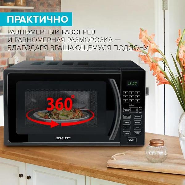 Микроволновая печь соло Scarlett SC-MW9020S08D на электронном управлении вмещает 20 л и дополняется 24,5-сантиметровым поворотным столом из стекла. Черный пластиковый корпус дополнен стеклянной дверью, эмалированным покрытием и ручкой. Передняя панель получила встроенные часы, цифровой дисплей и индикацию, сообщающую о включении и времени, оставшемся до окончания приготовления.