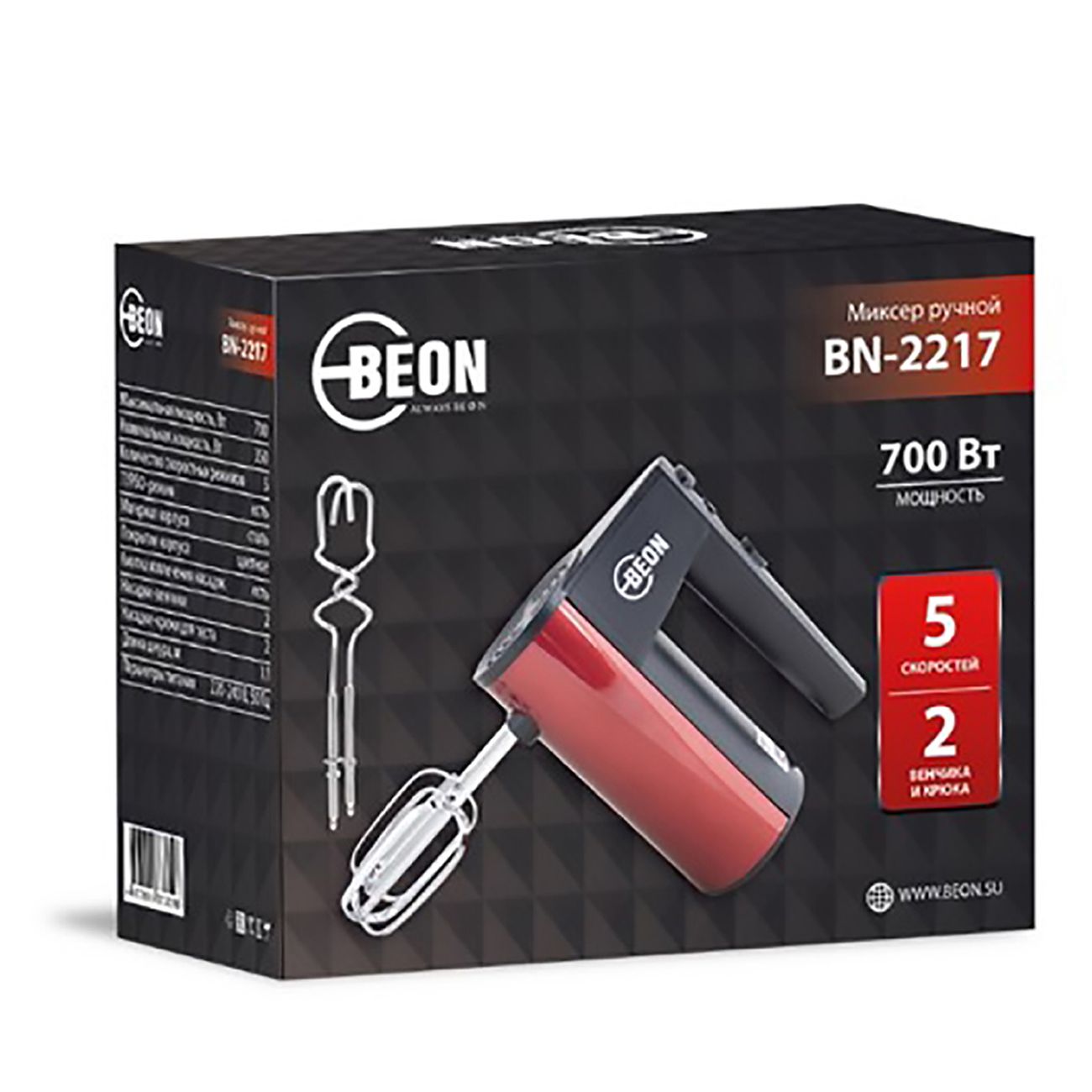 Beon BN-2217 — ручной миксер мощностью 700 Вт. Оснащен механической системой управления, которая предоставляет выбор из пяти скоростей работы. Есть также режим «Турбо». В комплекте поставляются венчики для взбивания и крюки для замешивания теста. Для их извлечения предусмотрена отдельная кнопка. Корпус выполнен из металла, рабочие части насадок — из нержавеющей стали. Ручка открытая. Подключение к розетке производится при помощи кабеля длиной 1,1 м. Размеры устройства: 29,3 х 9 х 19 см, вес — 900 г.