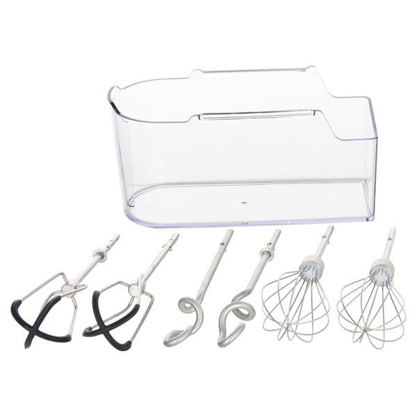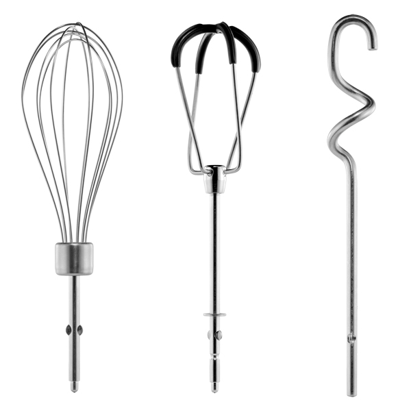 Используйте три входящие в комплект насадки для получения идеального результата. Насадка-крюк подойдёт для перемешивания густого теста, насадка со скребками – для жидкого теста и венчик – для кремов.