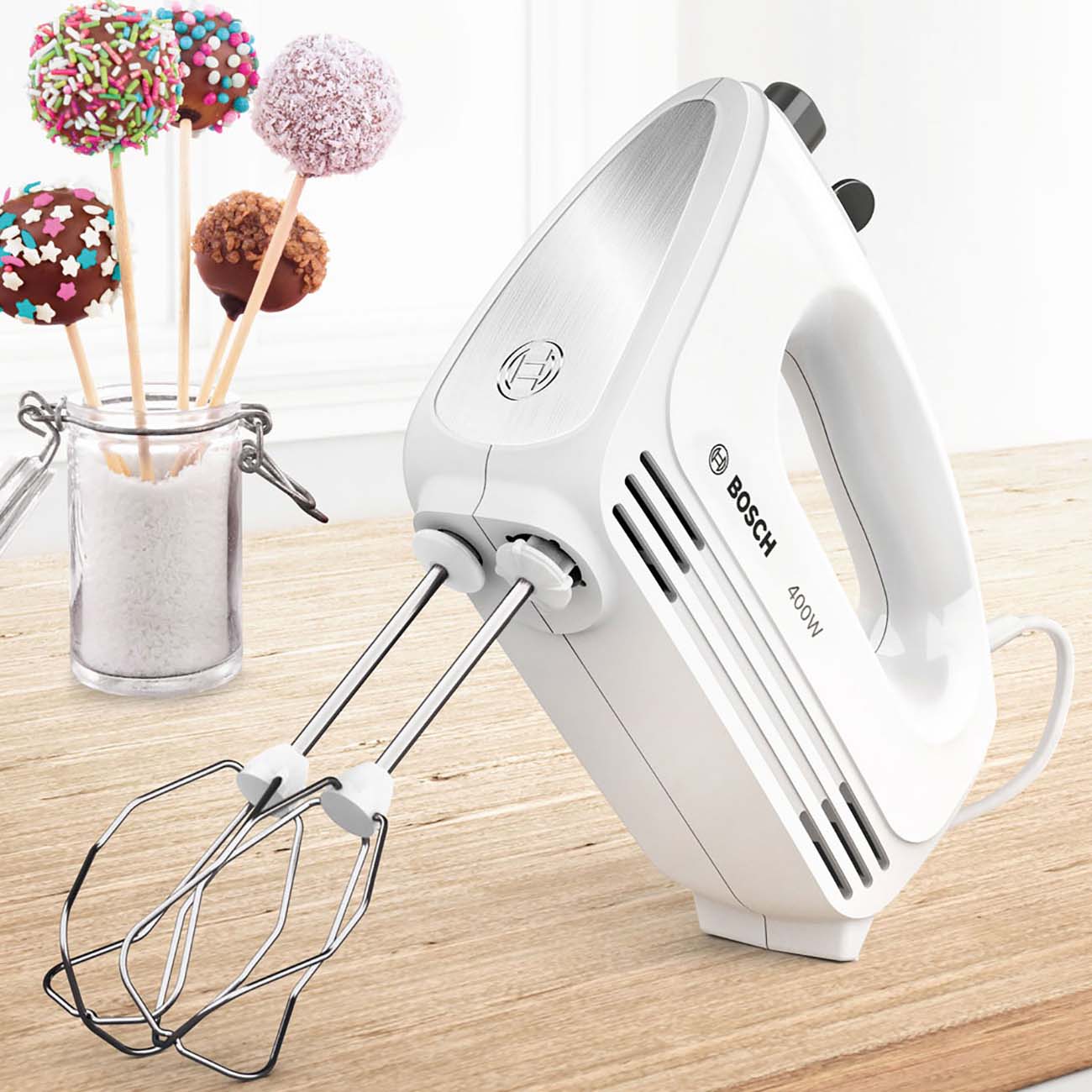 Миксер Bosch MFQ24200 снабжён мощным и тихим мотором, а также укомплектован двумя типами насадок. Благодаря этому он может использоваться для выполнения таких задач, как замешивание теста, смешивание продуктов, а также взбивание сливок и кремов.
