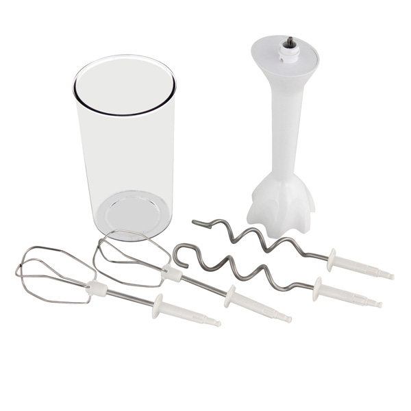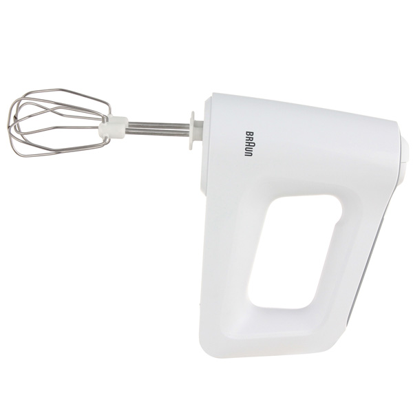 По габаритам миксер Braun 4644-HM3105WH небольшой, места занимает немного, по весу легкий, поэтому в руке его держать удобно. Миксер достаточно мощный - 500 Вт. Простой в обращении. Нижняя часть выполнена таким образом, что миксер можно поставить на стол, он устойчив. Компактный, легко умещается в коробку вместе с насадками. В комплекте шли две пары насадок - венчики для взбивания и крючки для замешивания теста, погружной блендер для измельчения и мерный стакан.