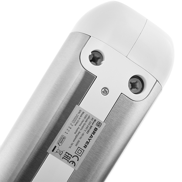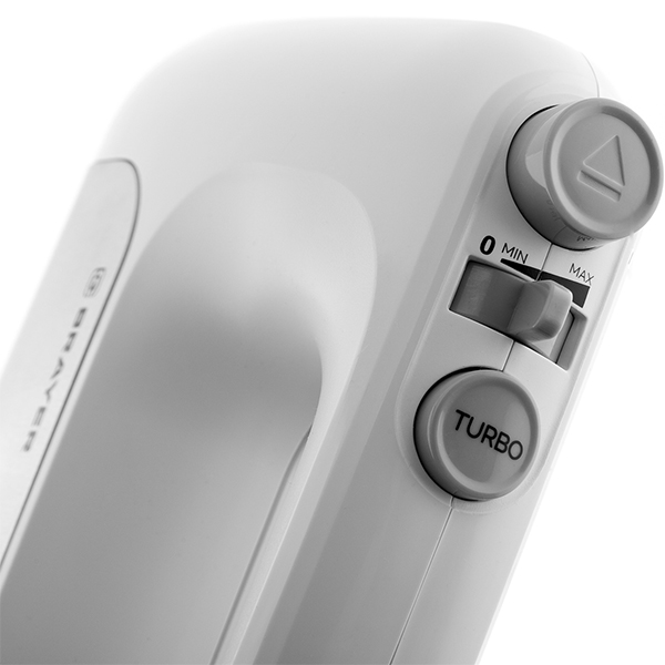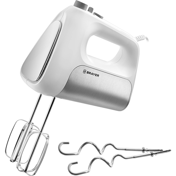 Миксер Brayer BR1303 мощностью 250 Вт оснащен двумя типами насадок: для взбивания и замеса теста. Пять уровней скорости плавно регулируются при помощи кнопок на верхней части рукоятки. Для смены насадок предусмотрена кнопка, есть турборежим. Вес прибора — 1,3 кг.