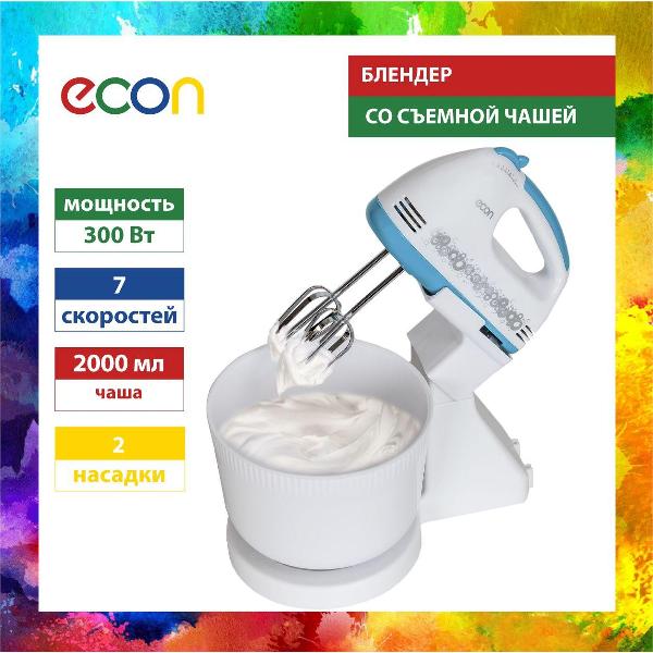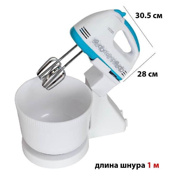 Миксер Econ ECO-201MX применяется при создании соусов и крема, взбивания яиц и изготовления теста. Устройство функционирует по семи скоростям. Корпус из прочного пластика оборудован кнопкой замены рабочих частей, широкой эргономичной рукояткой и чашей. В комплект прилагаются четыре насадки — две насадки для взбивания и две крюкообразных насадки для теста.