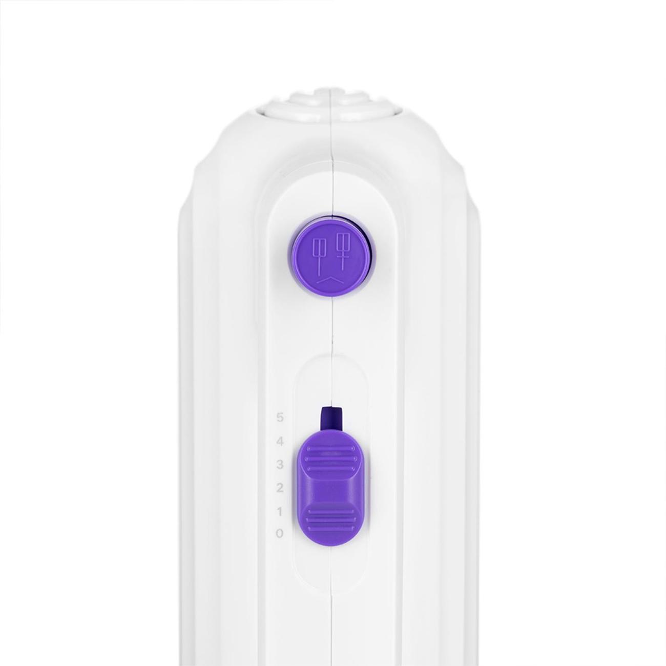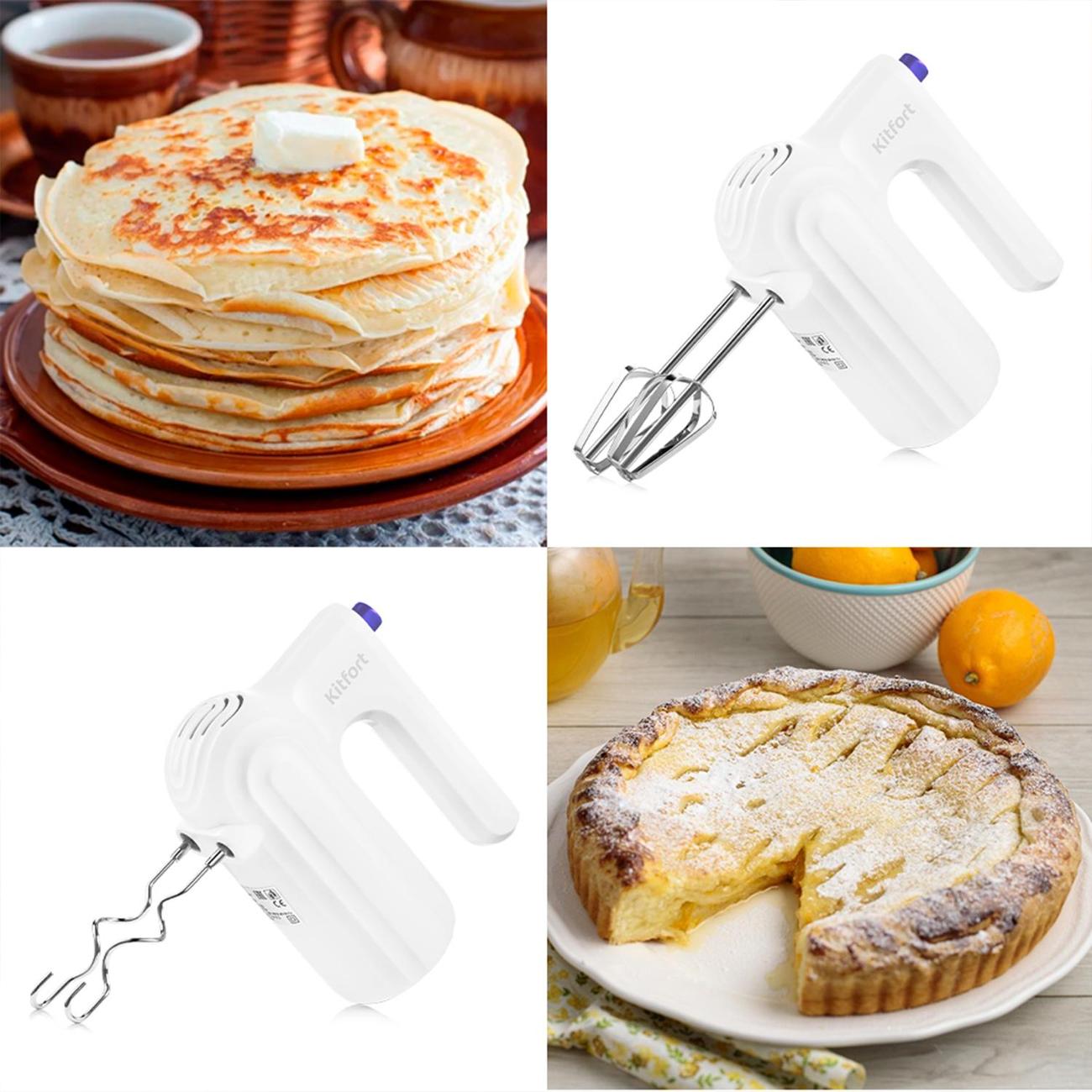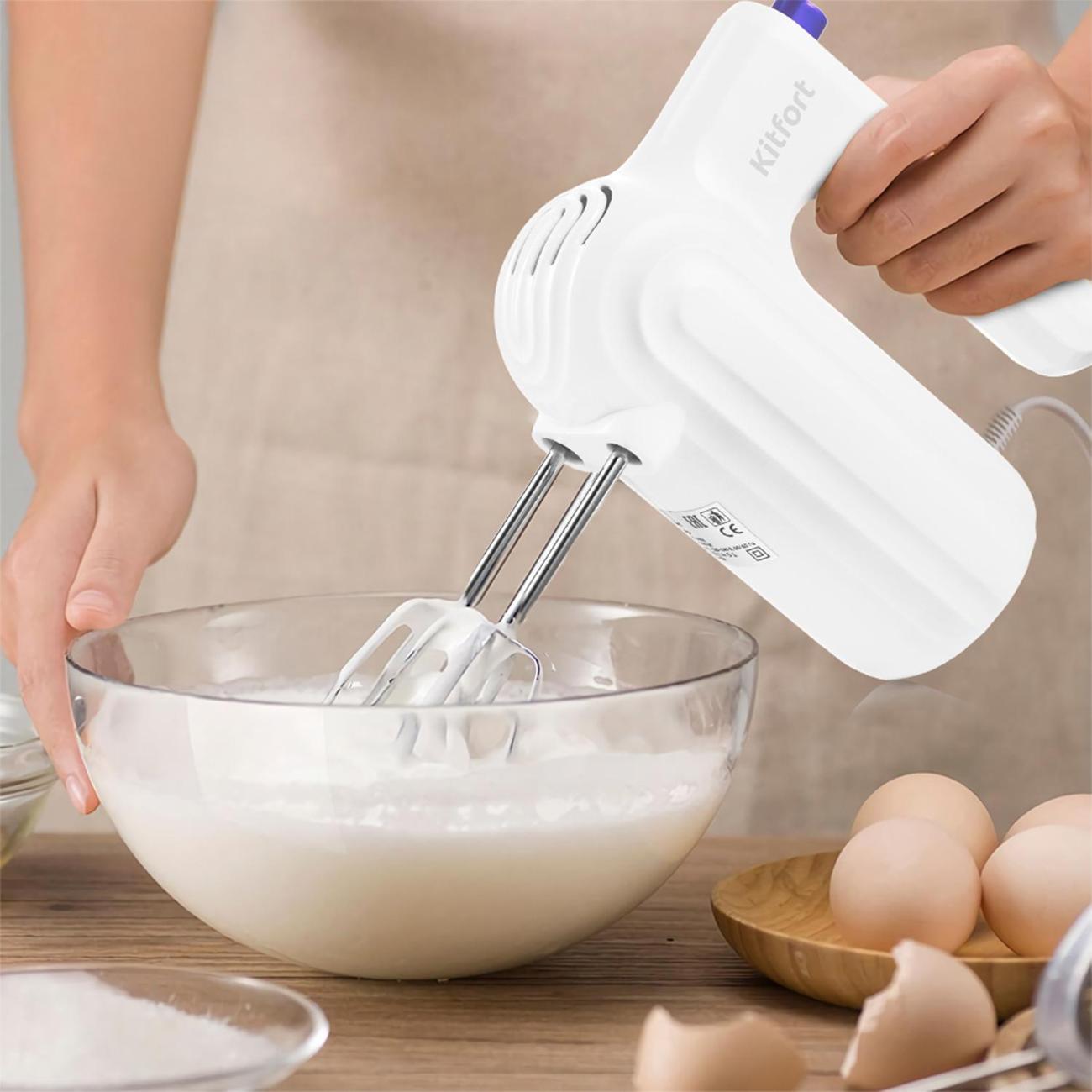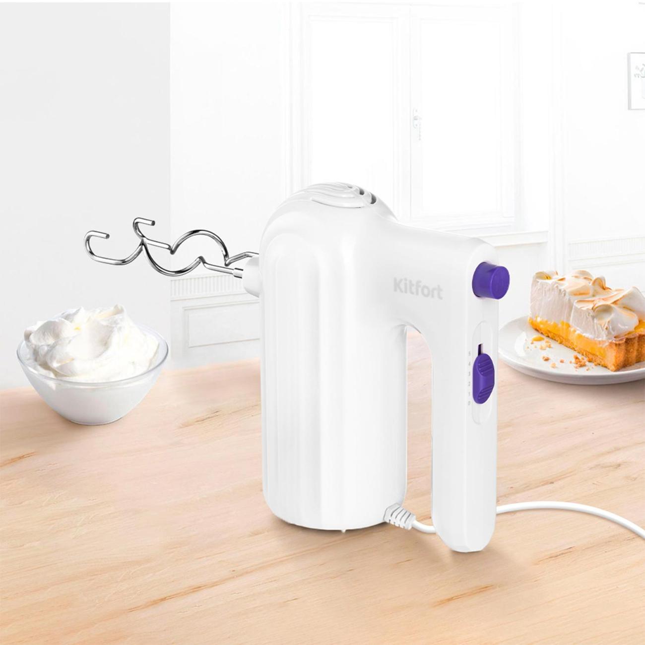 Миксер Kitfort КТ-3098 в корпусе белого цвета работает от электрической сети и потребляет 1000 Вт. Длина сетевого кабеля составляет 1 м. Скоростей работы у прибора пять, управление осуществляется с помощью ползункового переключателя. Специальная кнопка на ручке позволяет без лишних усилий извлечь насадки. Эргономичная ручка миксера плотно лежит в ладони. Благодаря простому и лаконичному дизайну прибор без труда впишется в любой интерьер кухни. В комплект входят два венчика для взбивания мягких текстур и замеса жидкого теста, два крюка для смешивания плотных текстур, например, песочного теста.