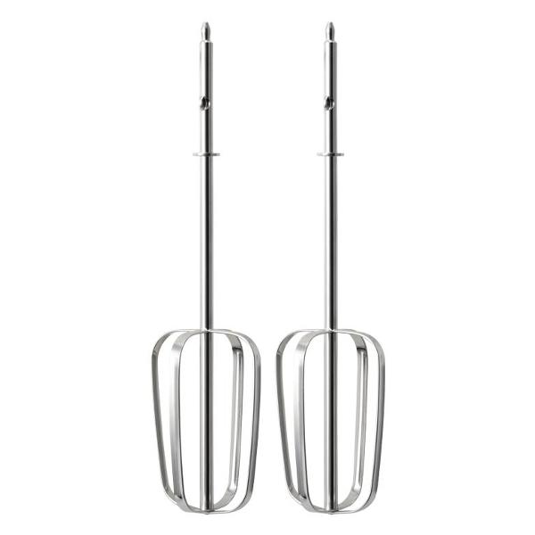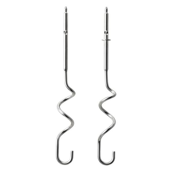 Пять скоростей работы (от 670 об/мин до 1150 об/мин) позволяют подобрать наиболее подходящий режим. Переключатель находится на внешней стороне рукоятки. Менять настройки удобно одним пальцем, не прерывая работы. Рядом расположена кнопка отсоединения насадок. В комплекте их две пары: венчики для приготовления смесей легких текстур и крюки — для более густых и вязких. Насадки цельнометаллические и не имеют пластиковых соединений.
