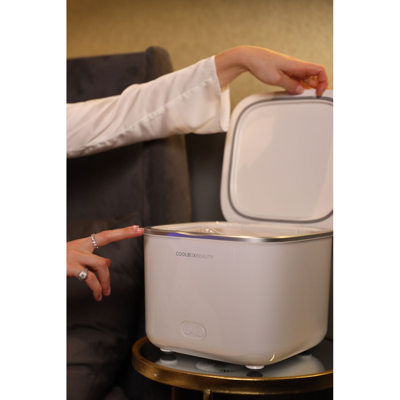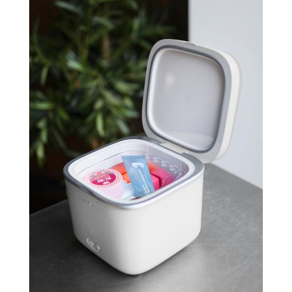 Мини-холодильник Coolboxbeauty Up Box объемом 4 л выполнен в белом корпусе с крышкой. Устройство позволяет выбрать температуру внутри камеры от 7°С до 14°С с помощью двух кнопок на лицевой панели. Информация о температуре выводится на цифровой дисплей с голубой подсветкой. Уровень шума при работе холодильника — 36 дБ, мощность потребления варьируется от 45 Вт до 55 Вт. Габариты холодильника — 300х300х260 мм при весе 3,5 кг.