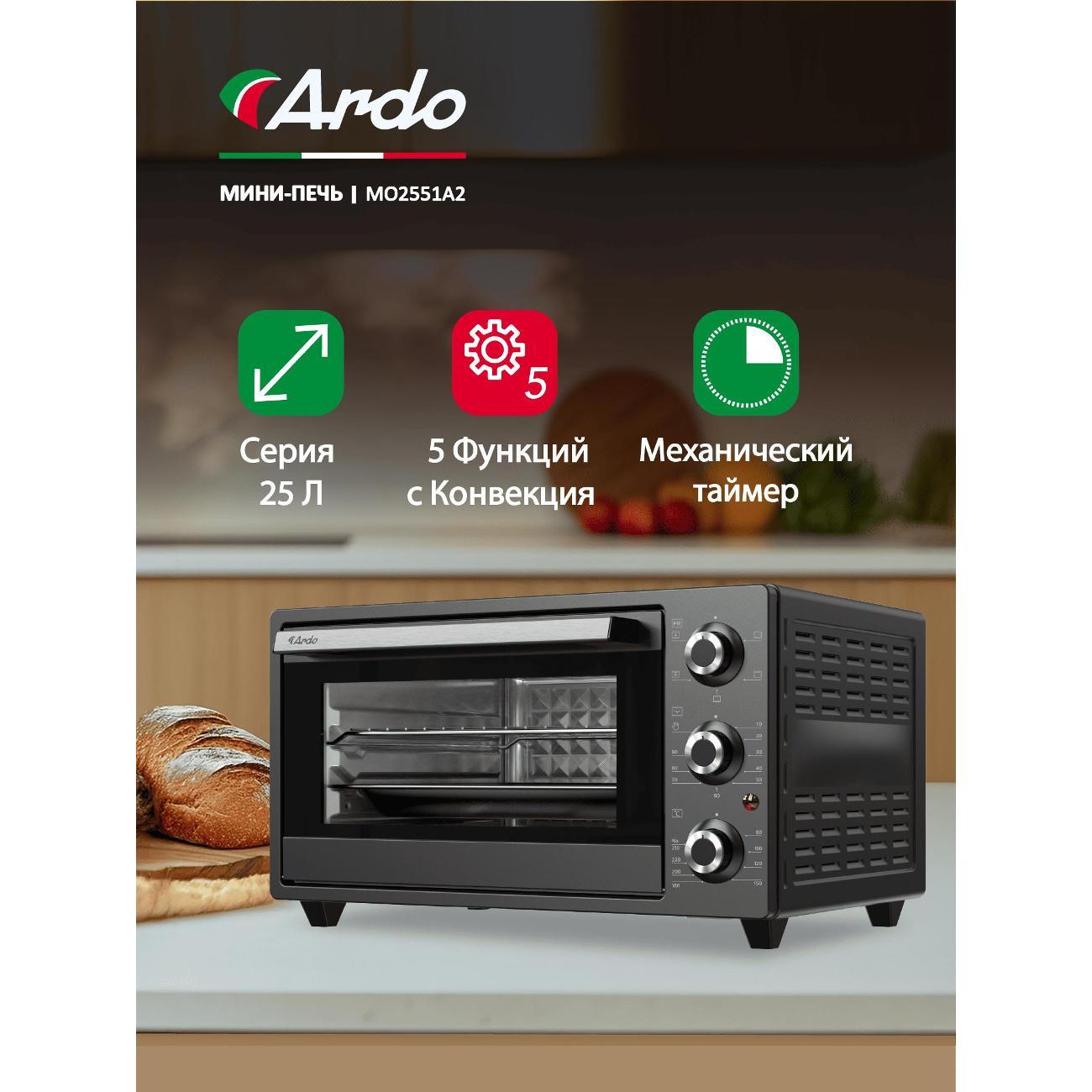 Вы можете купить Мини-печь Ardo MO2551A2 в магазинах М.Видео по доступной цене. Мини-печь Ardo MO2551A2: подробное описание, фото и отзывы реальных покупателей, характеристики, возможность скачать инструкции и подобрать аксессуары.