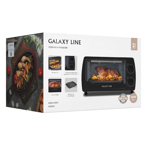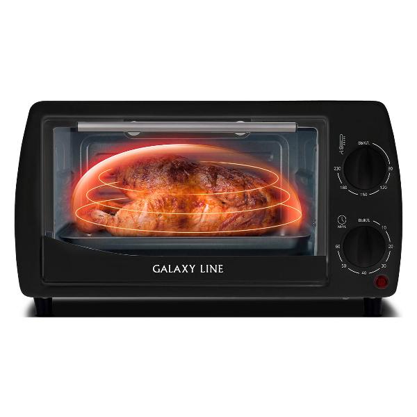 Мини-печь Galaxy Line GL2626, черная — компактная модель, габариты внутренней камеры которой составляют 249х214х179 мм, объем — 10 л. Помещается противень размером 248х207 мм. Мощность прибора — 1000 Вт, режим работы один.