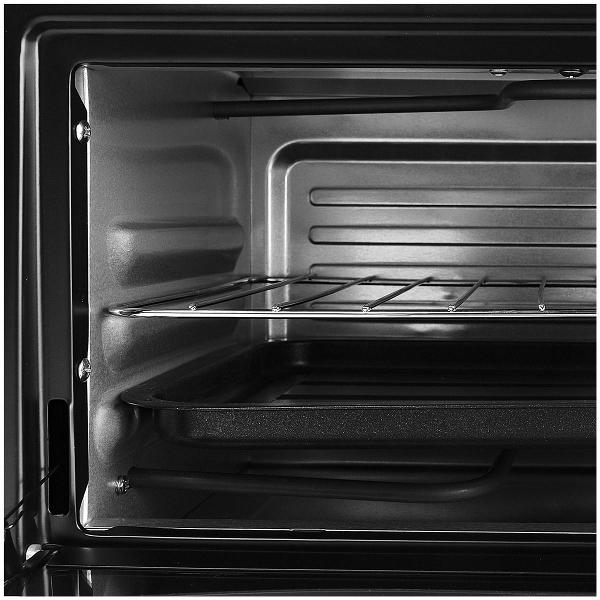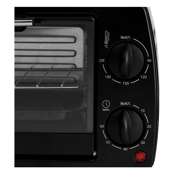 За управление отвечают два механических поворотных переключателя. При помощи верхнего устанавливается температура в диапазоне от 90°C до 230°C, нижнего — таймер на срок до 60 минут. О включении и нагреве оповещает световой индикатор, об окончании работы — звуковой сигнал. Внутреннее покрытие стенок обладает антипригарными свойствами и легко поддается очистке. Противень можно установить на четырех уровнях, направляющие рельефные. Предусмотрена подсветка для контроля хода приготовления.
