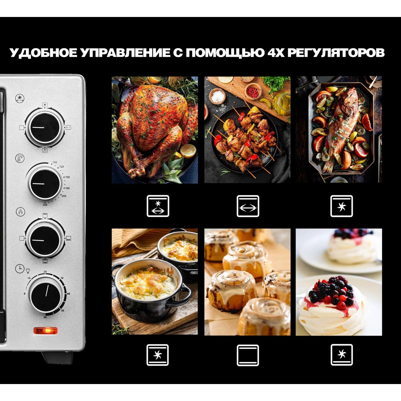 Управление — механическое. Таймер выключит модель в назначенное время и оповестит об окончании работы звуковым сигналом. Световые индикаторы показывают текущую и заданную температуру внутри. Подсветка позволяет отслеживать процесс приготовления, не открывая дверцу.