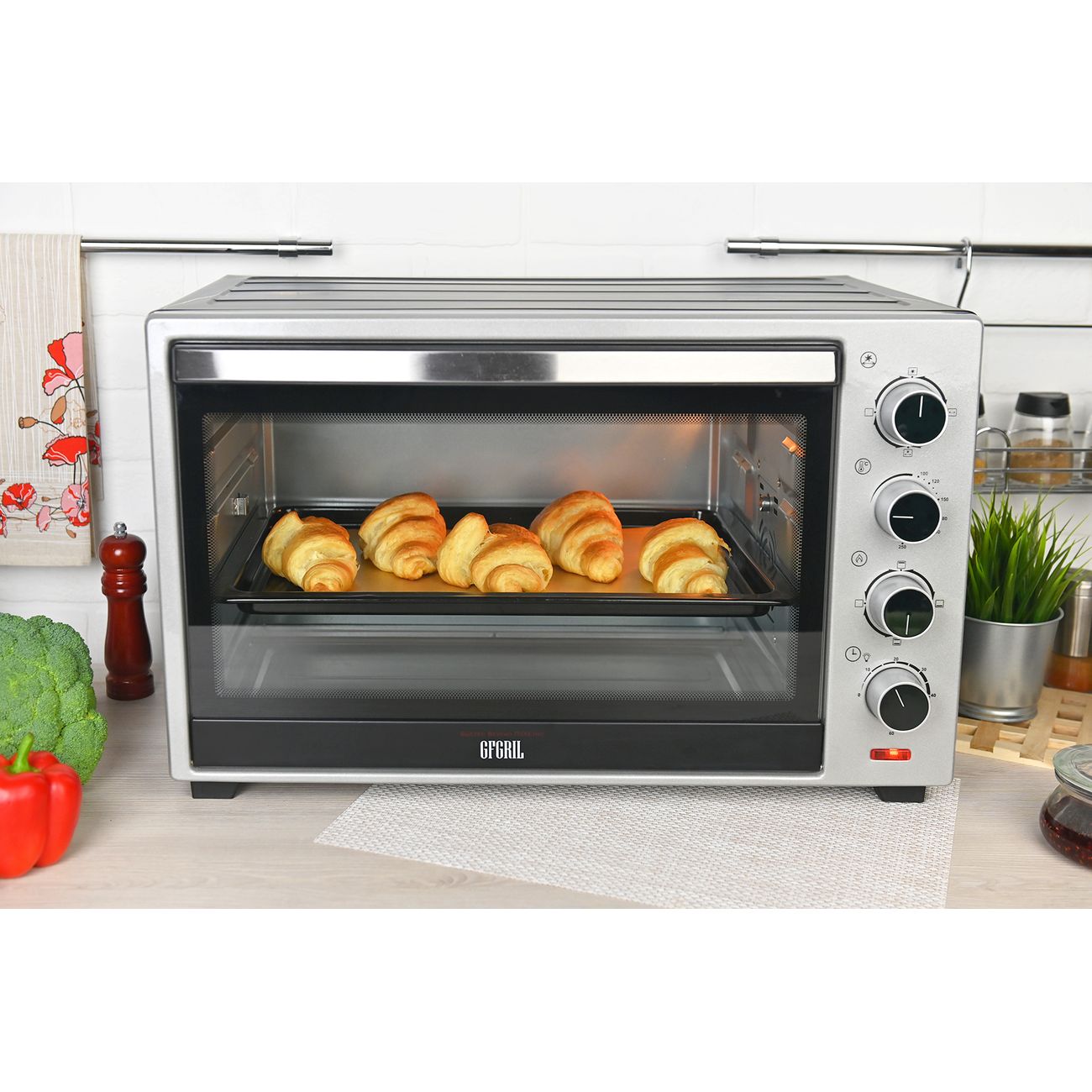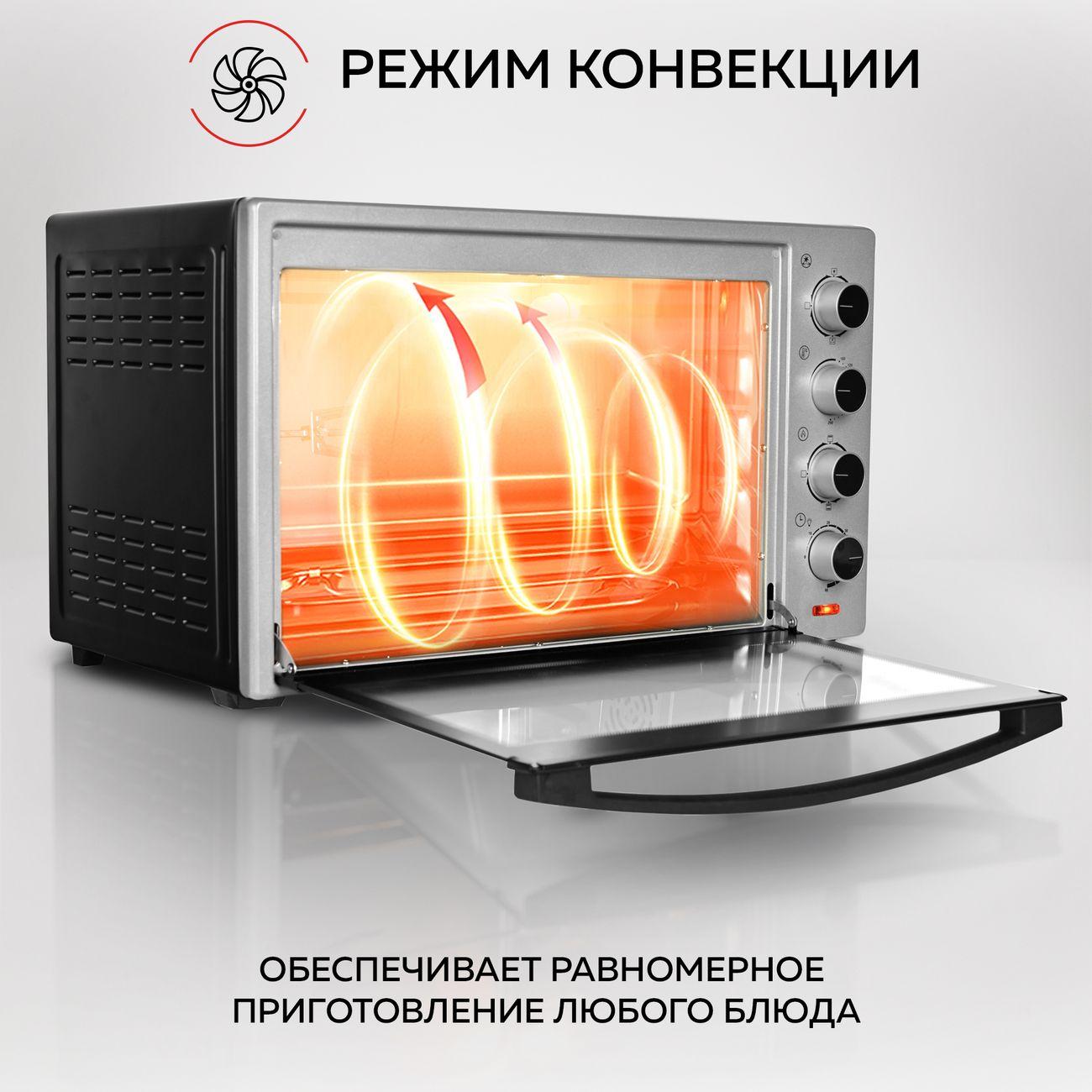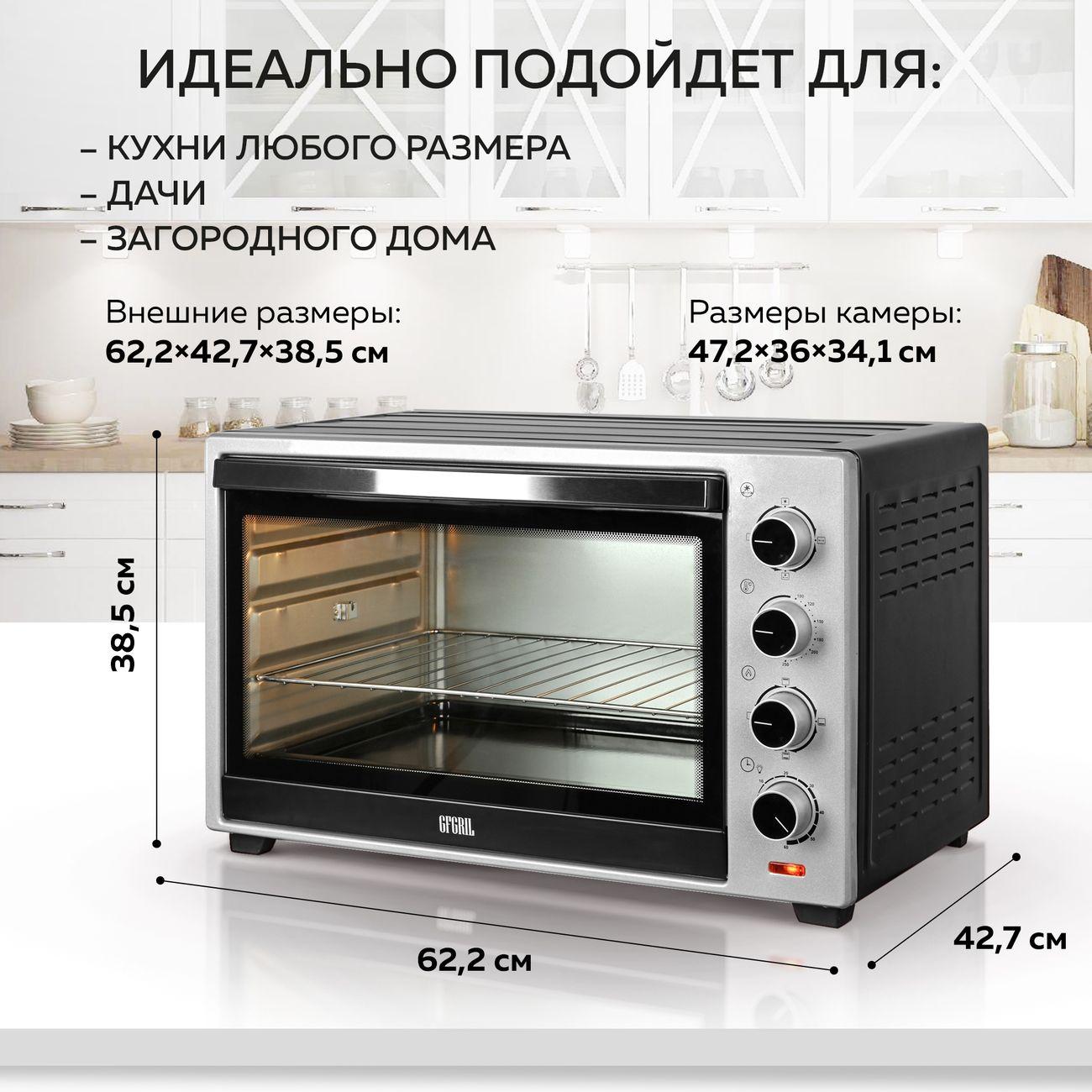 Мини-печь Gfgril GFO-60 мощностью 2000 Вт легко заменит духовку. В комплекте идут ухват, вертел, подставка для пиццы, решетка, плоский противень. Есть режимы конвекции и гриля.