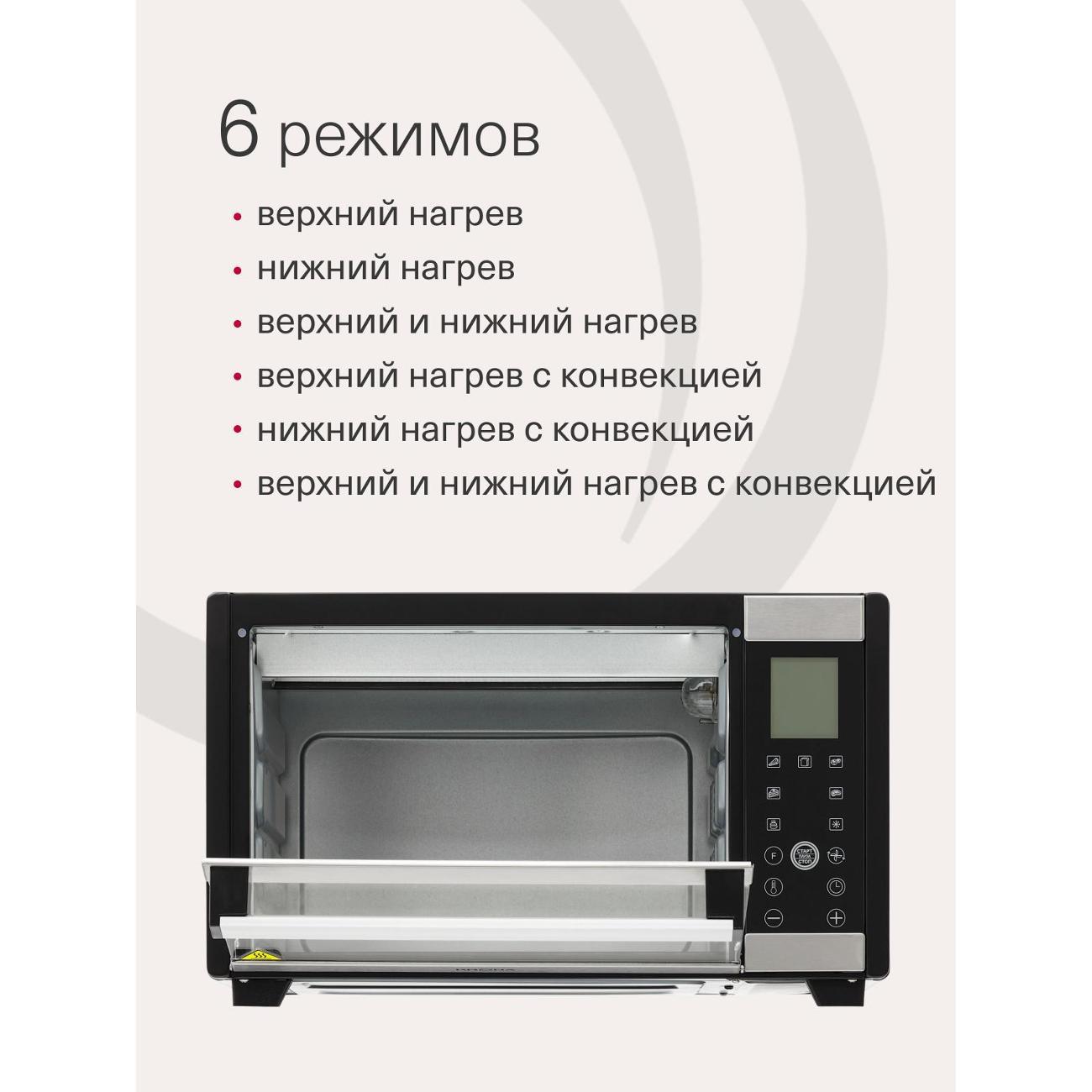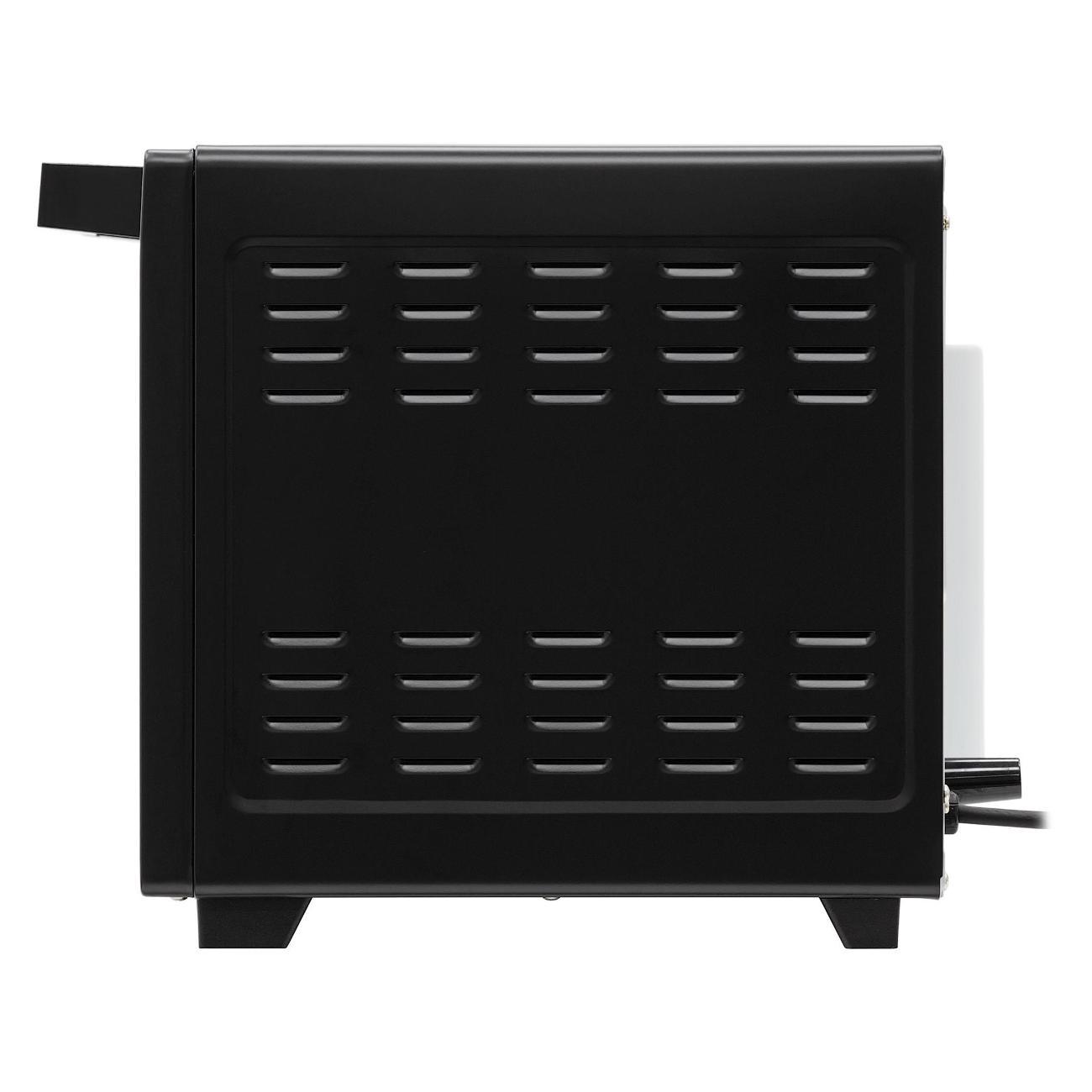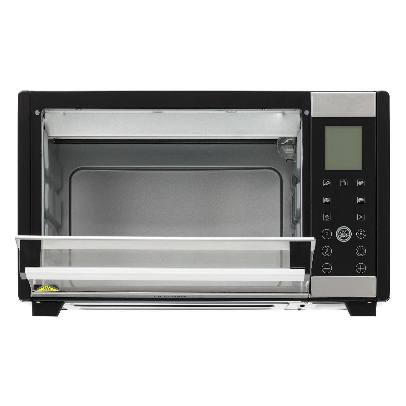 Корпус модели сделан из нержавеющего металла. Встроены ножки из резины для надежной фиксации на столе. Внутреннее антипригарное покрытие мини-печи устойчиво к механическим повреждениям, легко очищается от жира и частичек пищи. По окончании работы устройство издает звуковой сигнал. Максимальная температура достигает 230°С. Доступно шесть программ работы и режим конвекции. Предельный показатель энергопотребления равен 1600 Вт.