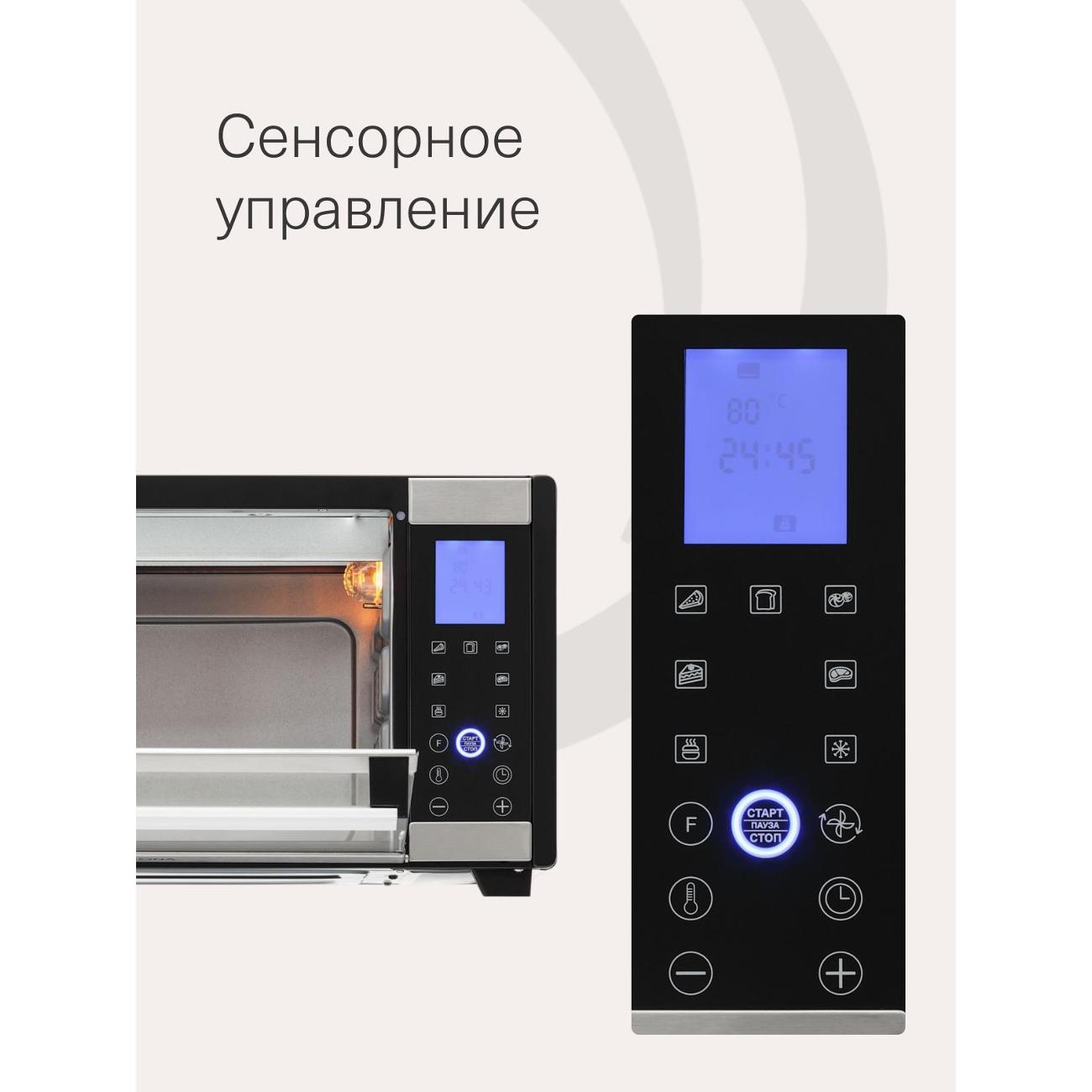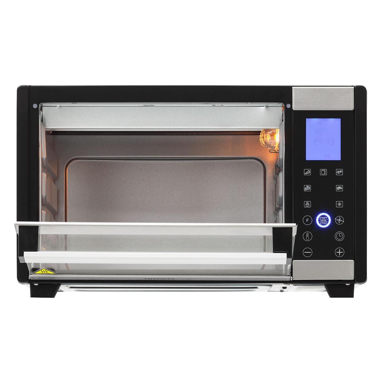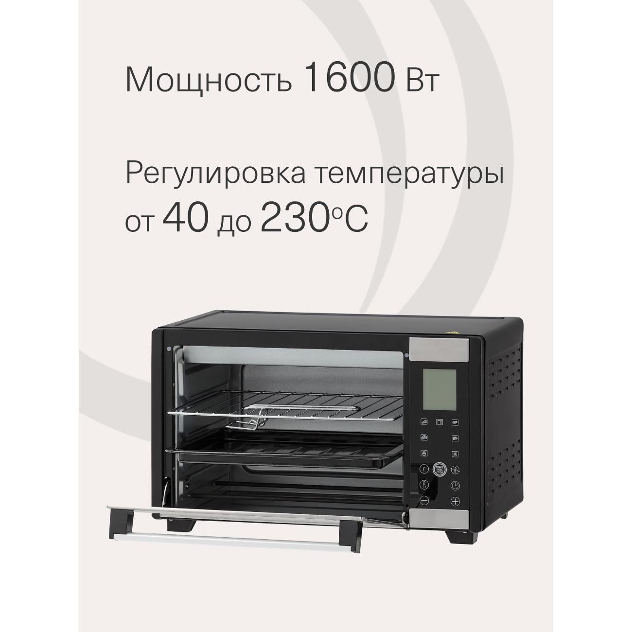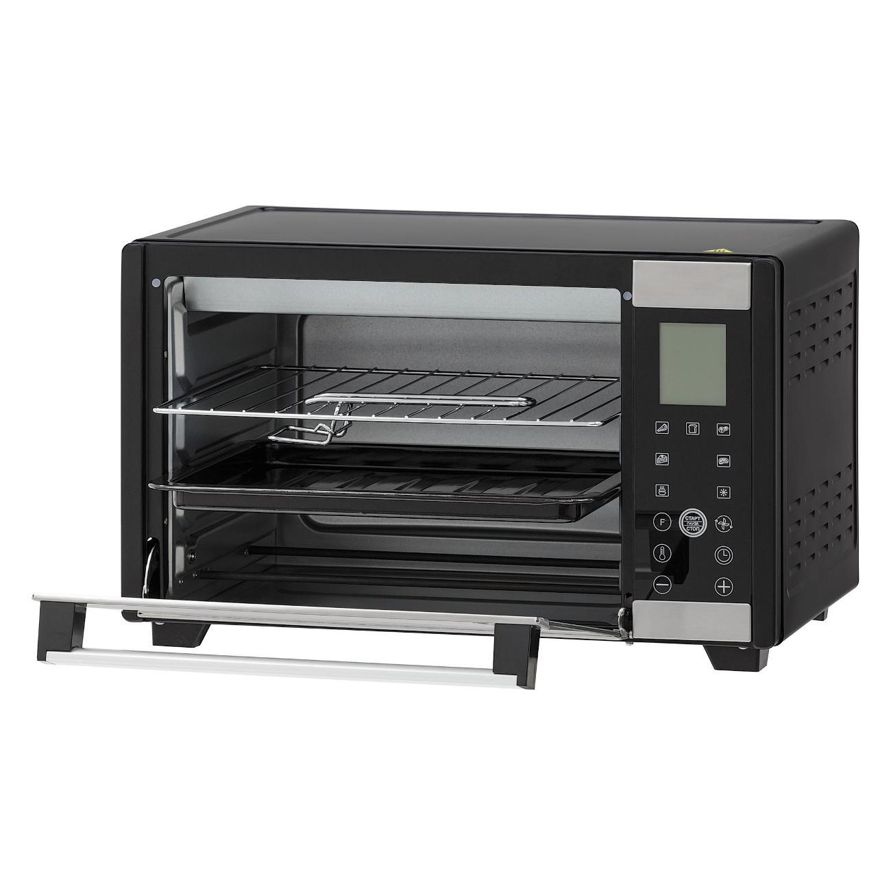 Корпус модели сделан из нержавеющего металла. Встроены ножки из резины для надежной фиксации на столе. Внутреннее антипригарное покрытие мини-печи устойчиво к механическим повреждениям, легко очищается от жира и частичек пищи. По окончании работы устройство издает звуковой сигнал. Максимальная температура достигает 230°С. Доступно шесть программ работы и режим конвекции. Предельный показатель энергопотребления равен 1600 Вт.