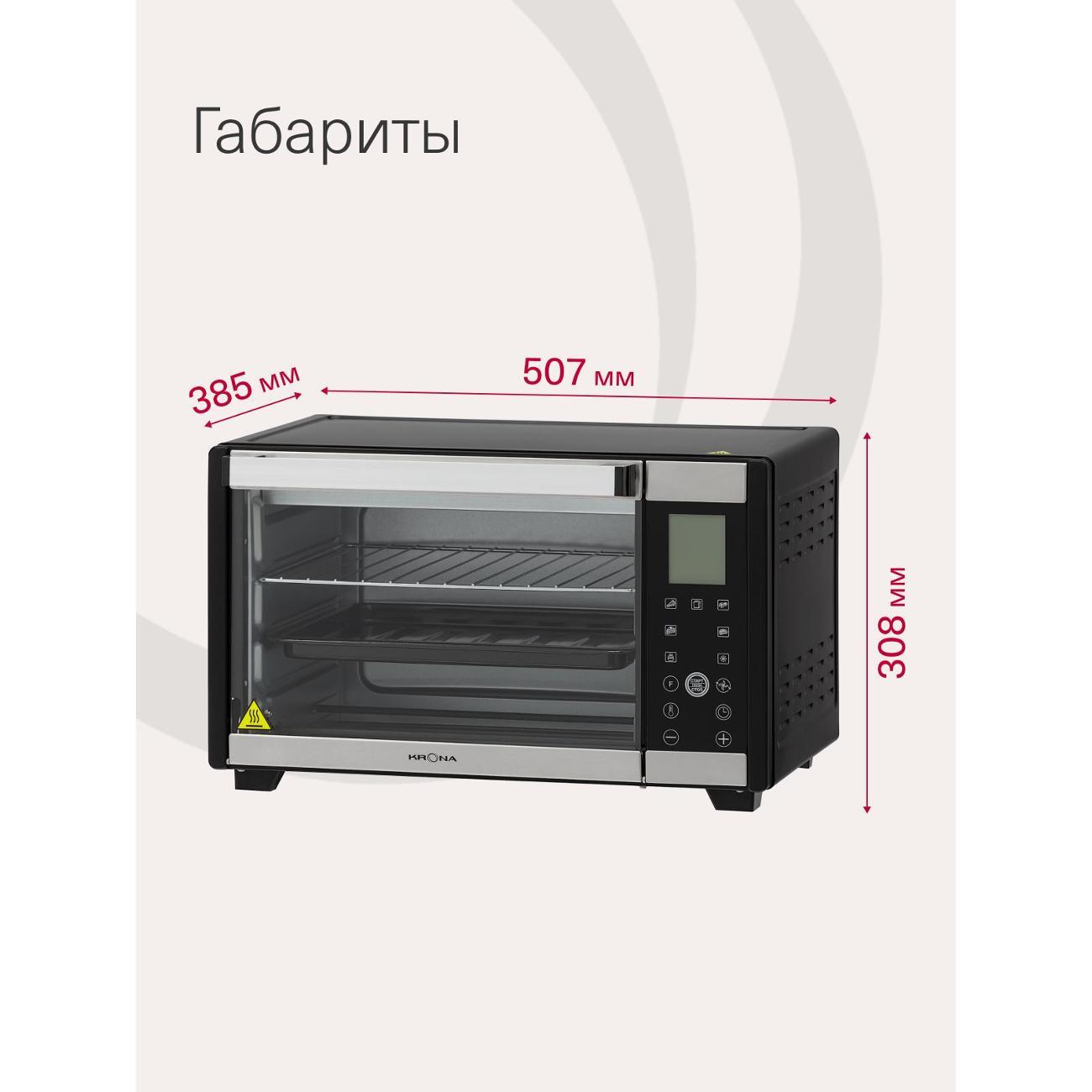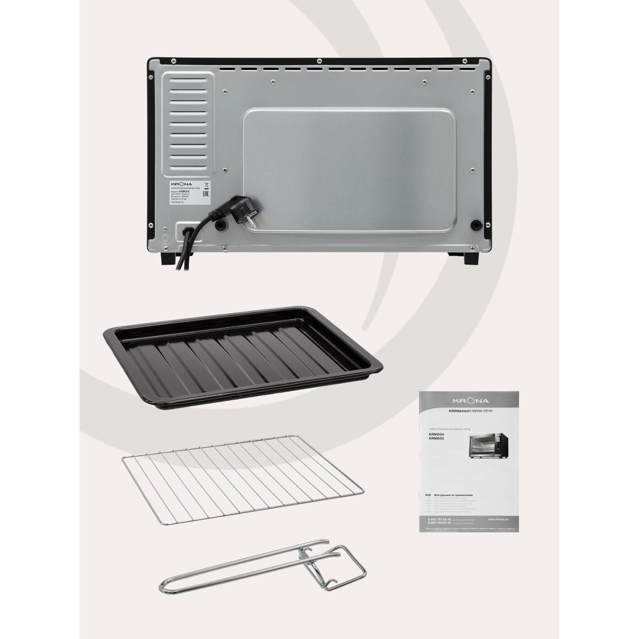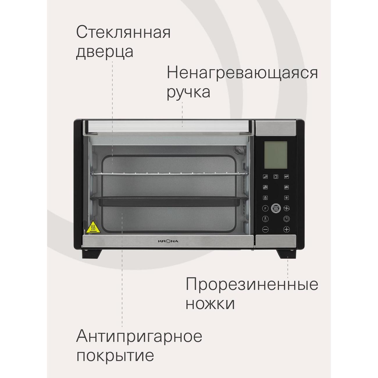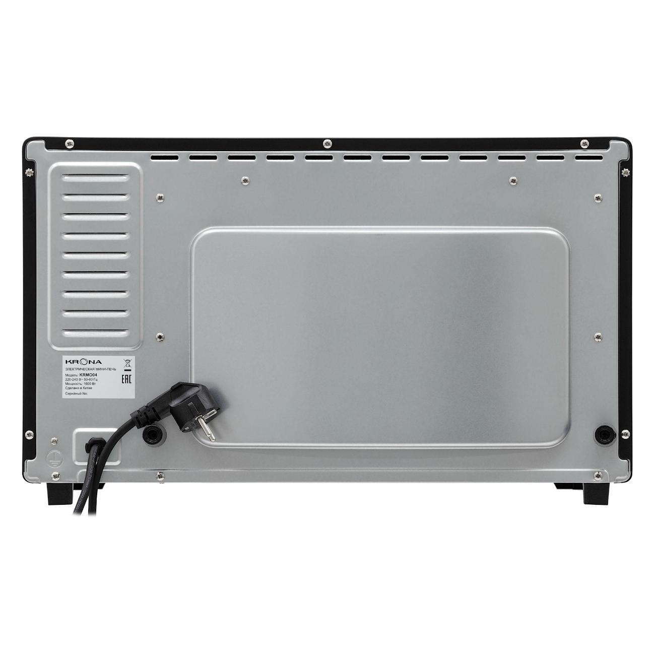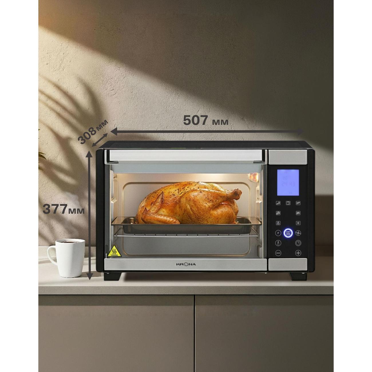 Мини-печь Krona Ofen 28 BLS оборудована сенсорной панелью управления и цифровым дисплеем с подсветкой, на котором отображается информация о выбранной температуре и времени готовки. Внутренний объем устройства составляет 28 л. Дверца духовки выполнена из однослойного жаропрочного стекла, открывается вниз при помощи ручки.