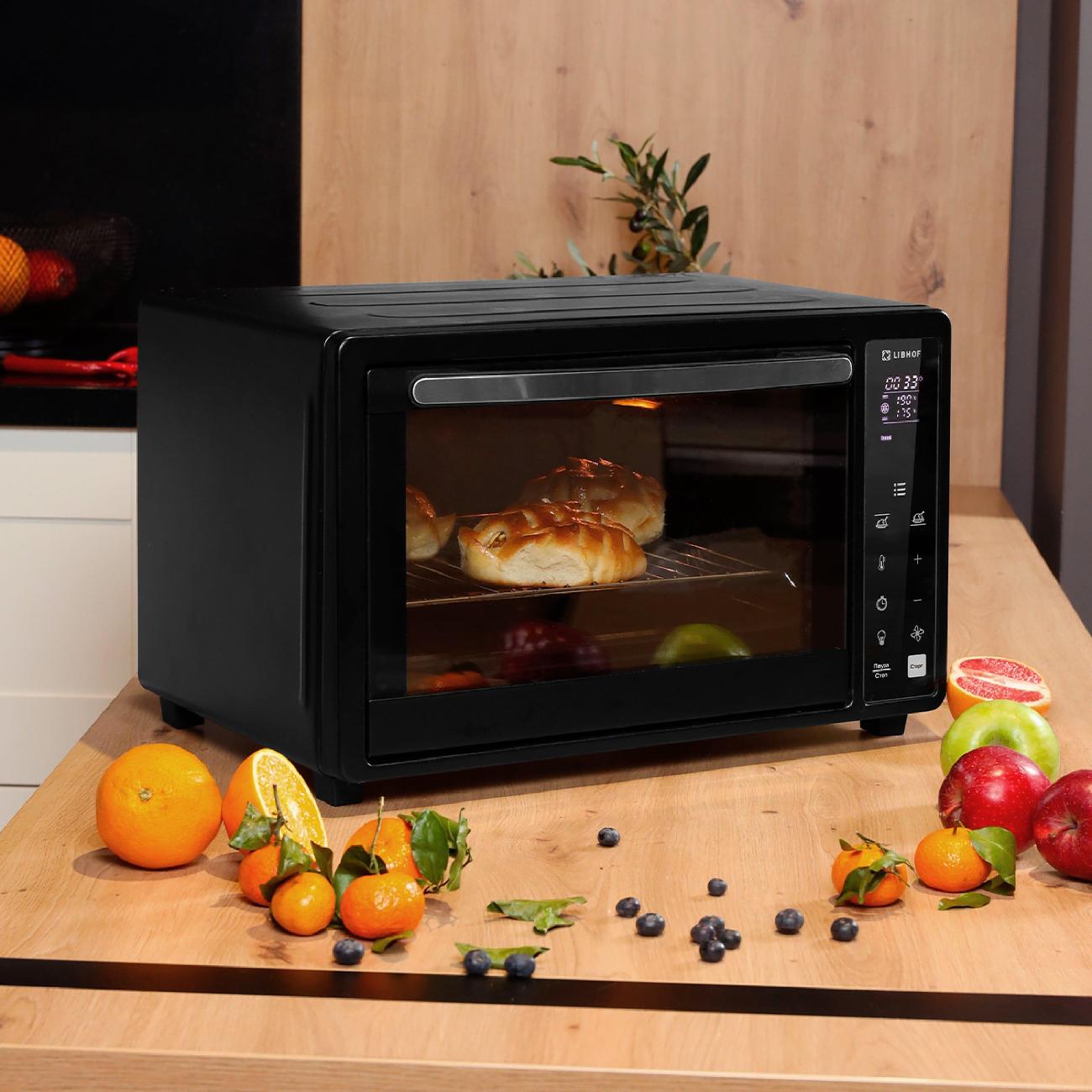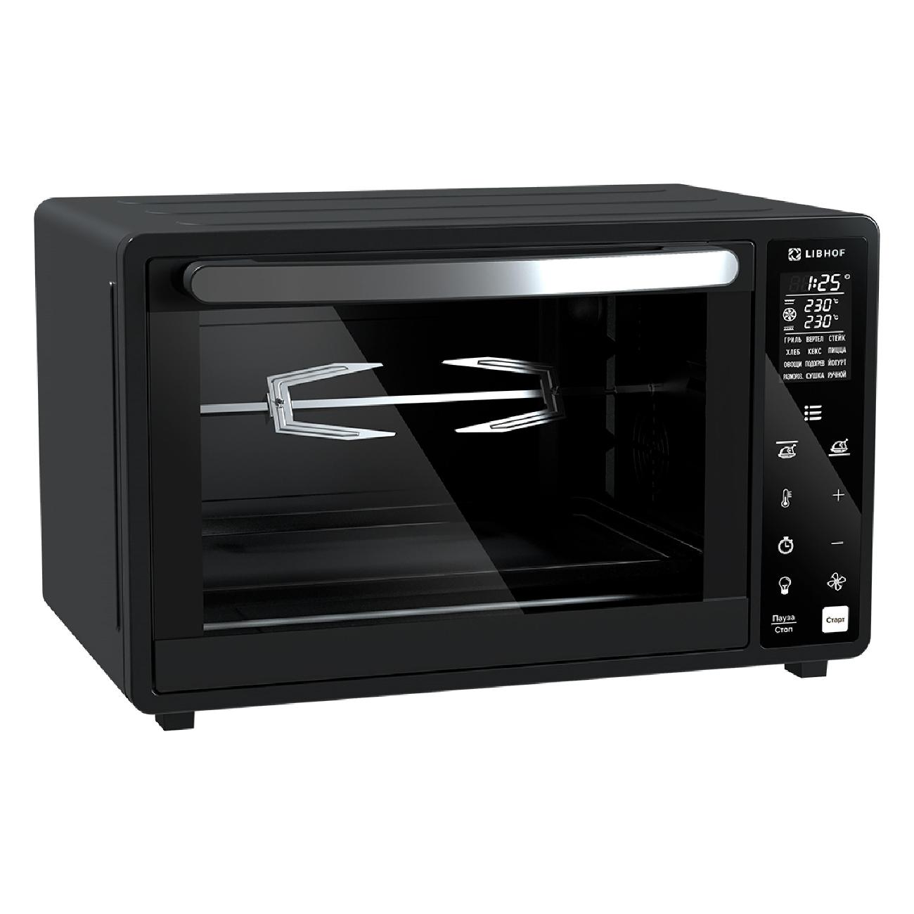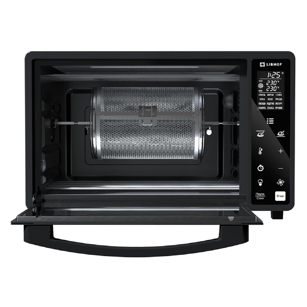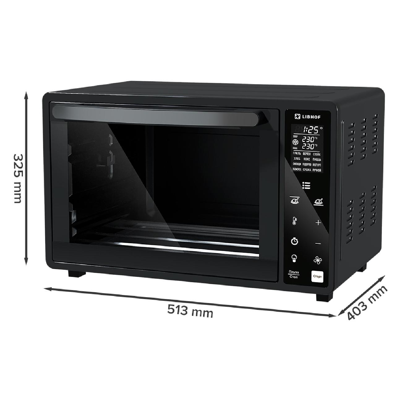 Черная мини-печь Libhof OVX-36 при габаритах 32,5х51,3х40,3 см и весе 8 кг вмещает 36 л. Модель управляется при помощи сенсорной панели с поддержкой 12 автоматических программ, звуковым сигналом, таймером и индикацией, оповещающей о включении и выбранной температуре. Устройство питается от сети посредством 0,8 м кабеля и потребляет 1500 Вт. Предусмотрен гриль, конвекция, функция предварительной разморозки и нагрев до максимальных 230°С.