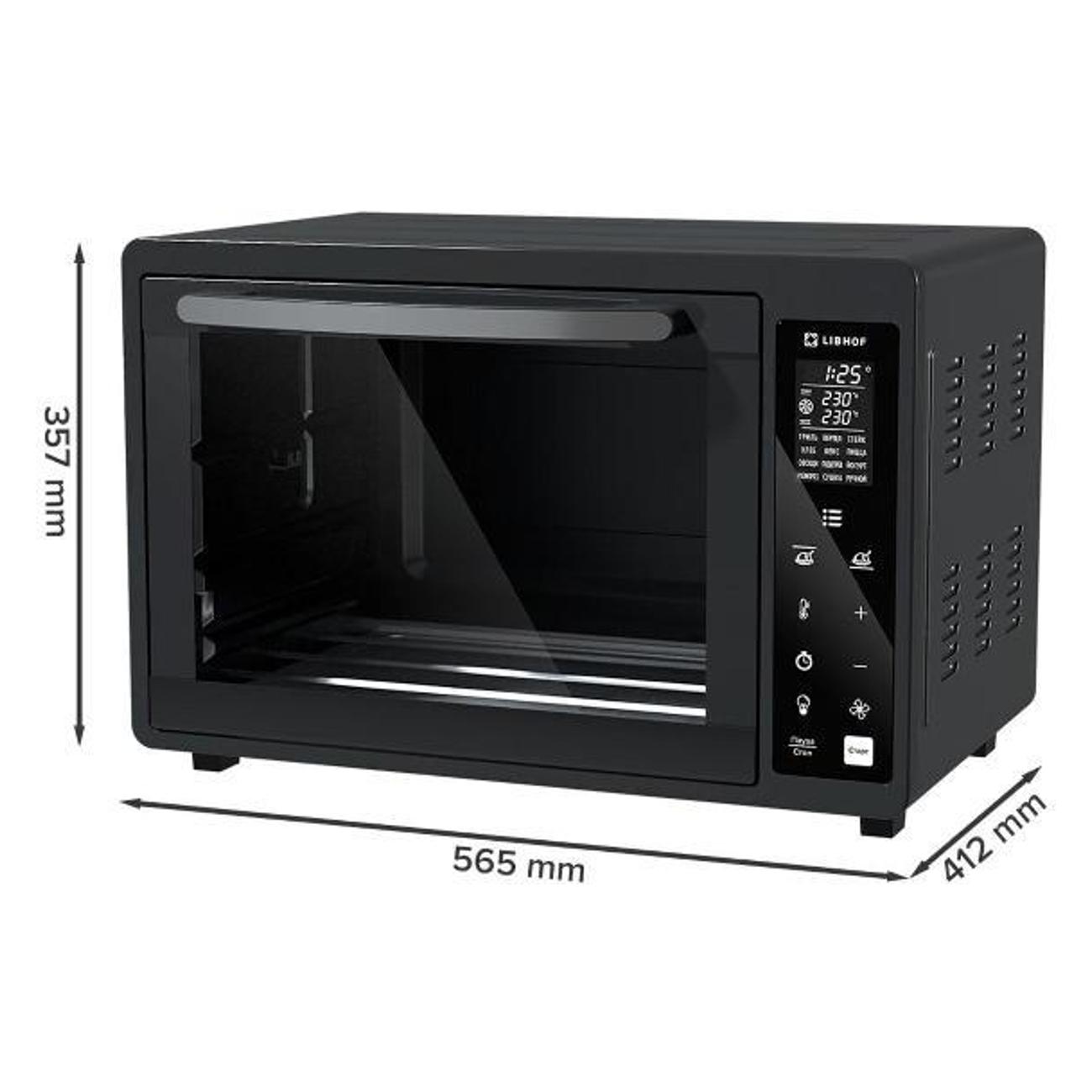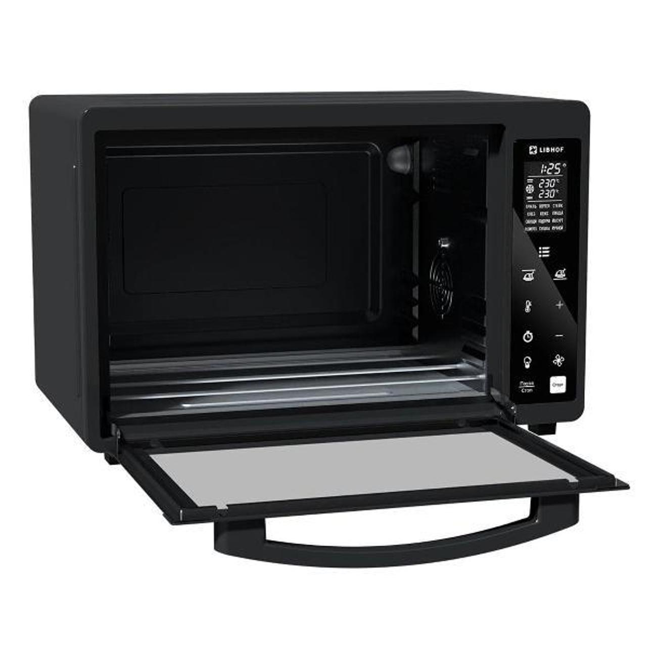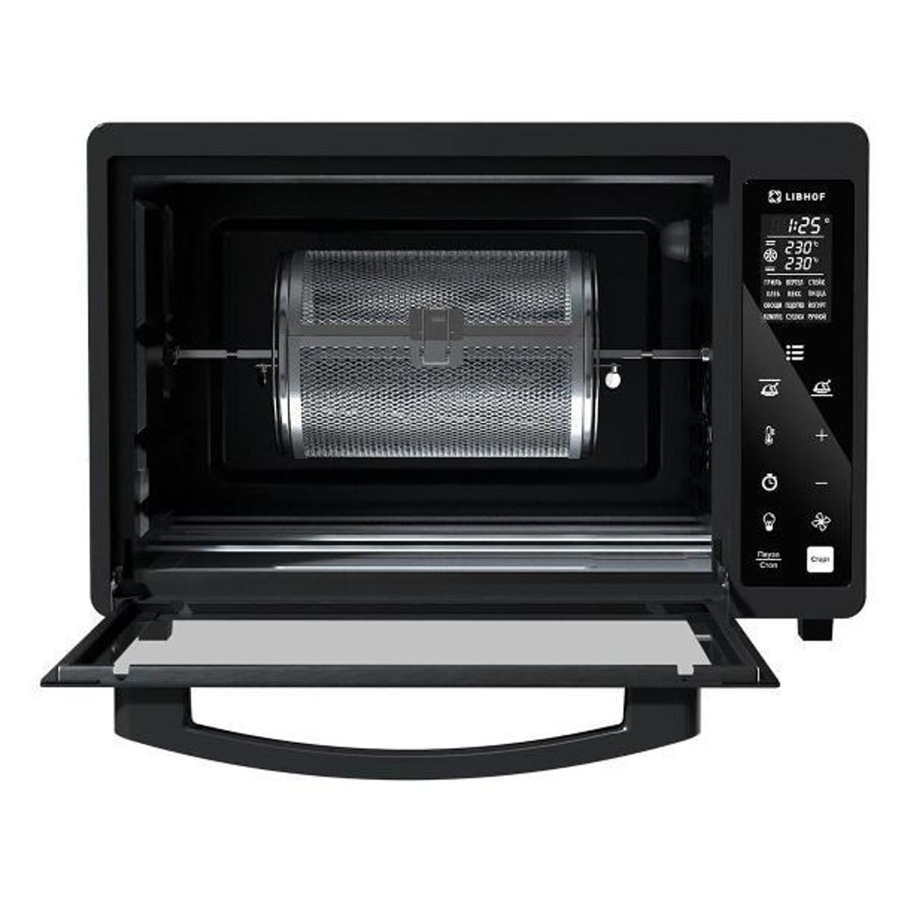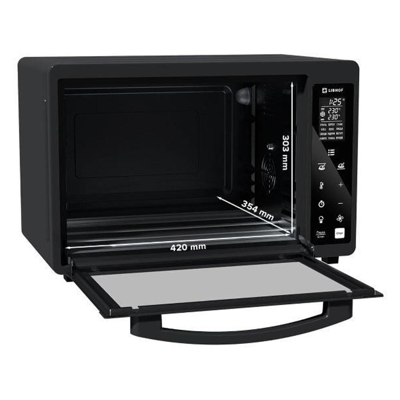 Черная мини-печь Libhof OVX-46 при габаритах 35,7х56,5х41,2 см и весе 8,3 кг вмещает 46 л. Модель управляется при помощи сенсорной панели с поддержкой 12 автоматических программ, звуковым сигналом, таймером и индикацией, оповещающей о включении и выбранной температуре. Устройство питается от сети посредством 0,8 м кабеля и потребляет 1800 Вт. Предусмотрен гриль, конвекция, функция предварительной разморозки и нагрев до максимальных 230°С.