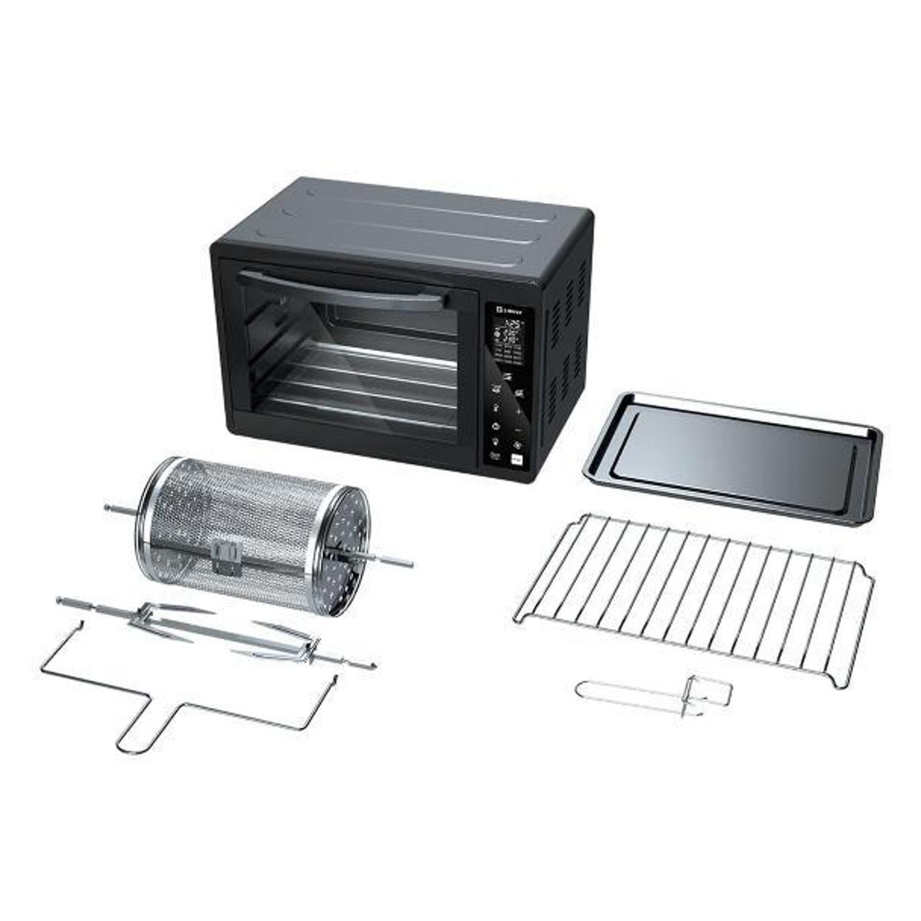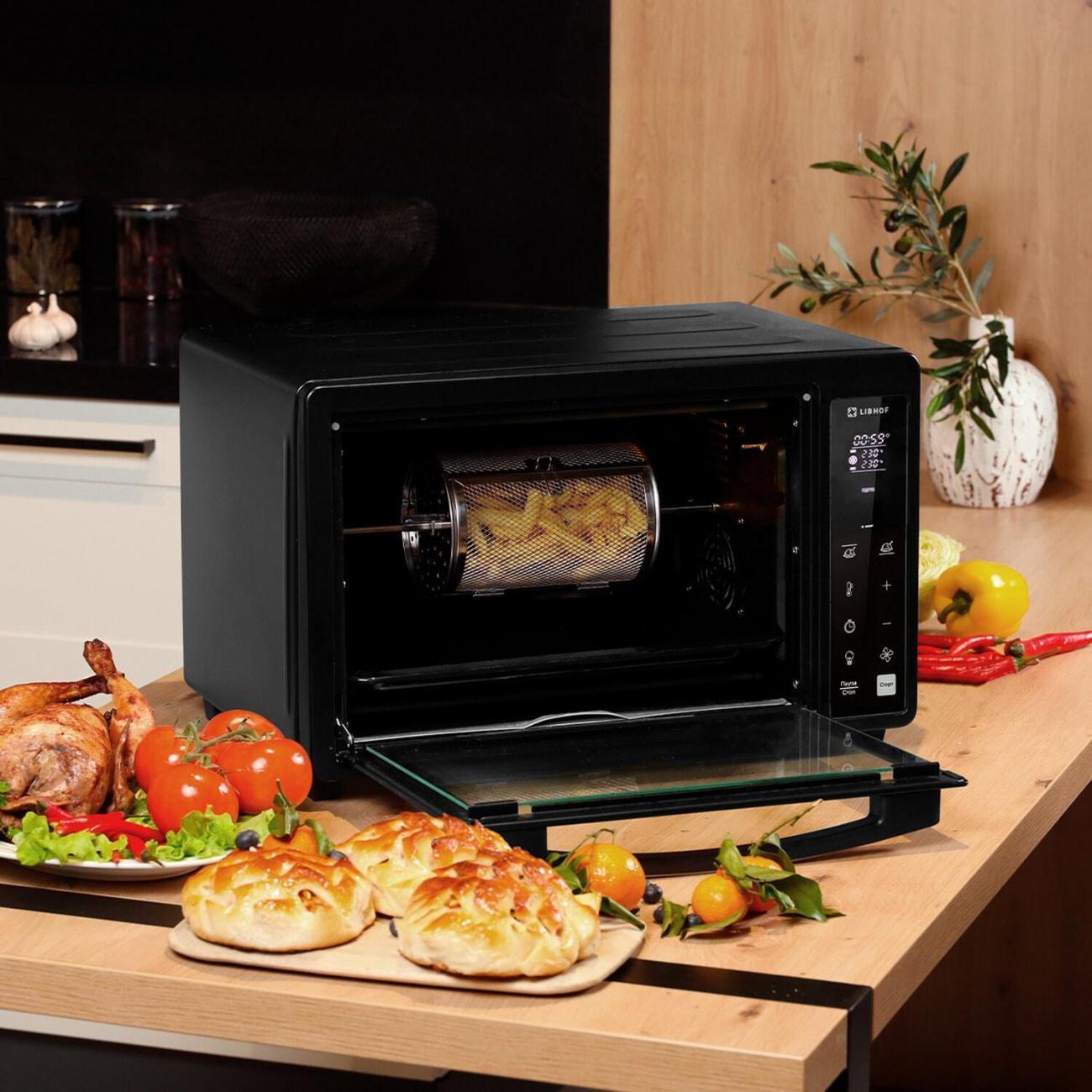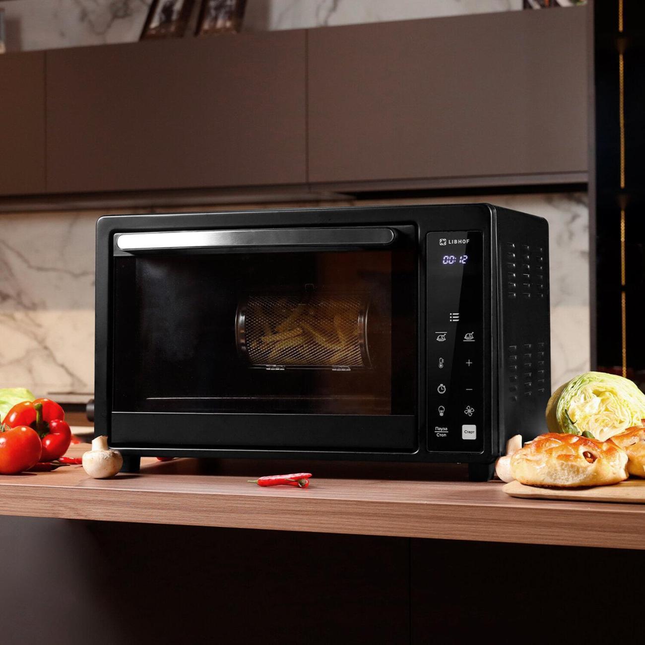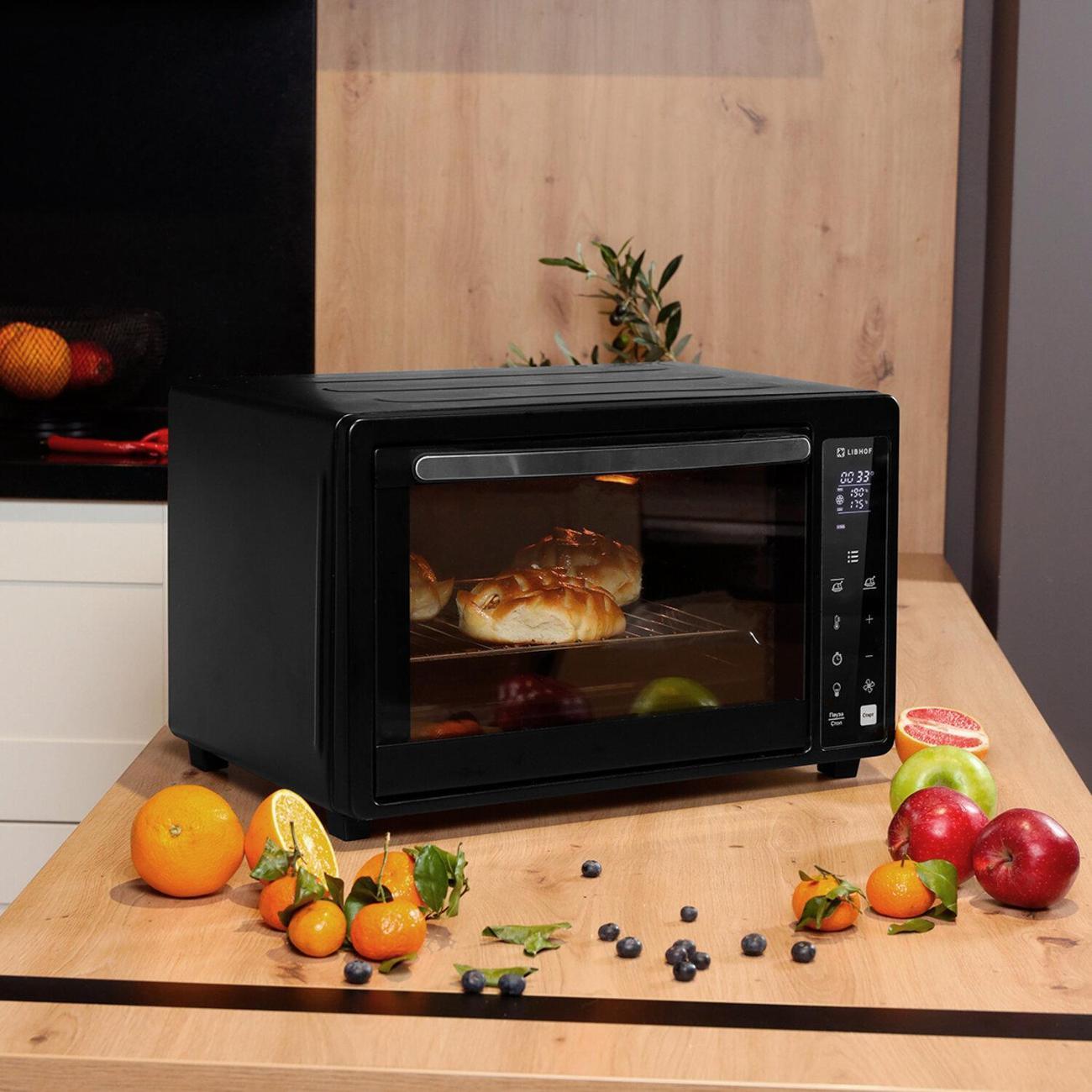 Черная мини-печь Libhof OVX-46 при габаритах 35,7х56,5х41,2 см и весе 8,3 кг вмещает 46 л. Модель управляется при помощи сенсорной панели с поддержкой 12 автоматических программ, звуковым сигналом, таймером и индикацией, оповещающей о включении и выбранной температуре. Устройство питается от сети посредством 0,8 м кабеля и потребляет 1800 Вт. Предусмотрен гриль, конвекция, функция предварительной разморозки и нагрев до максимальных 230°С.