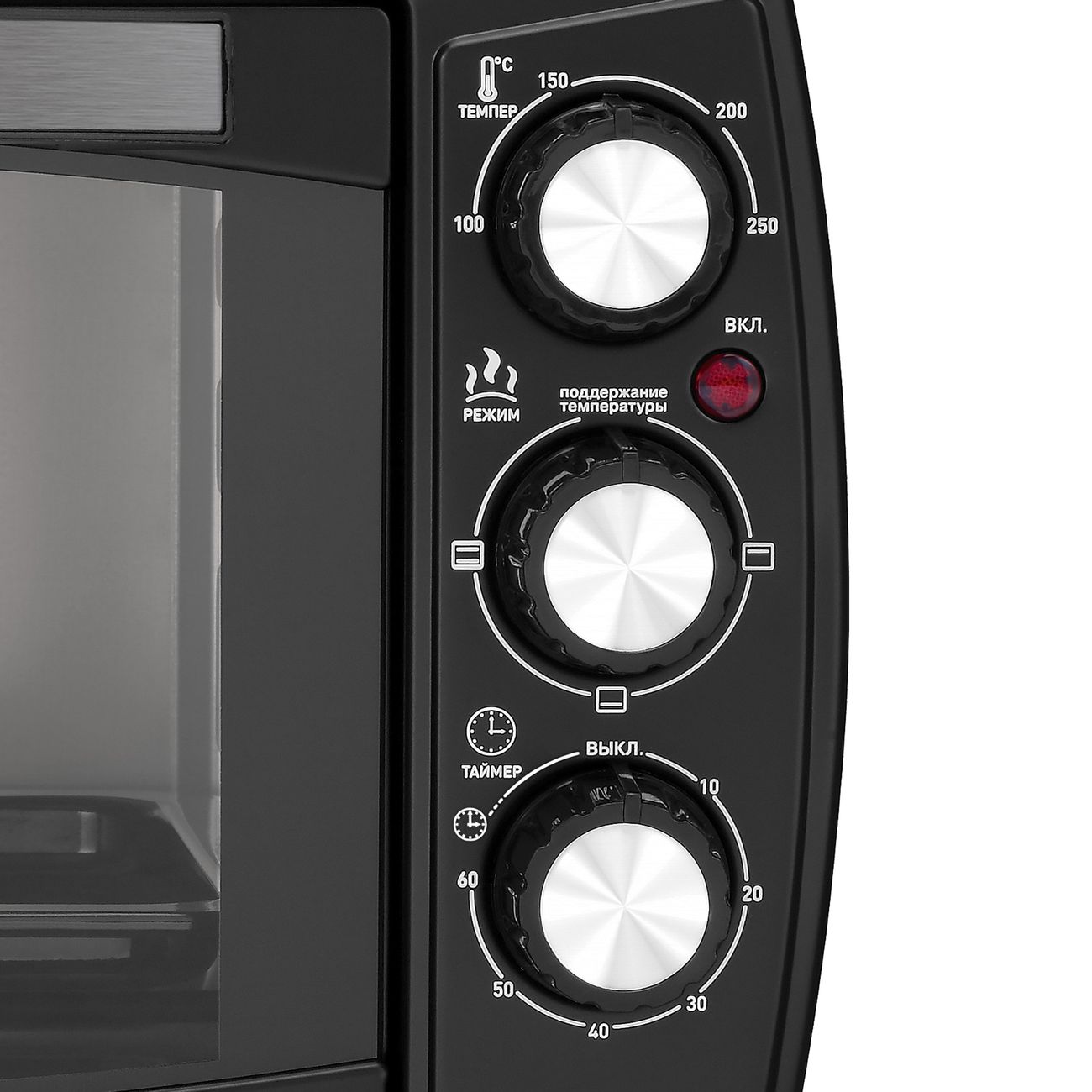 Объем камеры печи Maxwell MW-1855 составляет 18 л. Ее размеры — 29 х 44 х 33 см, вес — 4,6 кг. Система управления — механическая. Поворотные регуляторы на передней панели позволяют выбрать один из четырех рабочих режимов, настроить температуру и задать время приготовления с помощью таймера, рассчитанного максимум на 60 минут.