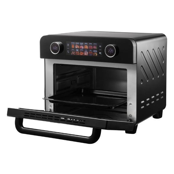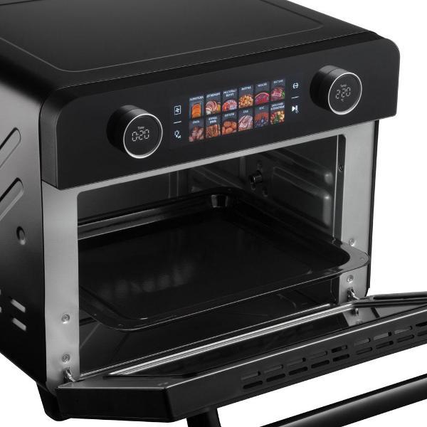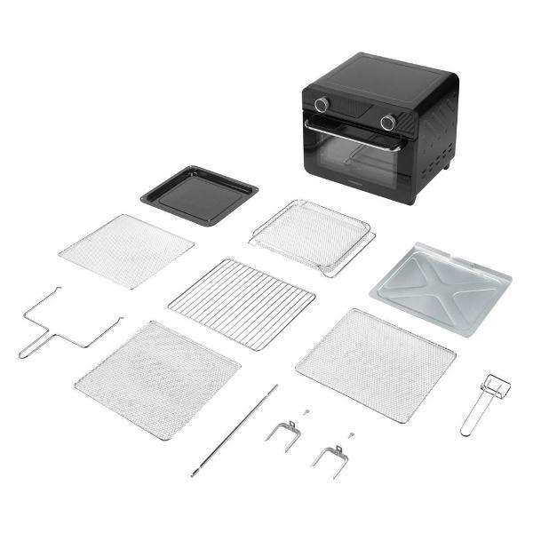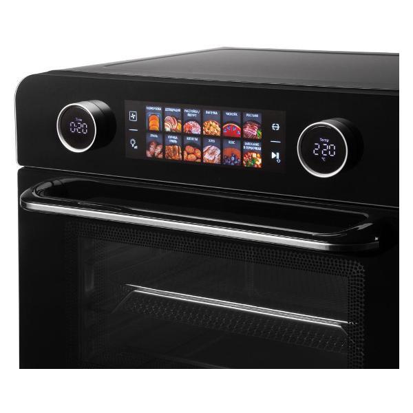 Вместе с прибором поставляется полный набор инвентаря: корзина для фритюра, решетка для гриля, вертел с ручкой для снятия, противень и поддон для крошек. Такое оснащение позволяет приступить к кулинарному творчеству сразу после распаковки. Дверца оснащена жаропрочным стеклом, а внутренняя подсветка помогает следить за готовностью блюда.