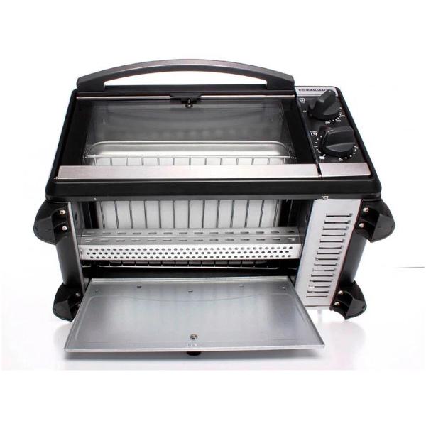 Максимальная температура в процессе эксплуатации может достигать 230°C. За счет нижнего и верхнего нагревов приготовление происходит равномерно. Управление производится посредством механических переключателей. Световые и звуковые сигналы оповещают об окончании готовки. Таймер дает возможность настраивать время работы (до 30 минут). В комплект входит решетка.