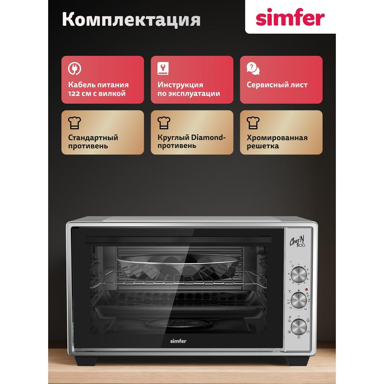 Мини-печь Simfer M50C05 оставила приятное впечатление после первых недель использования. Дизайн лаконичный, в классическом стиле, что делает её универсальной для любой кухни. Сборка качественная: корпус крепкий, переключатели не люфтят и поворачиваются с приятным сопротивлением.