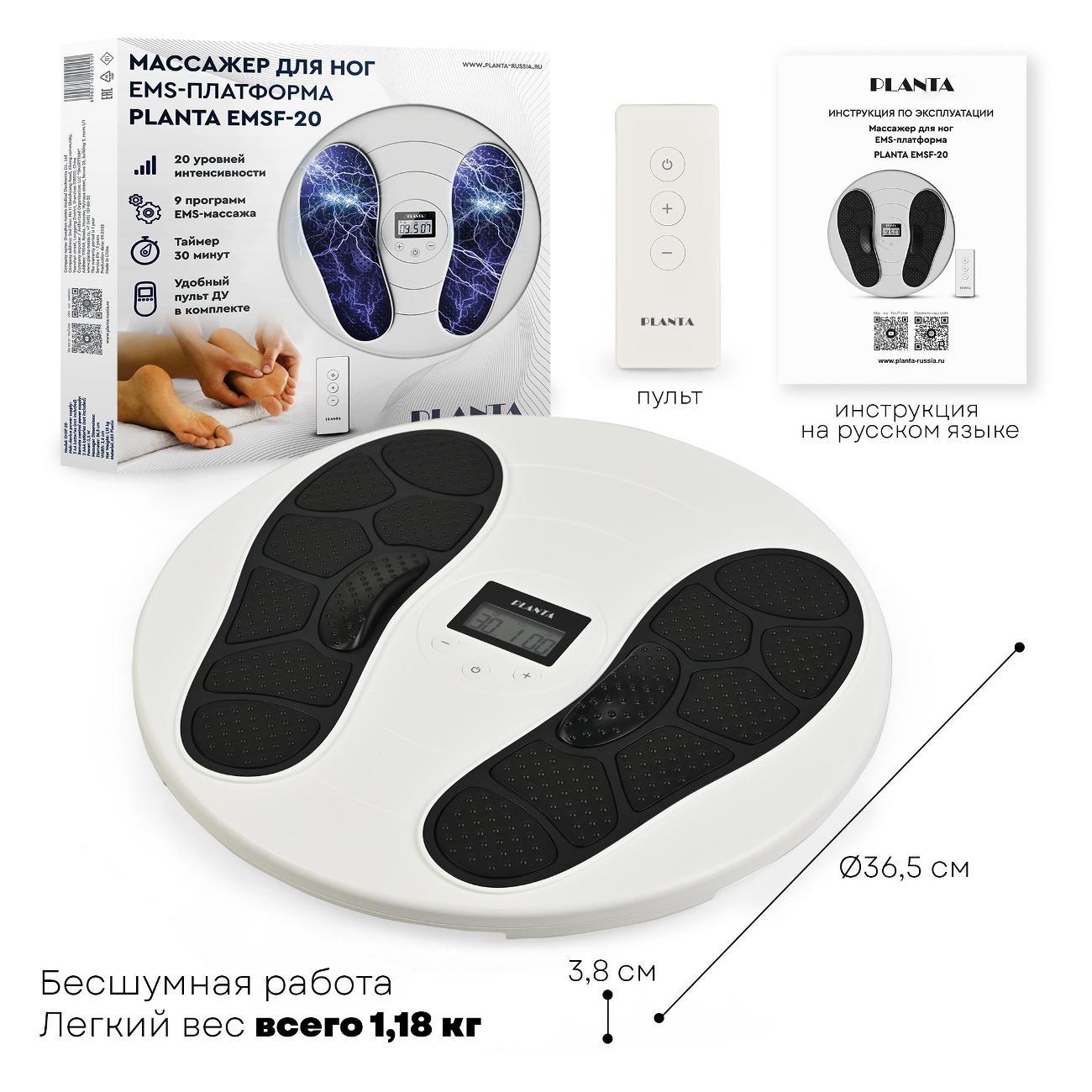 Портативный миостимулятор Planta EMSF-20, белый используется для массажа ступней путем стимуляции кровообращения. Процесс стимуляции мышц и нервных окончаний происходит посредством передачи импульсного тока к телу человека через электроды (в комплекте два). Максимальное время непрерывной работы не должно превышать 30 минут.