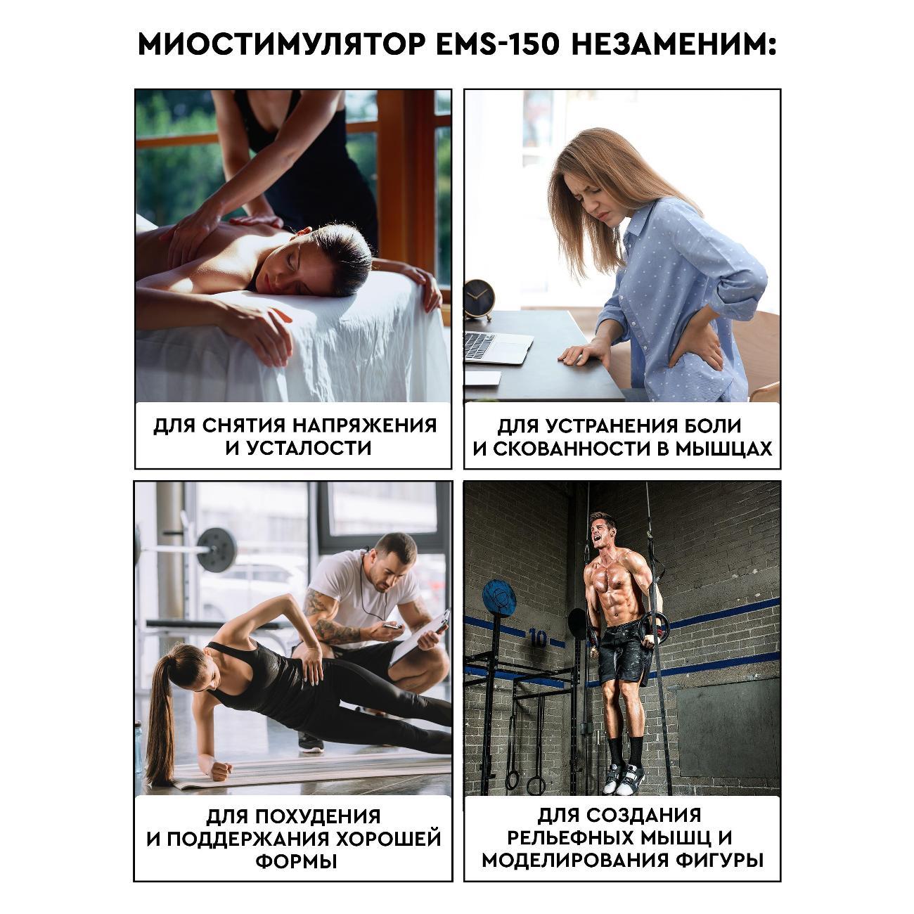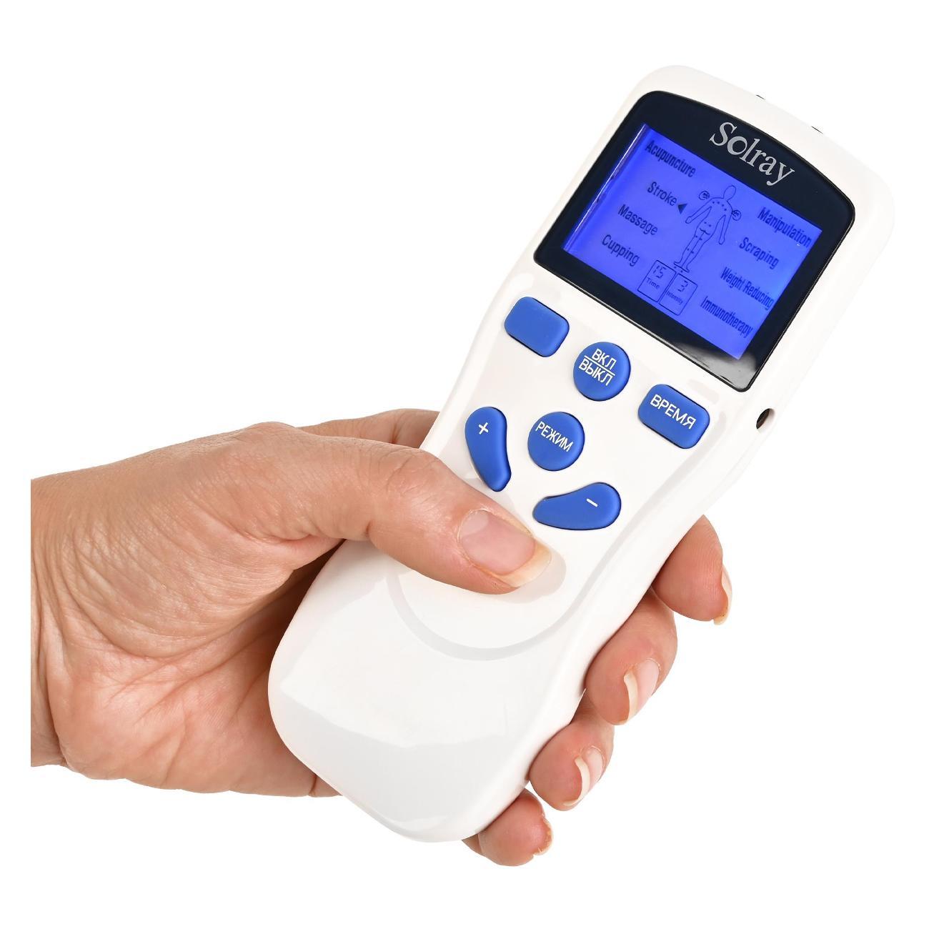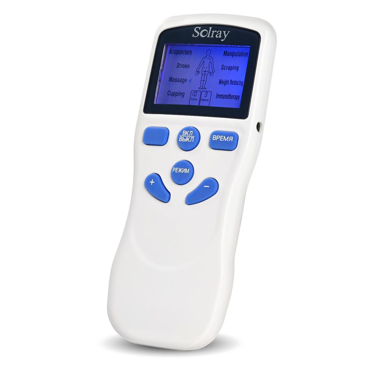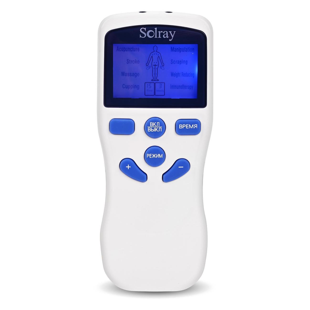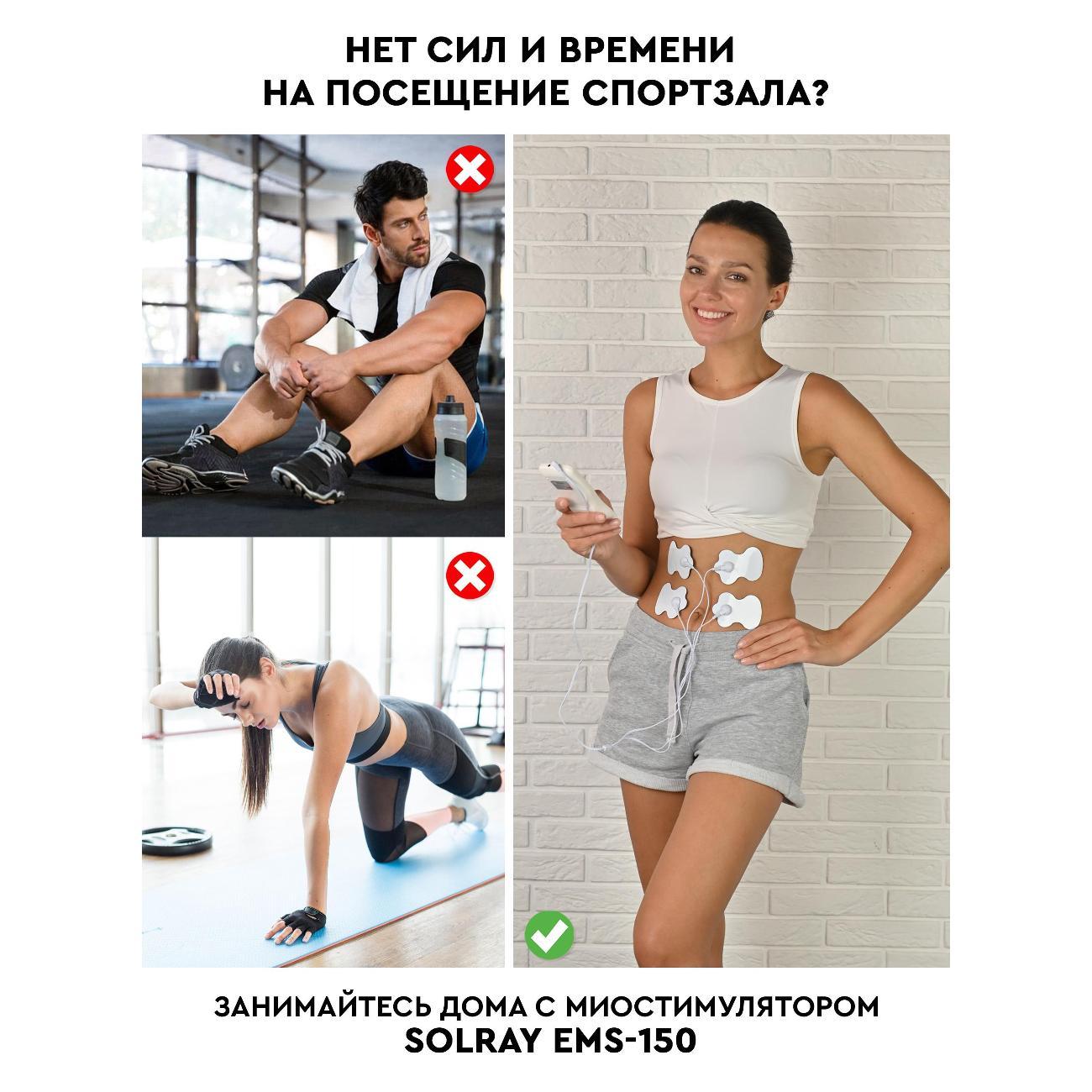 Миостимулятор Solray EMS-150 — компактный электротренажер для тела. Устройство с помощью импульсов стимулирует мышцы и нервные окончания. К двум каналам можно подсоединять одновременно восемь электродов. Устройство подходит для проработки пресса, массажа плеч, шеи, спины. Оно работает на 15 уровнях интенсивности, в него заложены восемь режимов, в числе которых воздействие в виде постукивания, толчков, растирания, разминания.