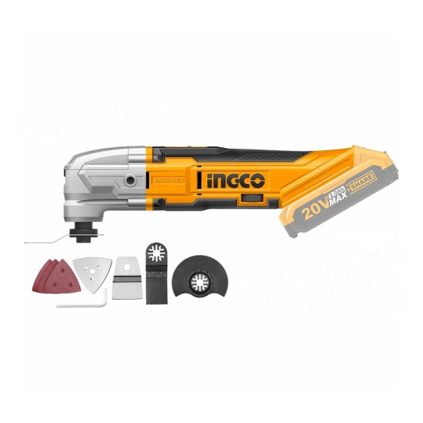 Реноватор Ingco CMLI2001 — многофункциональный инструмент, получающий питание от литий-ионного аккумулятора напряжением 20 В. Устройство работает от щеточного двигателя и подходит для резки гипсокартона, дерева и других твердых материалов, включая металл. Есть возможность изменить скорость колебаний режущего материала от 5000 в минуту до 20000 в минуту. Угол колебаний составляет 3,2°. В комплект поставки включены шестигранный ключ диаметром 5 мм, пильный диск размером 95х32 мм по дереву, пильный диск диаметром 85 мм по металлу, скребок размером 79х52 мм, шлифовальные листы и подошва для шлифовки треугольной формы.