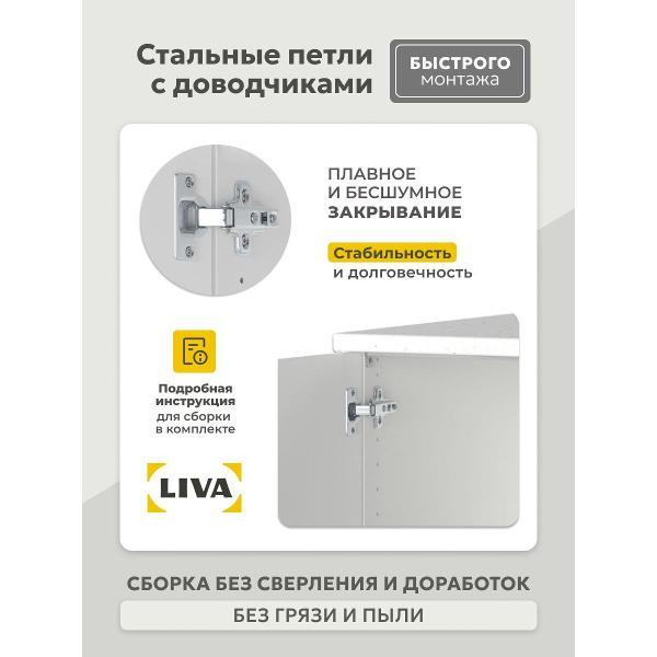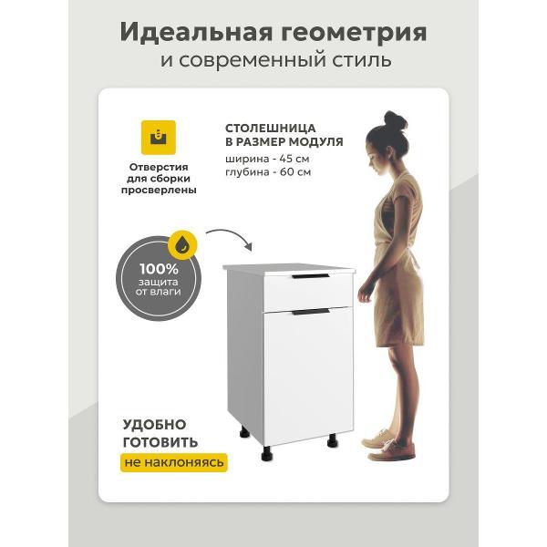 ЛДСП-столешница толщиной 19 мм в цвете «Гранит Фарфоровый», а также стальные петли быстрого монтажа с доводчиками и лаконичная ручка идут в комплекте. Ножки – пластиковые, их высота регулируется от 9,5 см до 16 см, что позволяет нивелировать неровности основания пола. Задняя стенка кухонного нижнего шкафа выполнена из ДВП, изнутри окрашена, снаружи – лакирована.