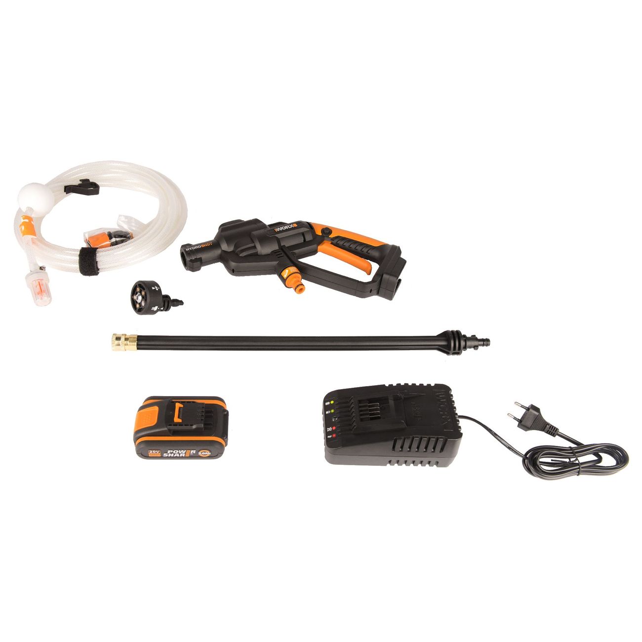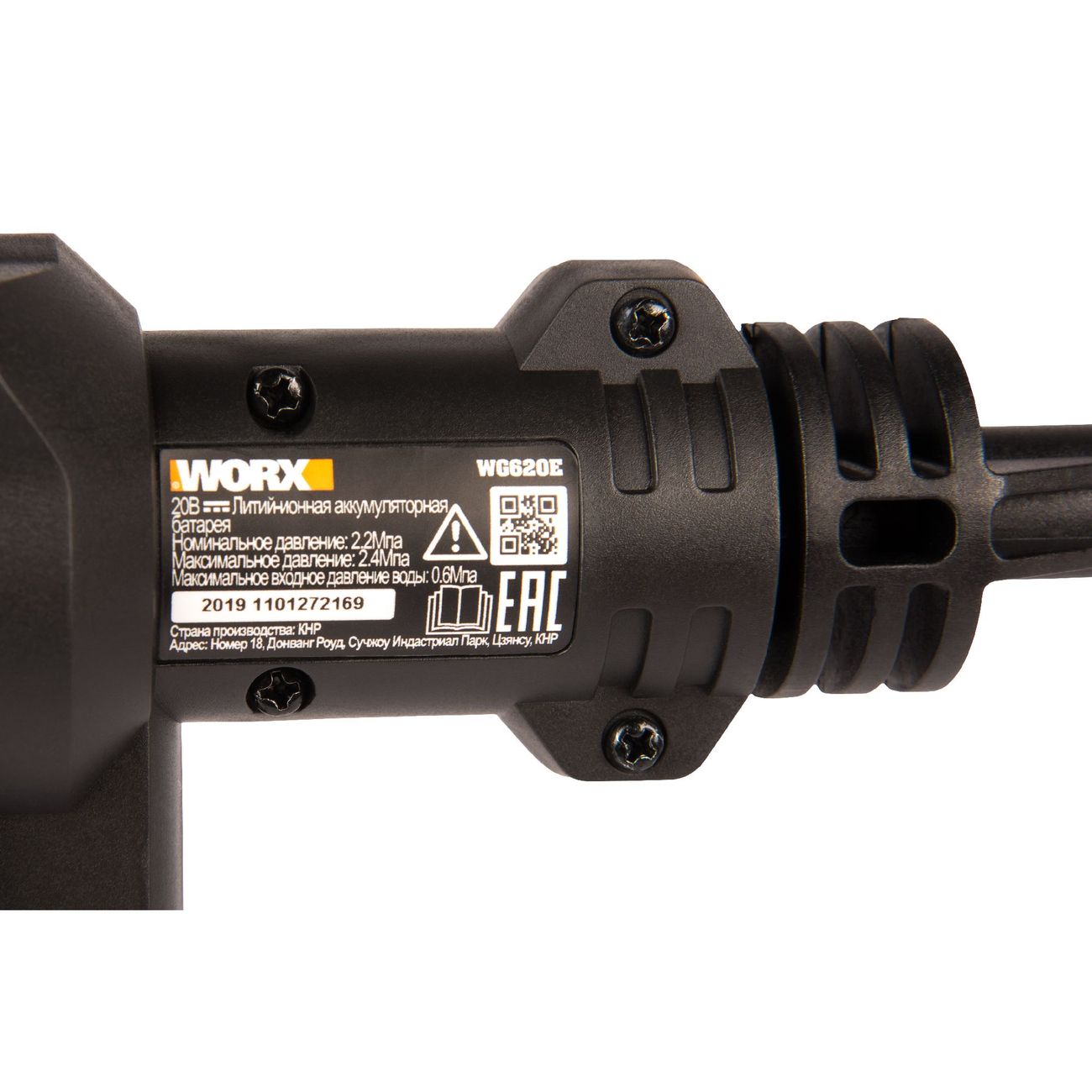 Worx WG620E — мойка высокого давления с максимальной мощностью 24 бар. В модели установлен бесщеточный двигатель. Функция самовсасывания обеспечивает забор воды из любого источника, в том числе из крана, ведра или водоема.