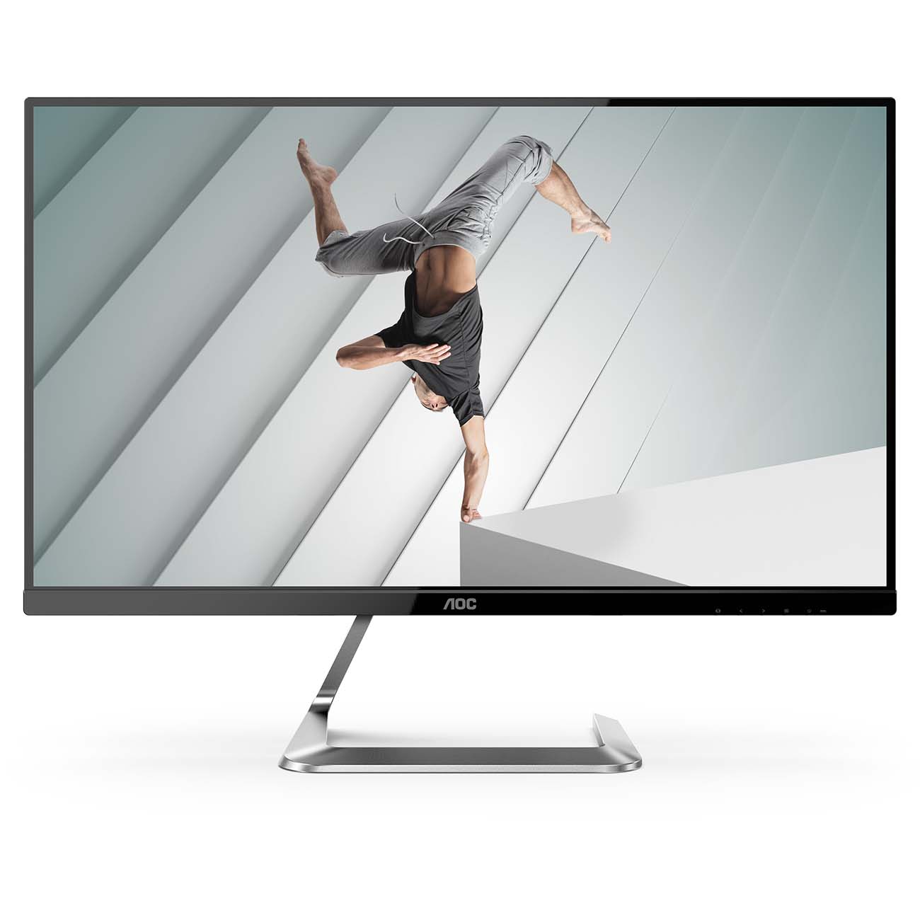 Модель привлекает внимание тонкой цельнометаллической подставкой серебристого цвета. Семь резиновых ножек надёжно фиксируют её на поверхности и предохраняют рабочий стол от царапин. Конструкция позволяет наклонять корпус, но возможность регулировать по высоте и в разных плоскостях отпадает. Тонкие рамки экрана визуально расширяют его пространство. На нижней грани размещены кнопки навигации по меню.