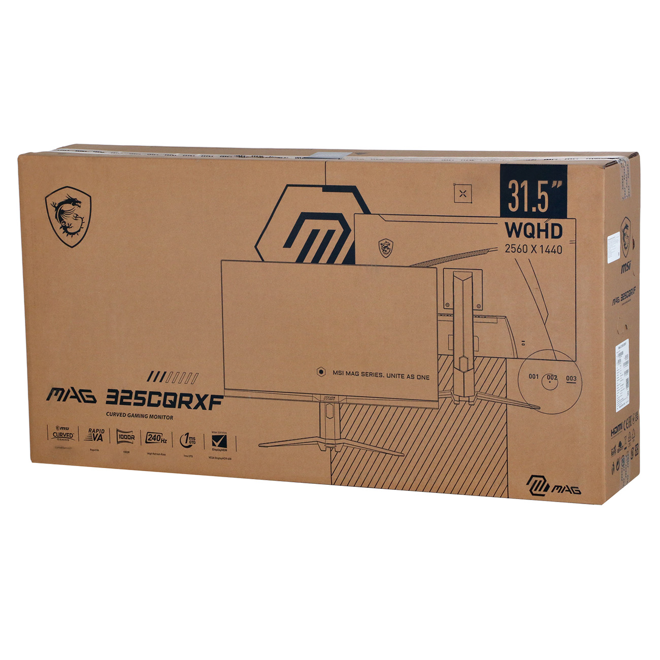 Черный монитор игровой MSI MAG 325CQRXF представлен в габаритных размерах 57,9х70,1х27 см (с подставкой) и 42,8х70,1х11,2 см (без подставки). Масса — 7,8 кг. Изогнутый экран 16:9 с покрытием Anti-glare выполнен по технологии DisplayHDR и обладает яркостью 400 кд/м². Диагональ составляет 80,1 см. Матрица VA с частотой 240 Гц оснащена разрешением 256х1440 Пикселей со временем отклика 1 (GTG) м/сек.