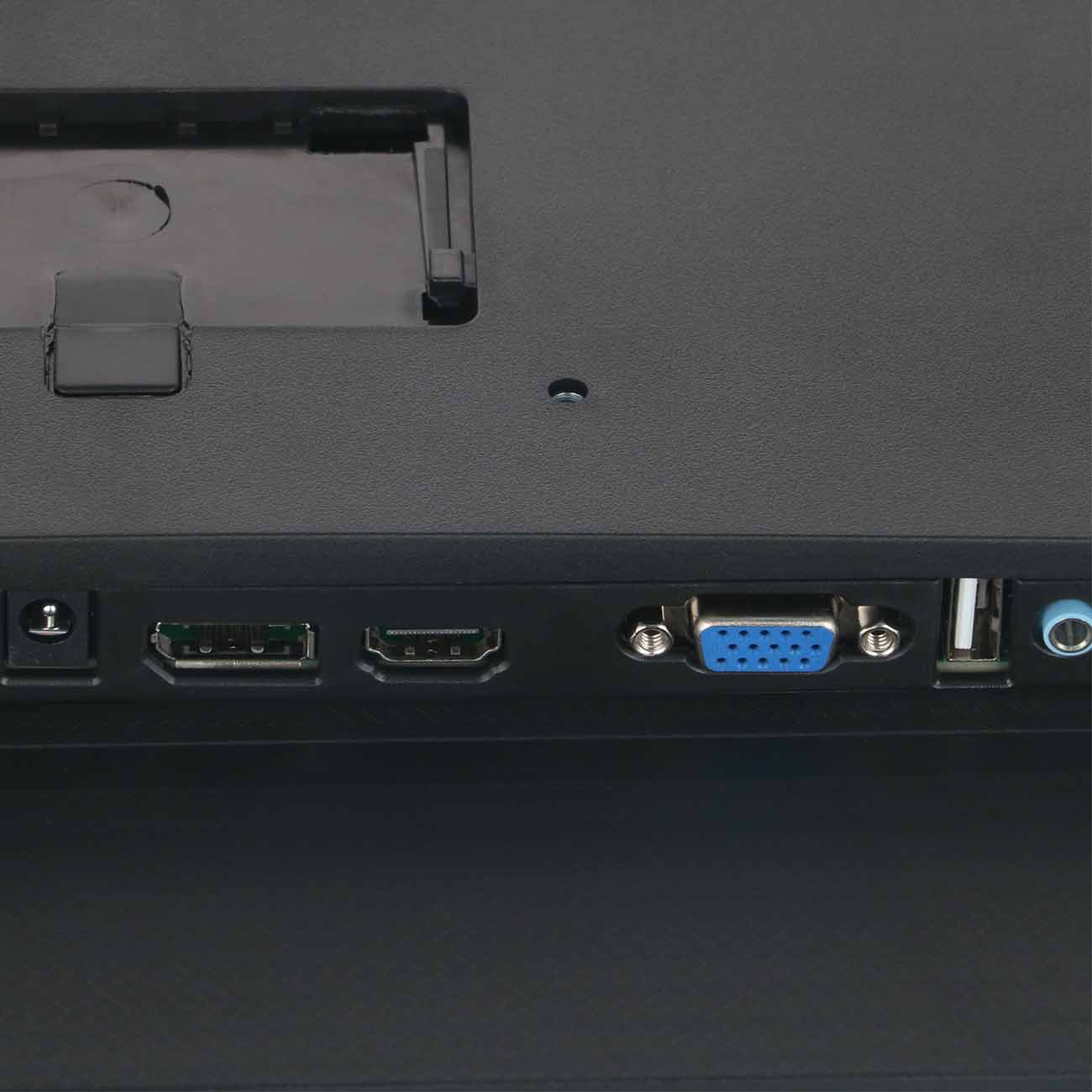 На тыльной стороне корпуса располагаются интерфейсы подключения: D-Sub, DisplayPort, HDMI и порт USB Type-A версии 2.0. Предусмотрена встроенная акустическая система.