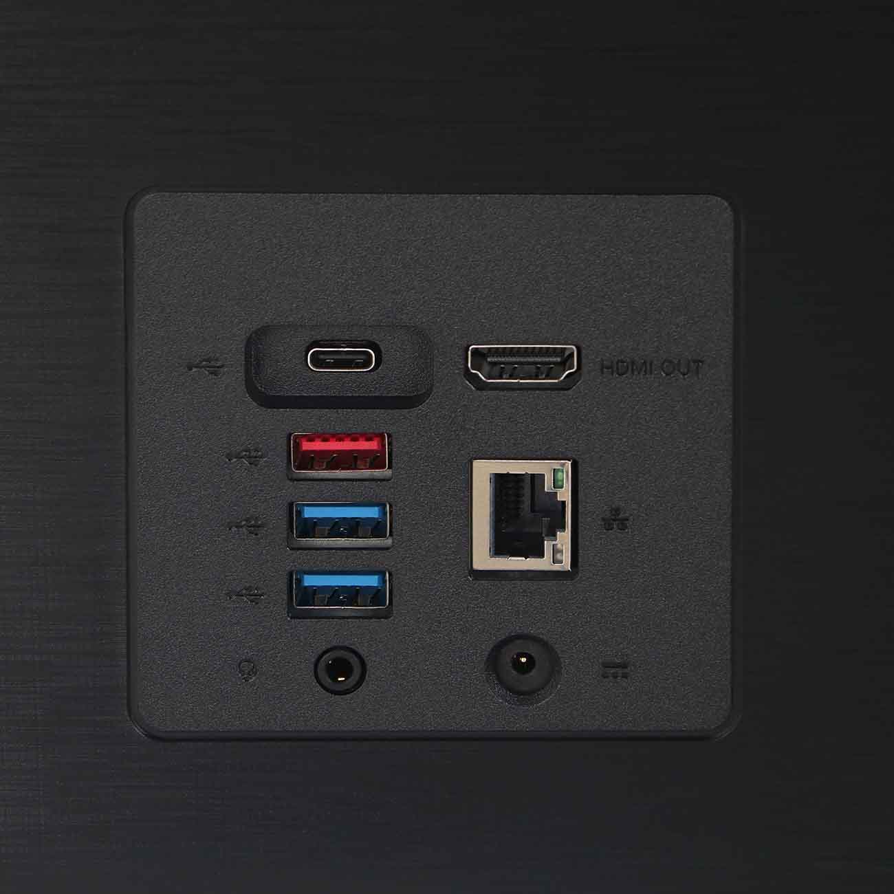 На задней панели моноблока расположены разъемы RJ-45, USB 2.0 Type-A, USB 3.2 Gen 1 Type-A (три), USB 3.2 Gen 1 Type-C, HDMI, выход для аудио/наушников. Приемники Wi-Fi 802.11 ax и Bluetooth 5.0 поддерживают защищенное беспроводное подключение к совместимым устройствам. В комплекте — адаптер 135 Вт, беспроводные клавиатура и манипулятор, руководство по эксплуатации.