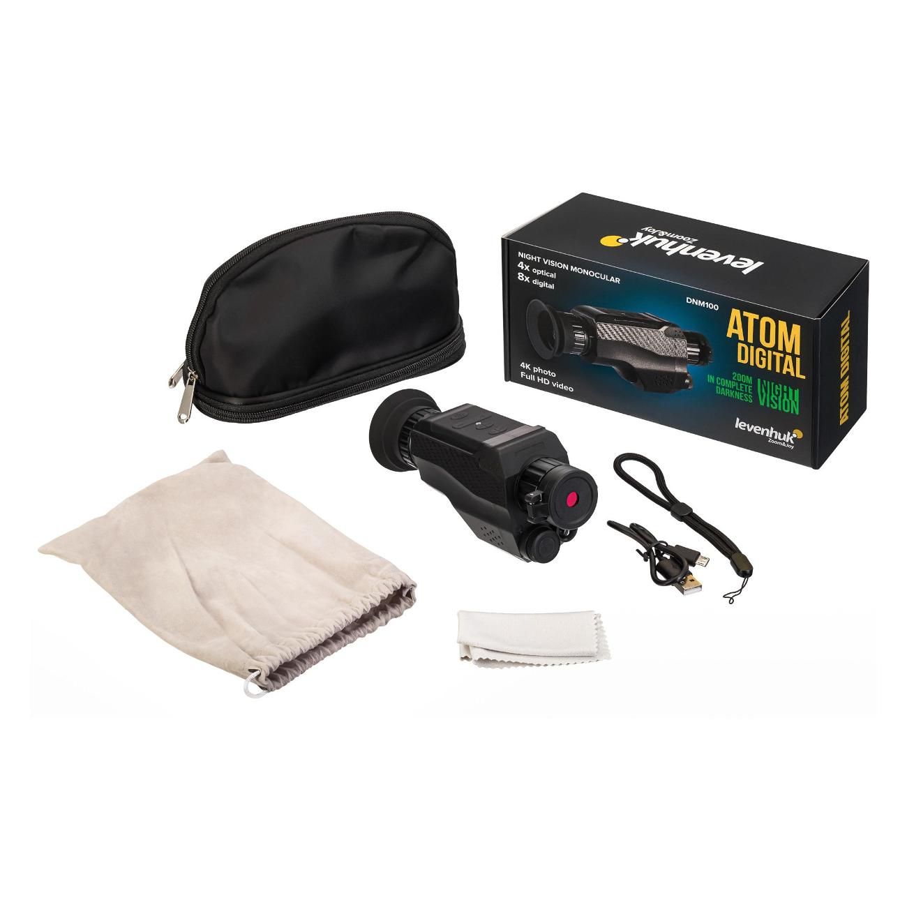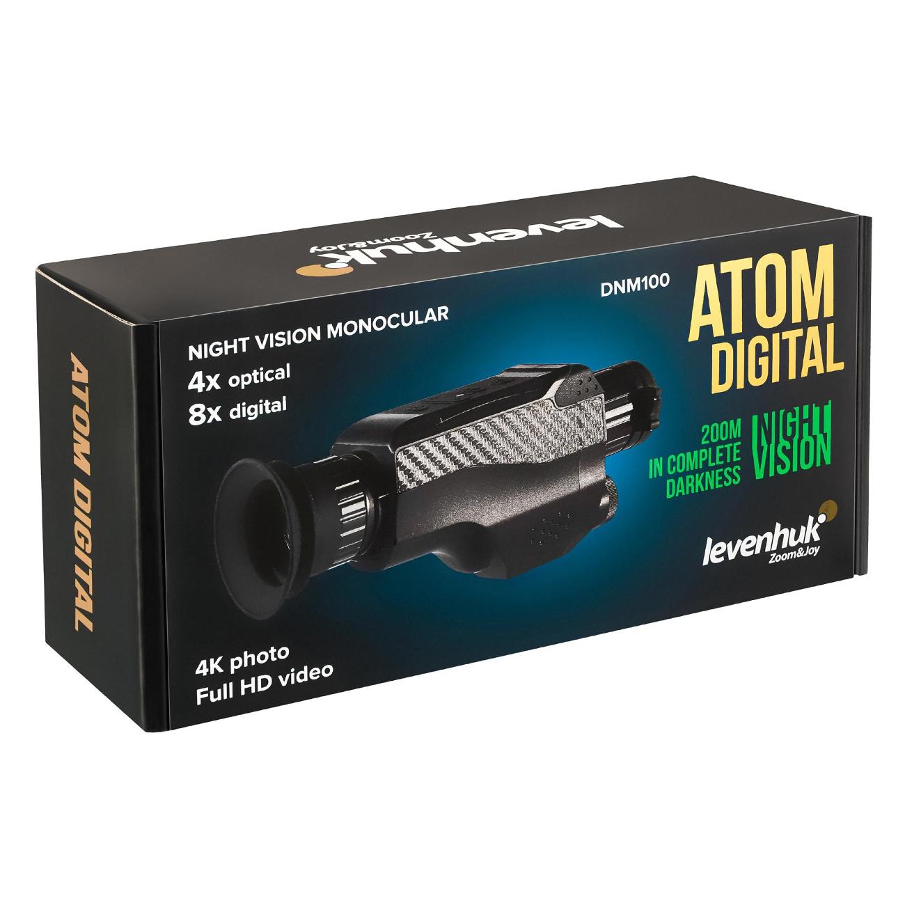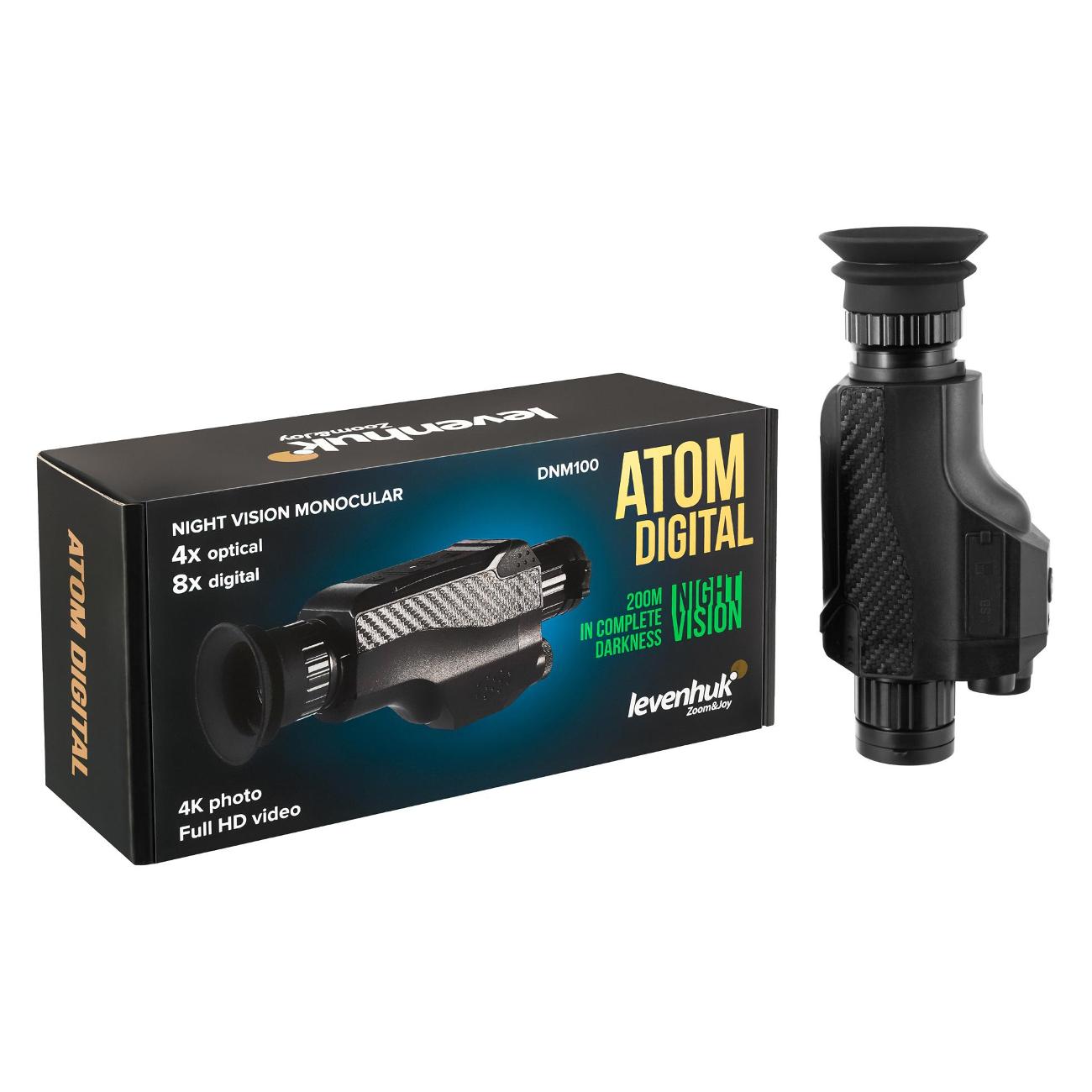 Монокуляр черного цвета Levenhuk Atom Digital DNM100 изготавливается в корпусе из пластика. Максимальная кратность — до 8х. Диаметр объектива — 35 мм, выходного зрачка — 1,54 мм. Минимальная фокусировка достигает 10 м. Доступна возможность фото в качестве 4К и видео в Full HD.