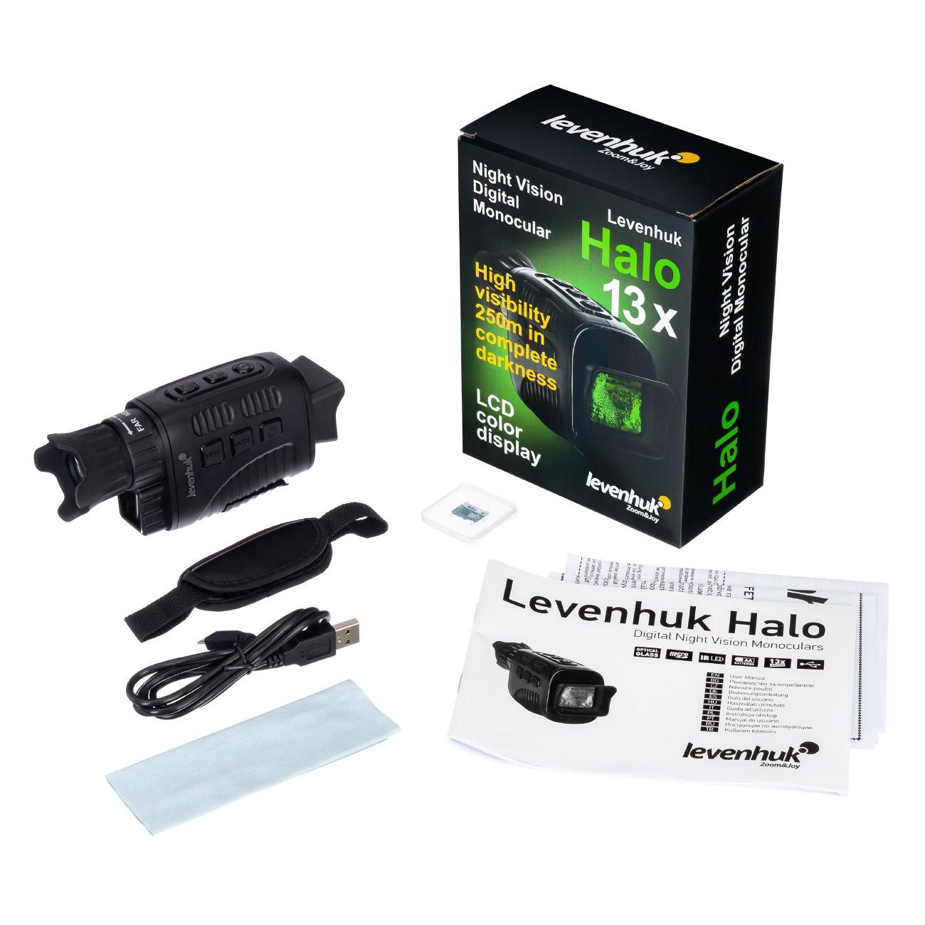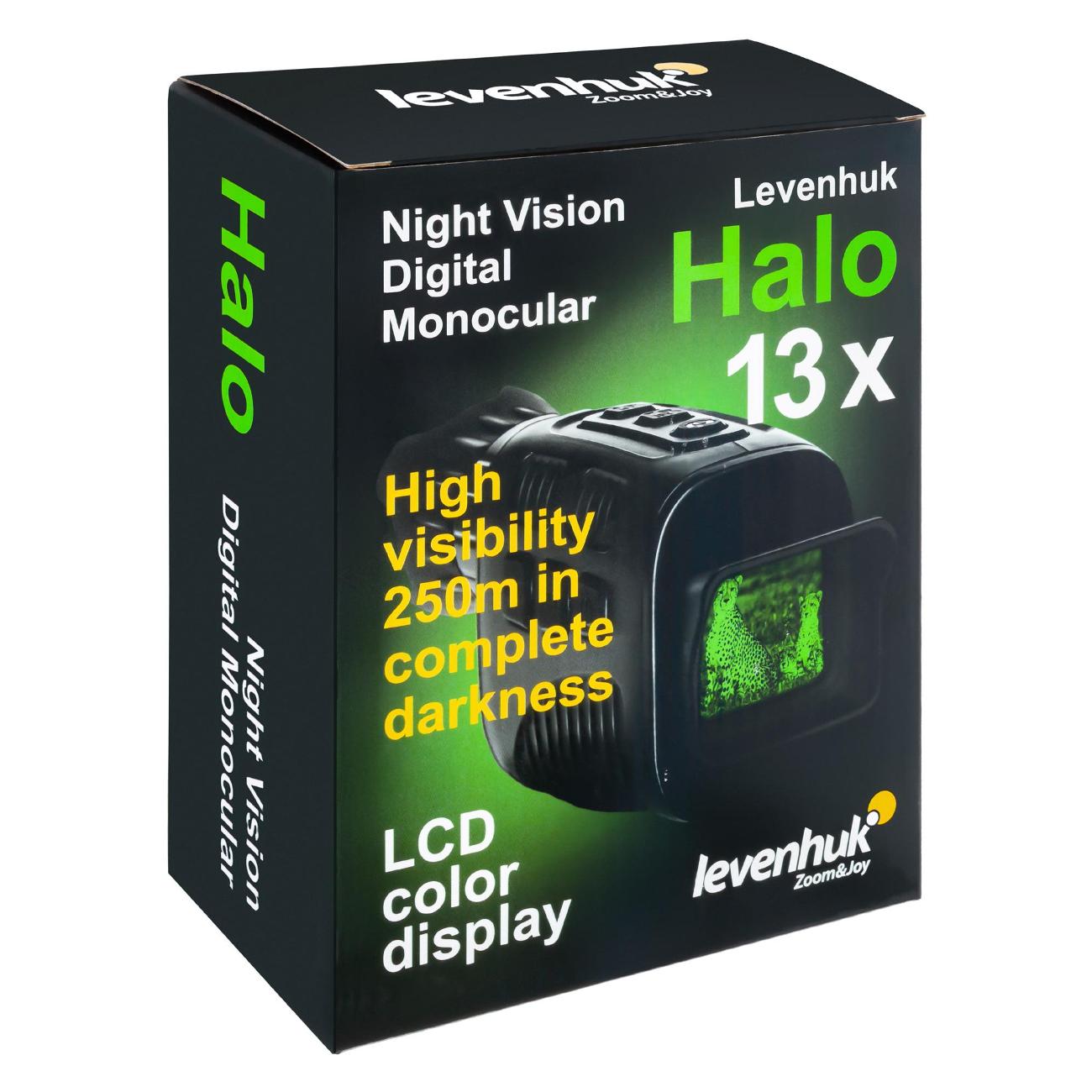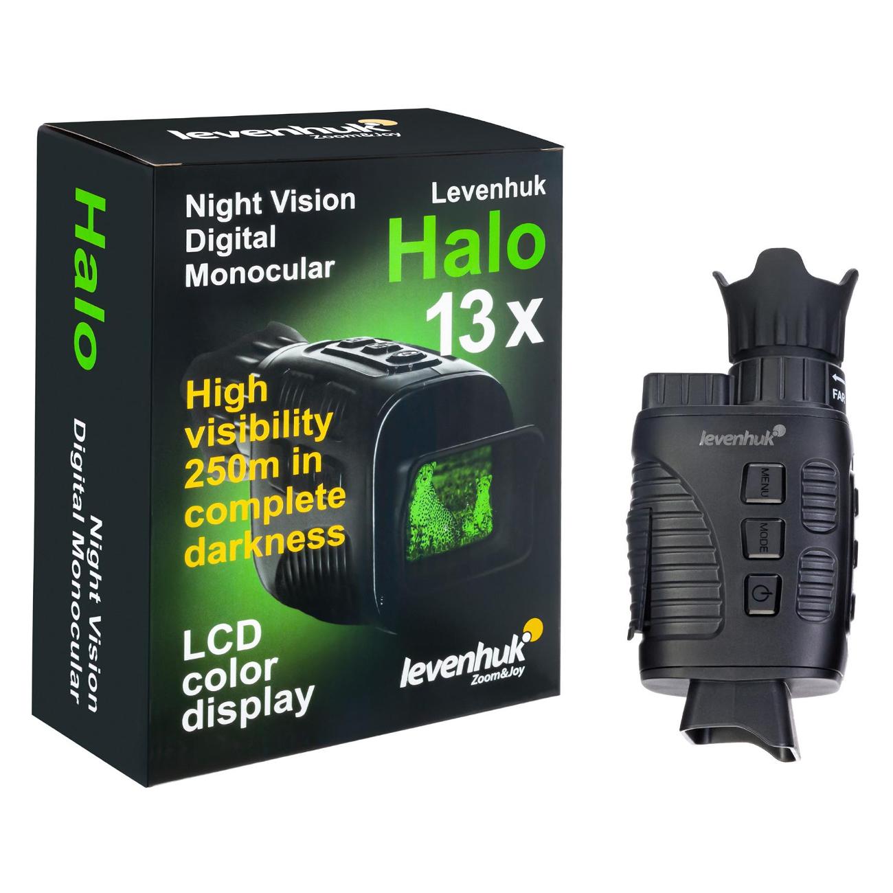 Монокуляр черного цвета Levenhuk Halo 13X выполнен в пластиковом корпусе. Максимальная кратность составляет 4х. Диаметр объектива — 33,5 мм, выходного зрачка — 1,2 мм. Минимальная фокусировка — до 3 м. Прибор может работать в автономном режиме до 10 часов. Питание осуществляется от стандартных батареек типа АА. Подходит как для фото, так и для видео.