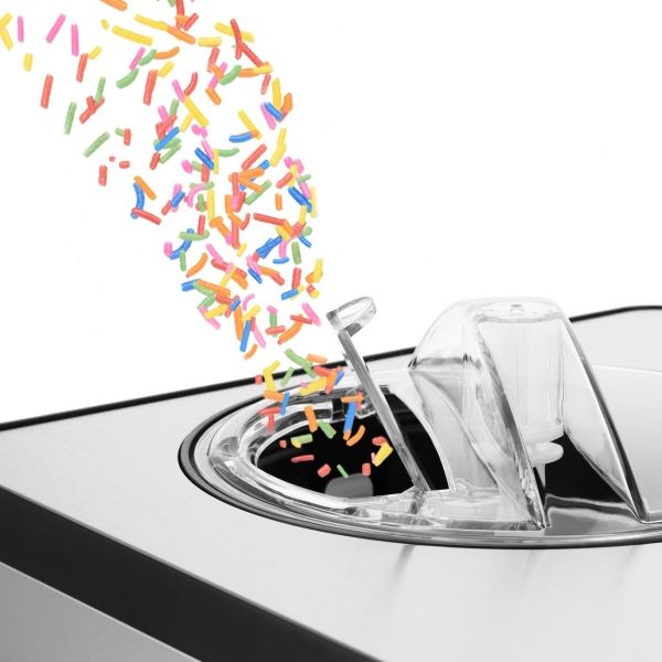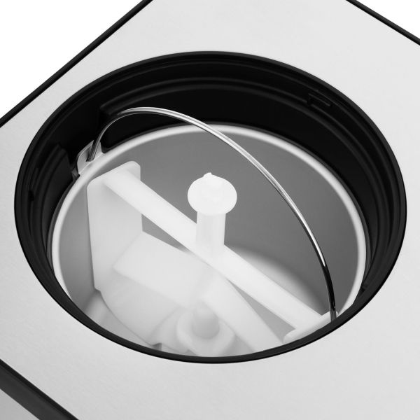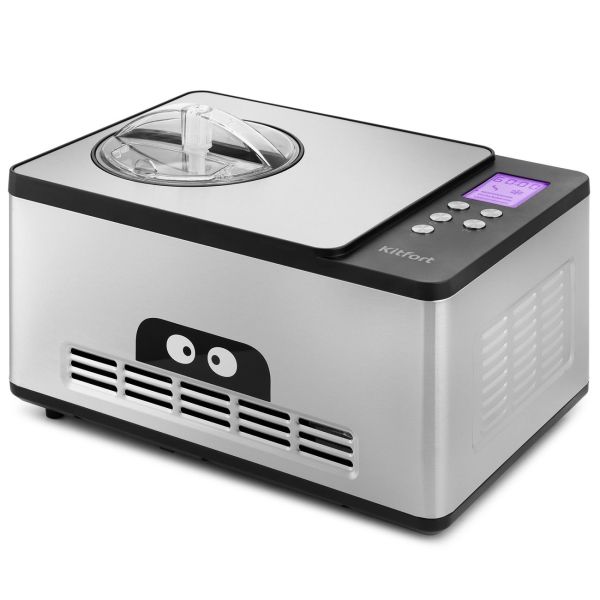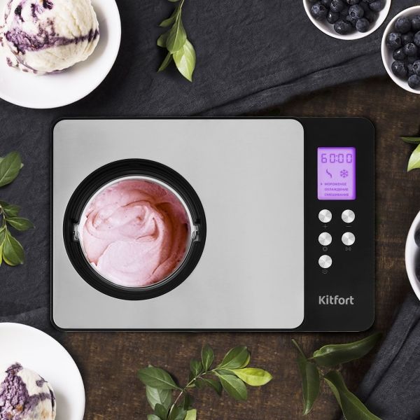 Плотно закрывающаяся крышка предотвращает разбрызгивание содержимого в процессе работы лопасти. В ней есть отверстие, через которое в емкость можно добавлять ингредиенты, не останавливая процесс приготовления мороженого. Устройство дополнено дисплеем с фиолетовой подсветкой для отображения текущих параметров. Индикация сообщает о готовности прибора к работе, выбранном режиме работы и времени, которое осталось до завершения процесса. По окончании программы срабатывает звуковой сигнал. Корпус из пластика и нержавеющей стали дополнен прорезиненными ножками для большей устойчивости. В комплекте есть ложка. Размеры модели — 425х285х262 мм.