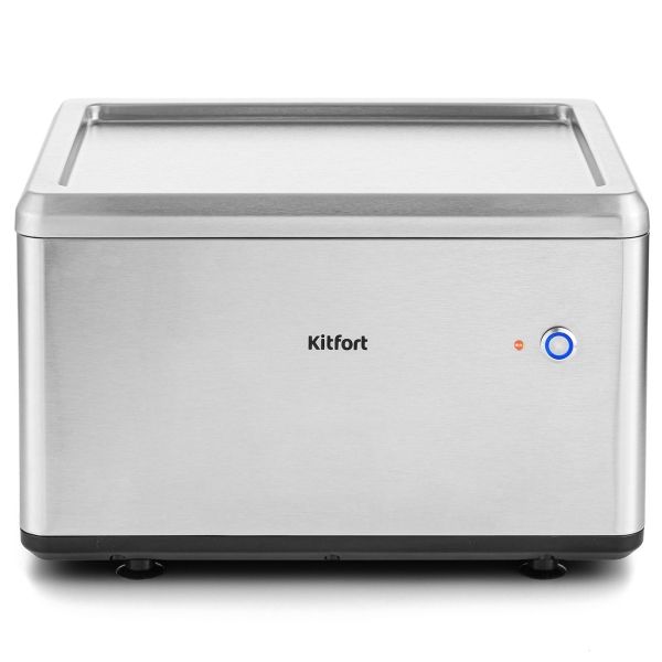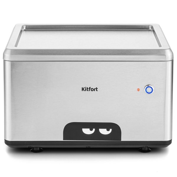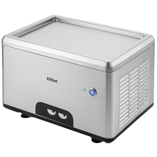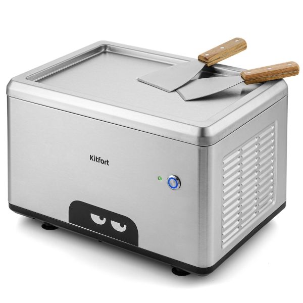 Мороженица Kitfort КТ-1821 подходит для приготовления «жареного» мороженого. Хладагентом выступает фреон R600a. После включения прибора металлическая поверхность охлаждается спустя 8-10 минут. Выступающие по краям листа стенки не позволяют содержимому вытечь. Управление осуществляется при помощи одной кнопки. Есть индикация: красный сигнал сообщает о том, что поверхность еще находится на стадии охлаждения, зеленый — техника готова к использованию.