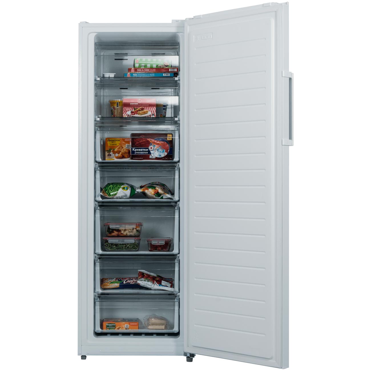 Для хранения продуктов устройство оснащёно семью отсеками: к вашим услугам шесть выкатных ящиков и один с откидной крышкой. Один из контейнеров увеличенного объёма, так что вы без труда найдёте место, например, для высокой коробки с тортом или большого окорока. В сутки можно «загрузить» до 15 кг свежих припасов. Яркая светодиодная подсветка поможет вам быстро найти всё, что нужно.