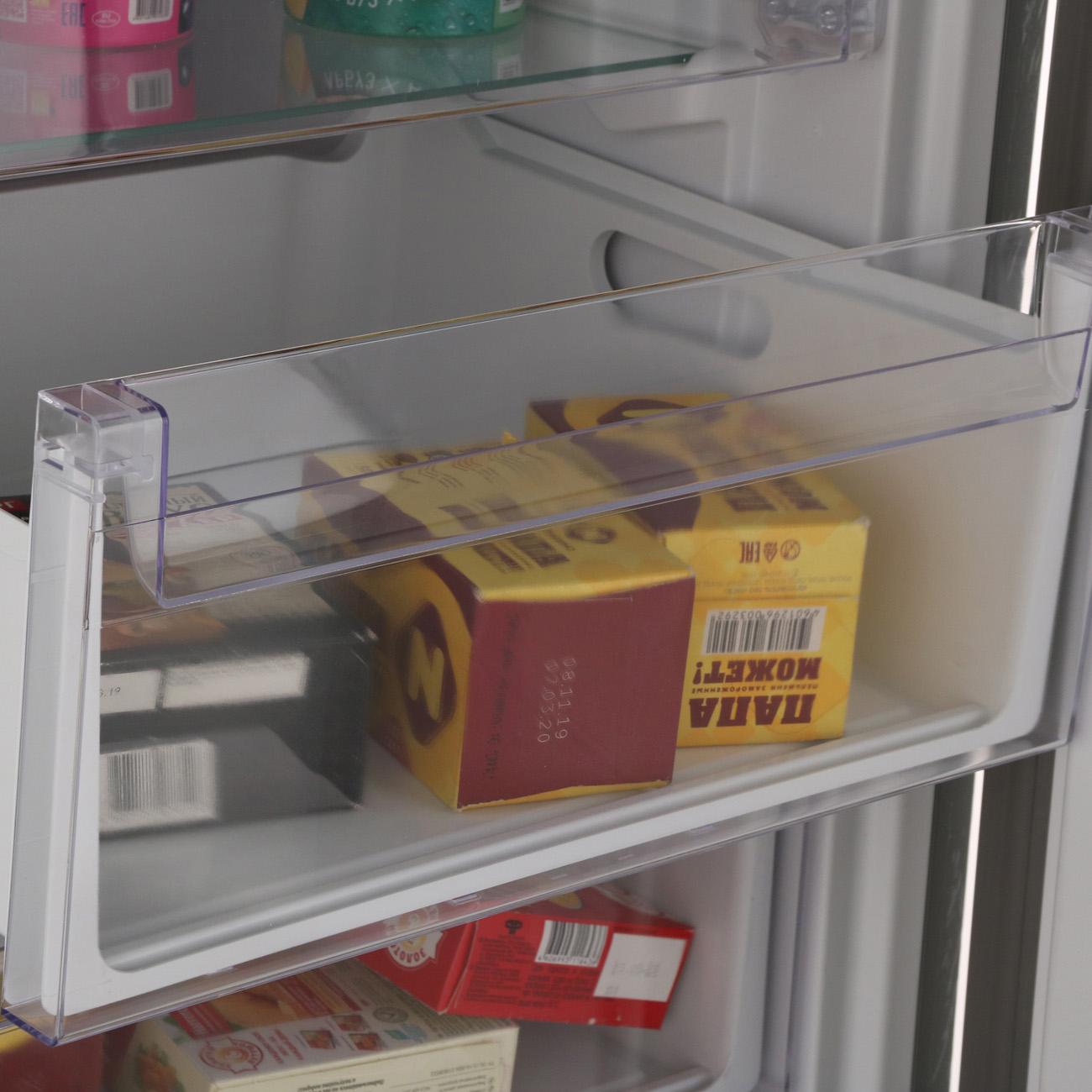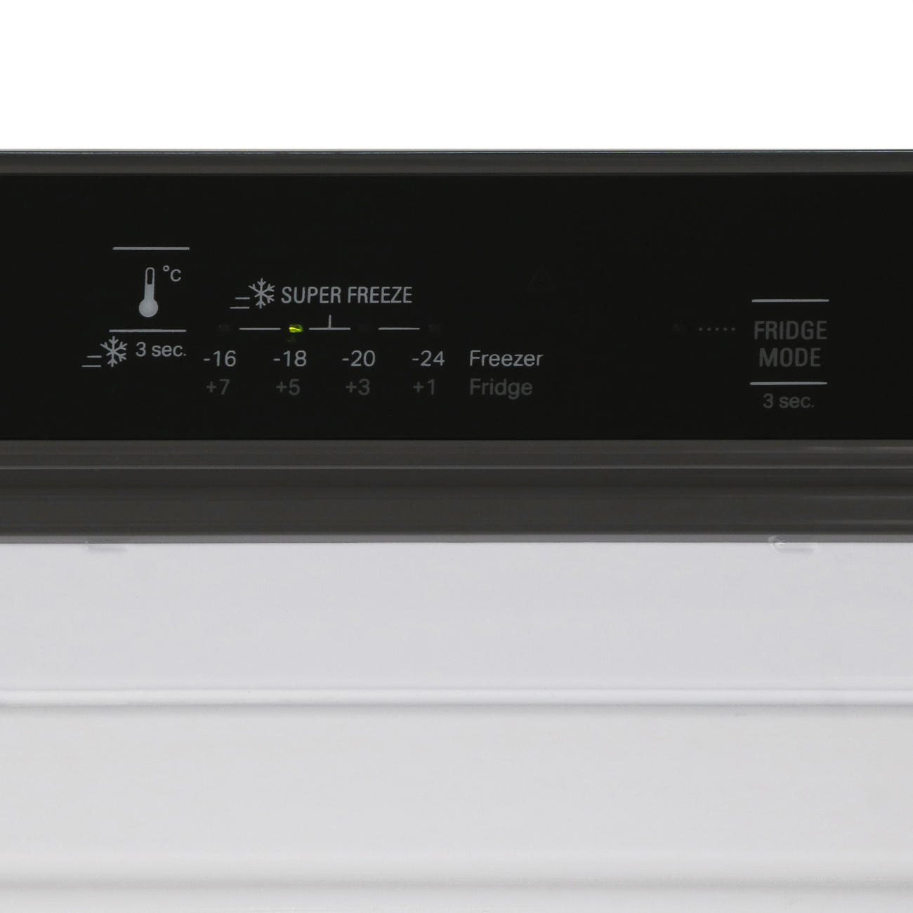 Электронная панель управления находится внутри, в верхней части корпуса и отображает актуальную температуру. Доступен режим суперзамораживания, который пригодится при крупной загрузке продуктов.