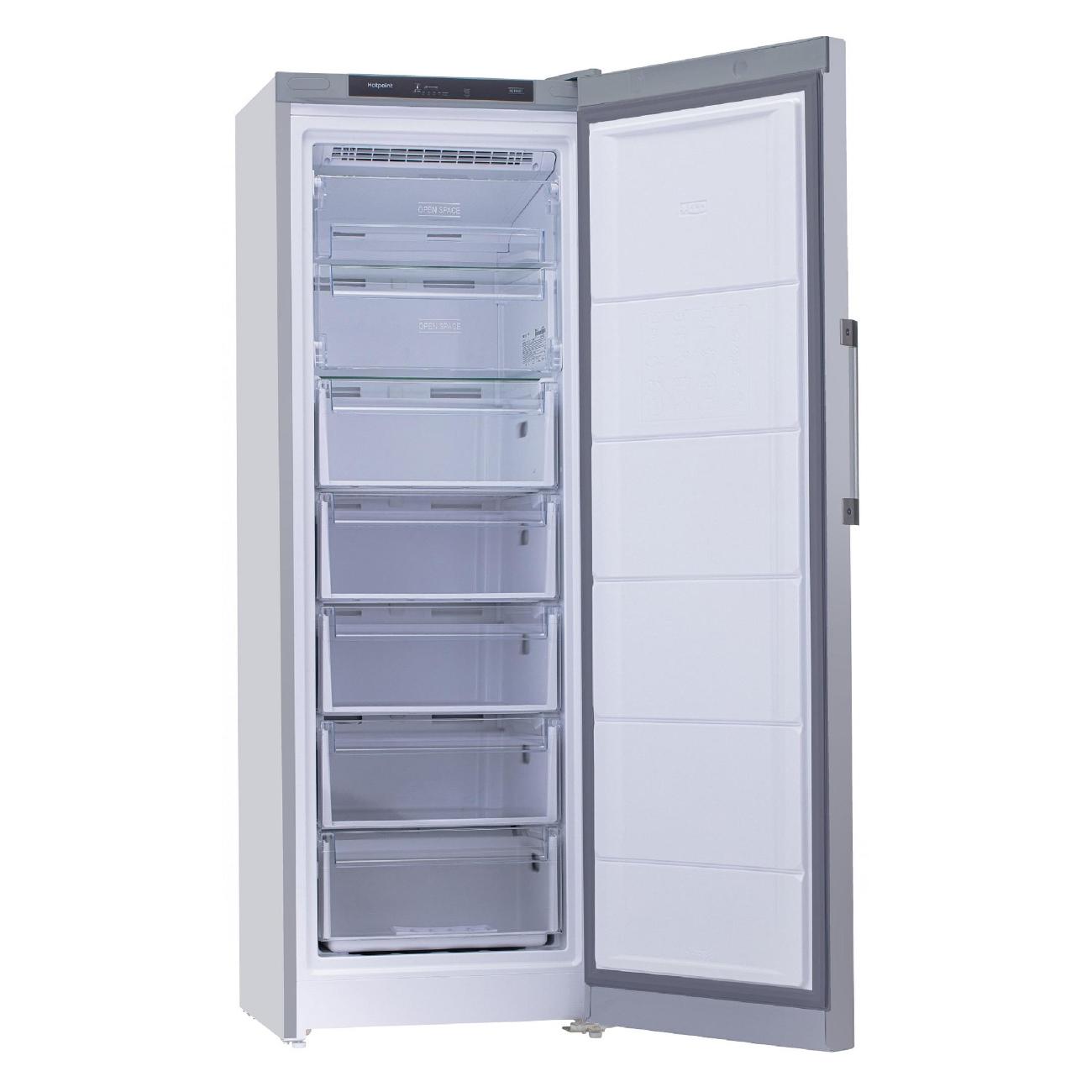 Морозильная камера Hotpoint HFZ 5171 S, серебристая, обладает общим объемом 275 л (полезный — 250 л) и способна заморозить до 12 кг продуктов в сутки.