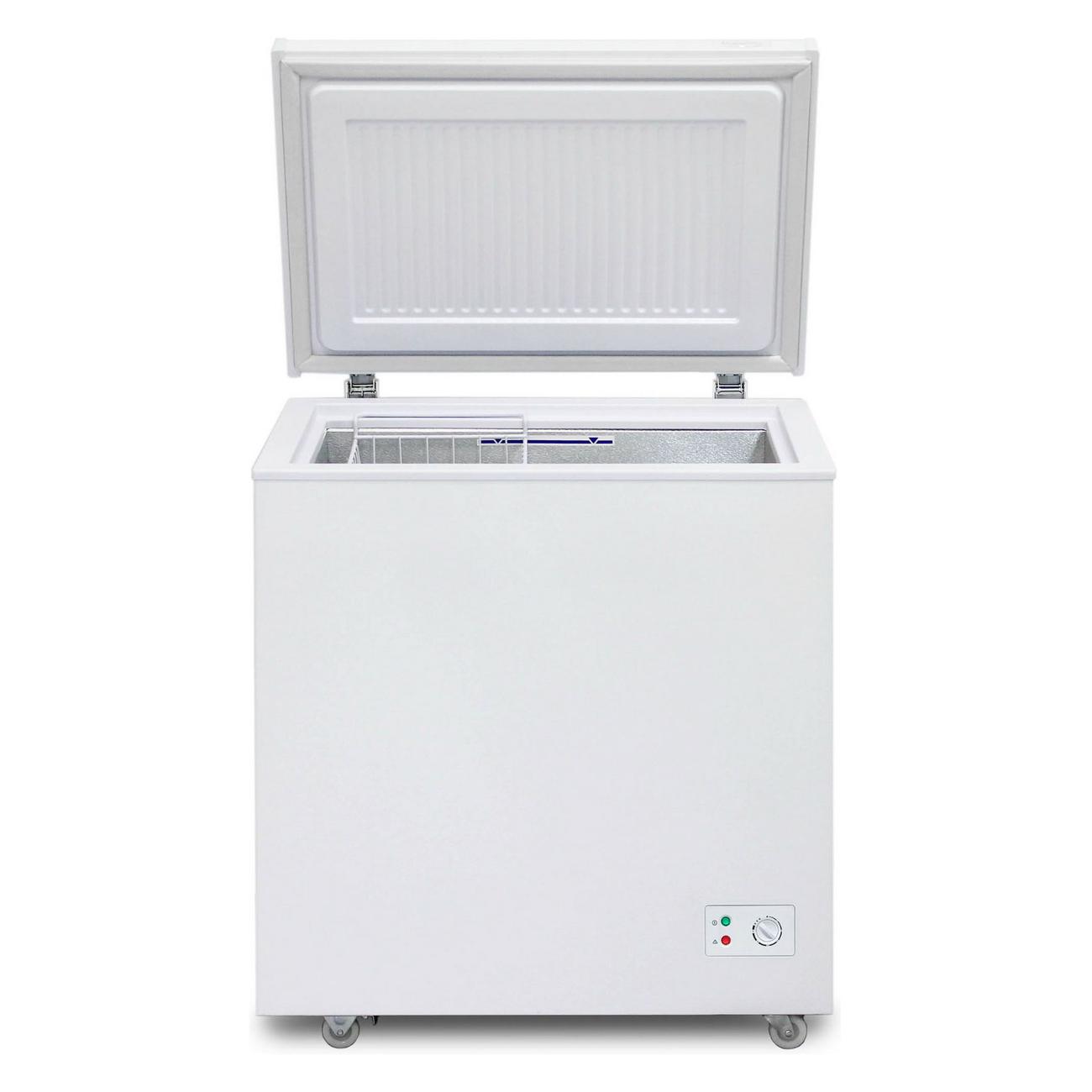 Прибор оснащен механической панелью управления, есть световые индикаторы работы устройства. О повышении температуры сообщают световой и звуковой сигналы. Годовое потребление электричества — 365 кВт*ч, что соответствует классу энергоэффективности А. Во время использования уровень шума не превышает 43 дБ. Морозилка укомплектована подвесной корзиной. Транспортировочные колеса позволяют без усилий перемещать ларь.