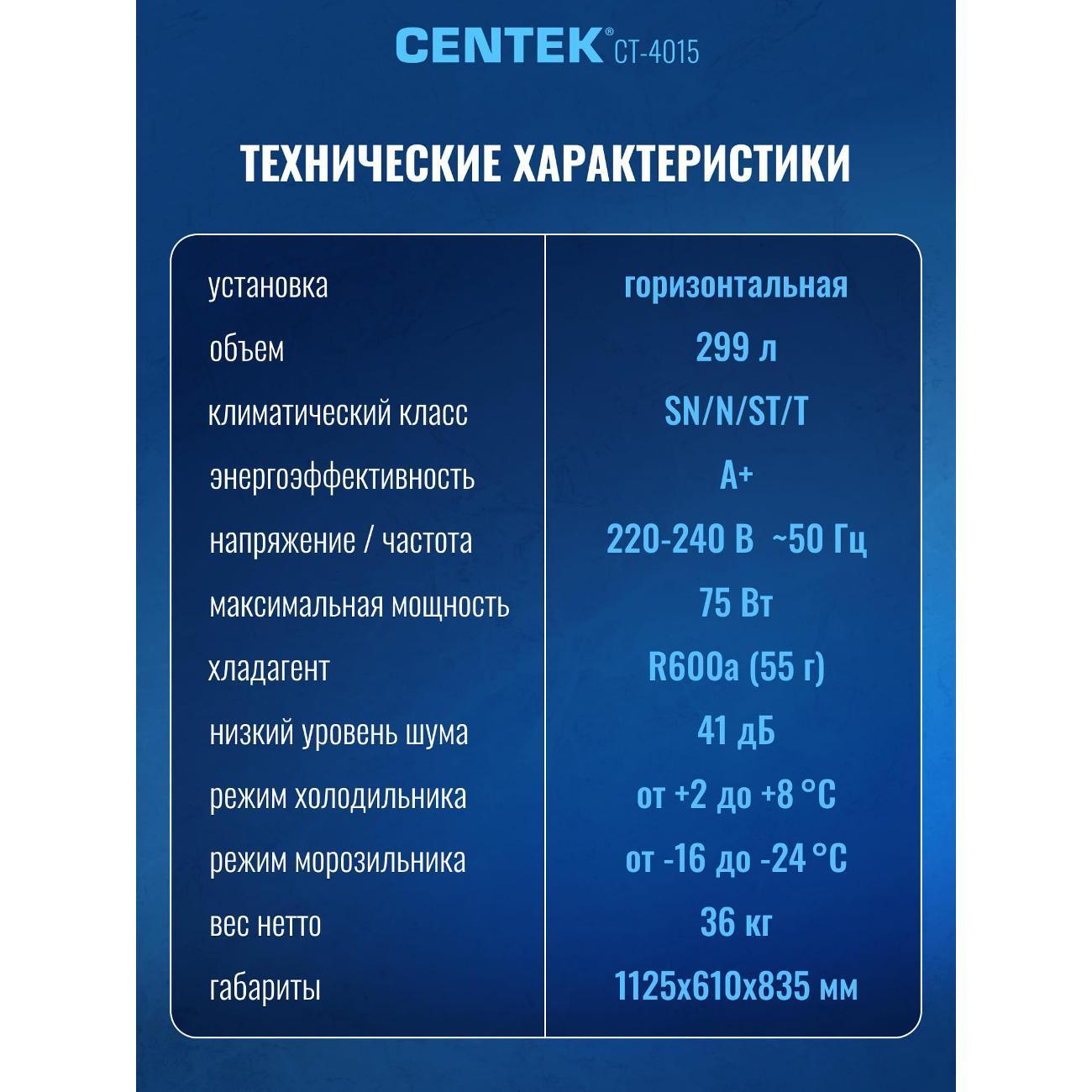 Вы можете купить Морозильный ларь Centek CT-4015 в магазинах М.Видео по доступной цене. Морозильный ларь Centek CT-4015: подробное описание, фото и отзывы реальных покупателей, характеристики, возможность скачать инструкции и подобрать аксессуары.