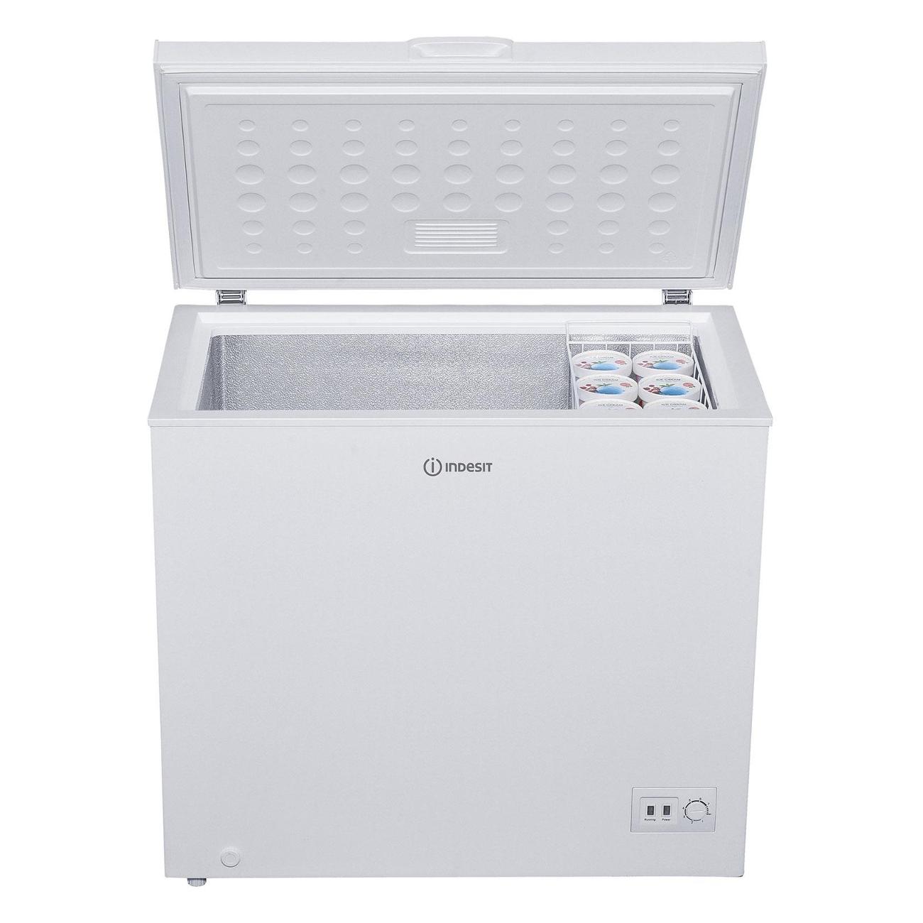 Морозильный ларь Indesit IСF 200 выполнен в белом цвете с пластиково-металлической дверцей с внутренней ручкой, открывается вверх. Механическое управление представлено поворотным регулятором (восемь положений заморозки) и световым индикатором включения.